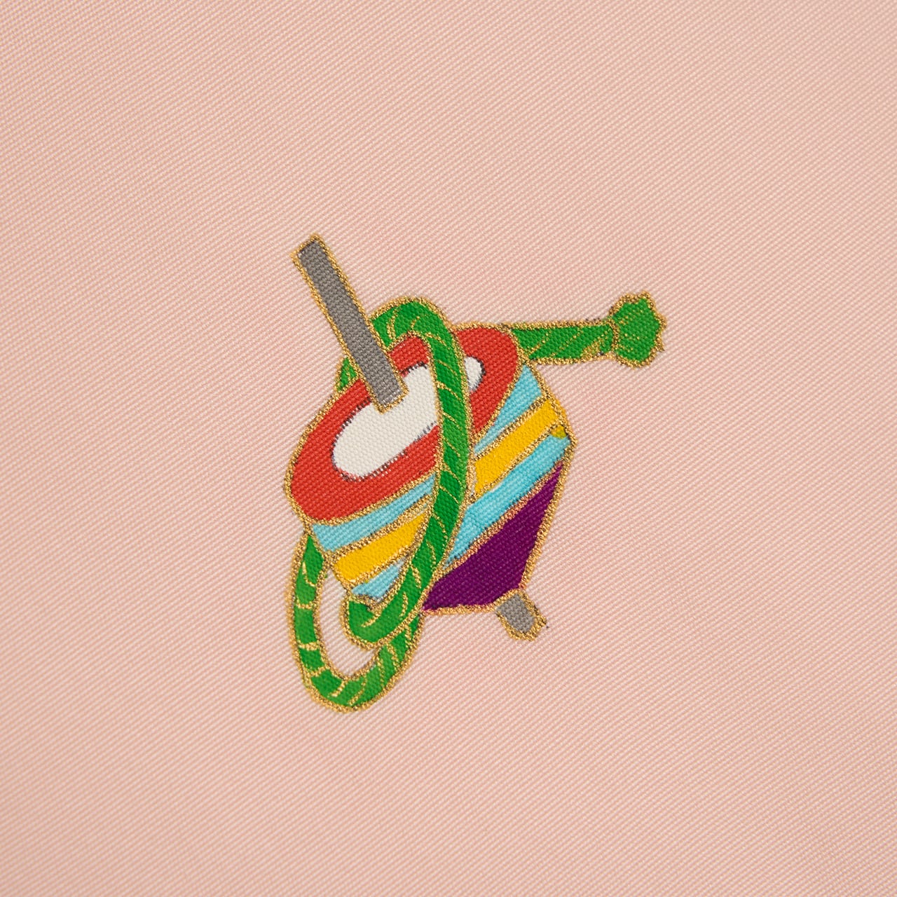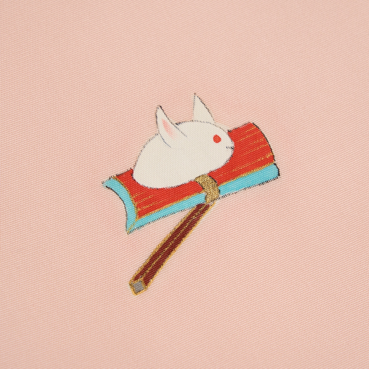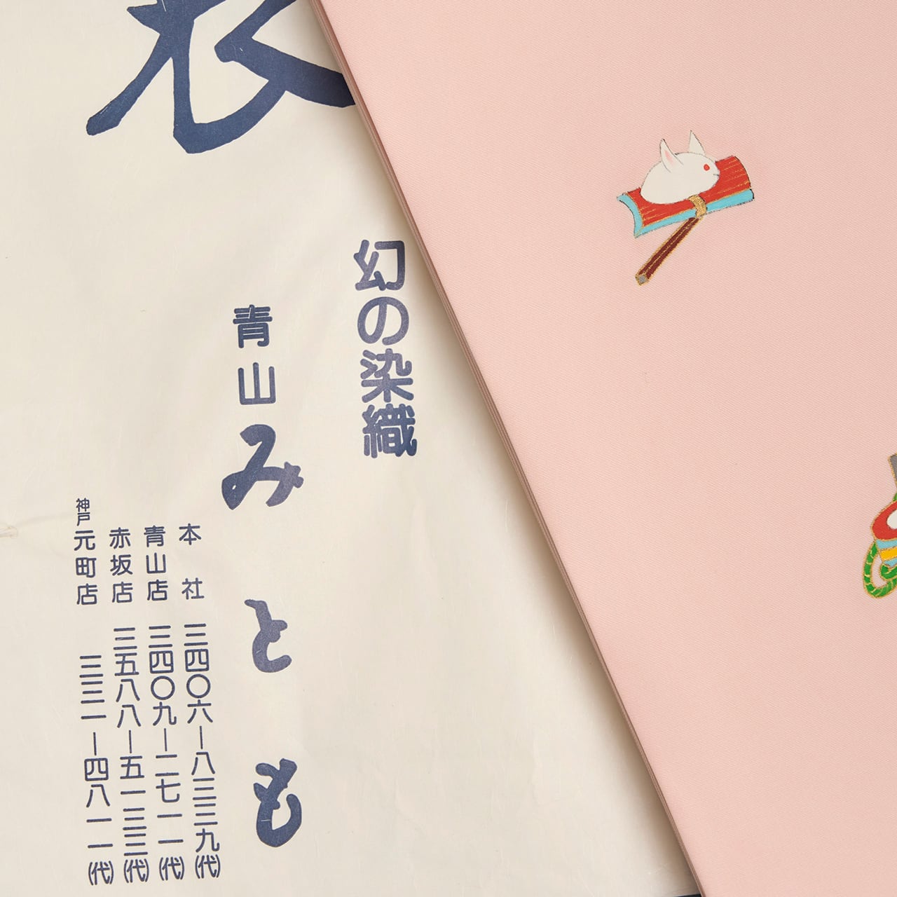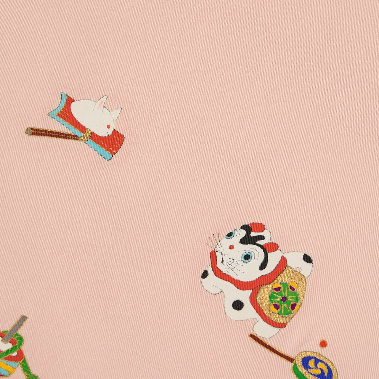 淡いピンク・虹色のしっかりとした塩瀬の生地に、お太鼓にはうさぎや犬張子にデンデン太鼓、独楽などの玩具が並べられた様子が手描きの友禅で描かれた、とても和やかな雰囲気の九寸名古屋帯です。