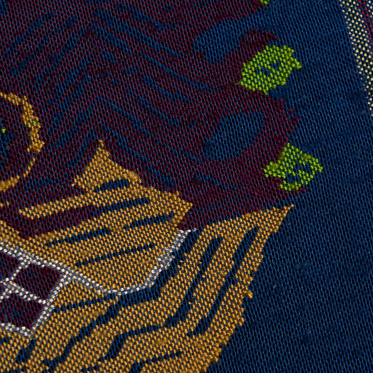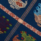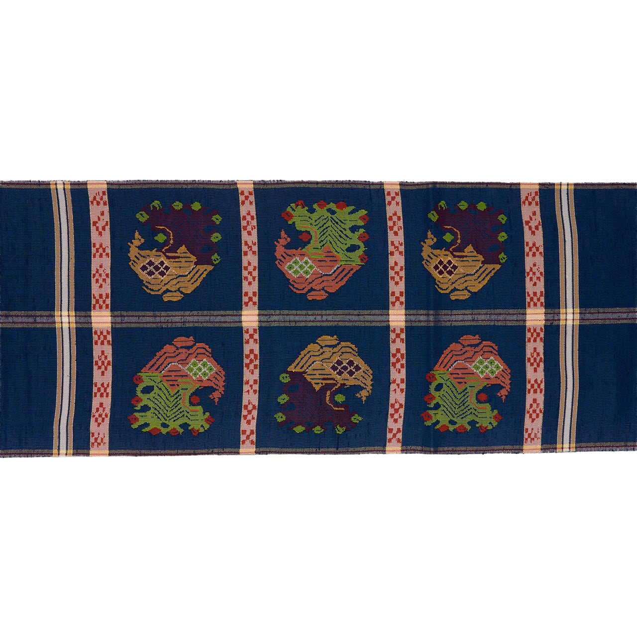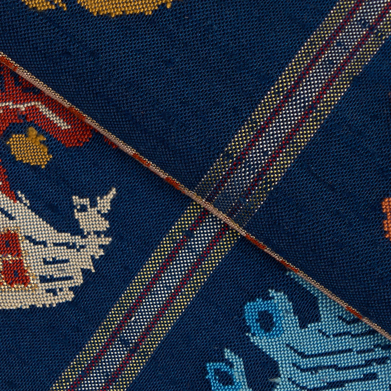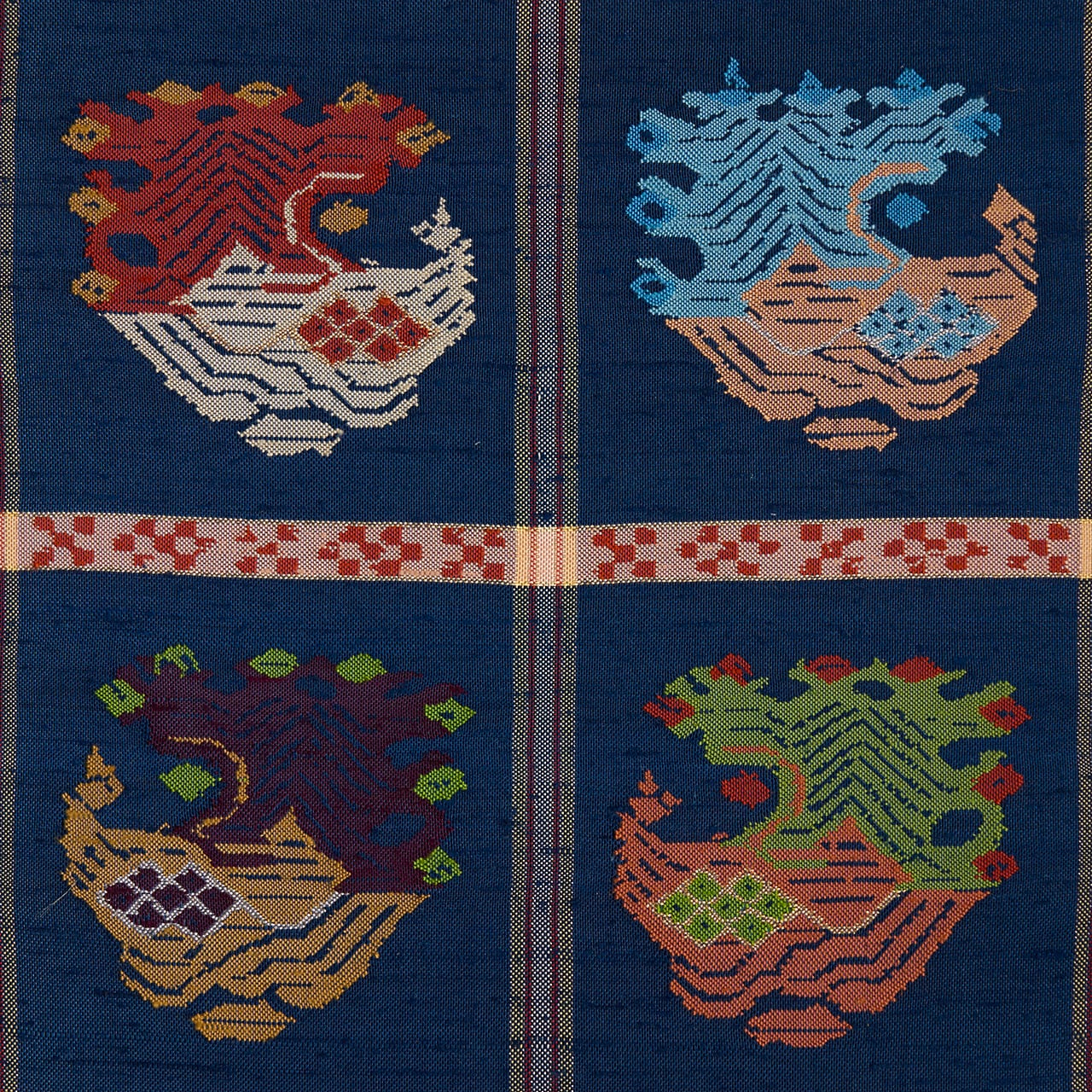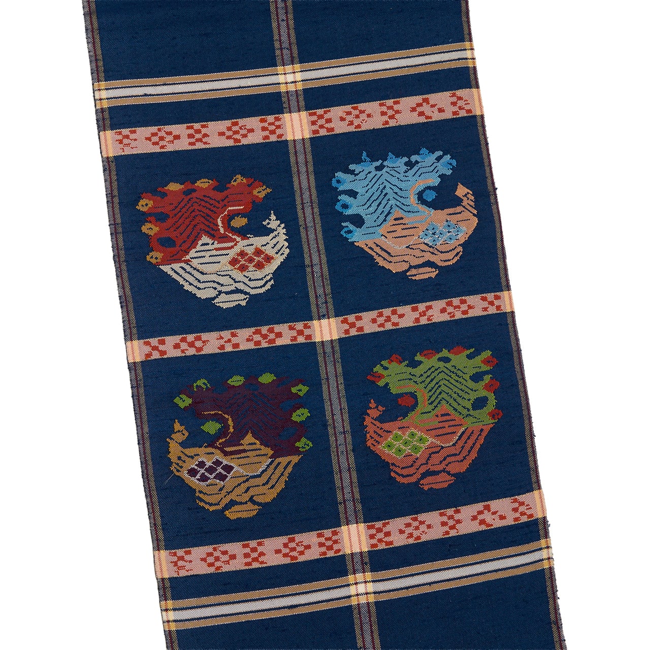 濃い藍・深縹色の紬地に、大きく紅梅色と榛色などで格子が取られ、その中に独創的なデザインの孔雀の模様が何色もの糸を使って織り込まれています。