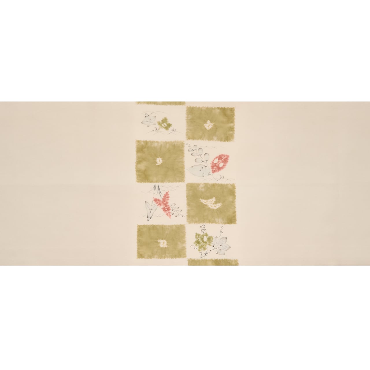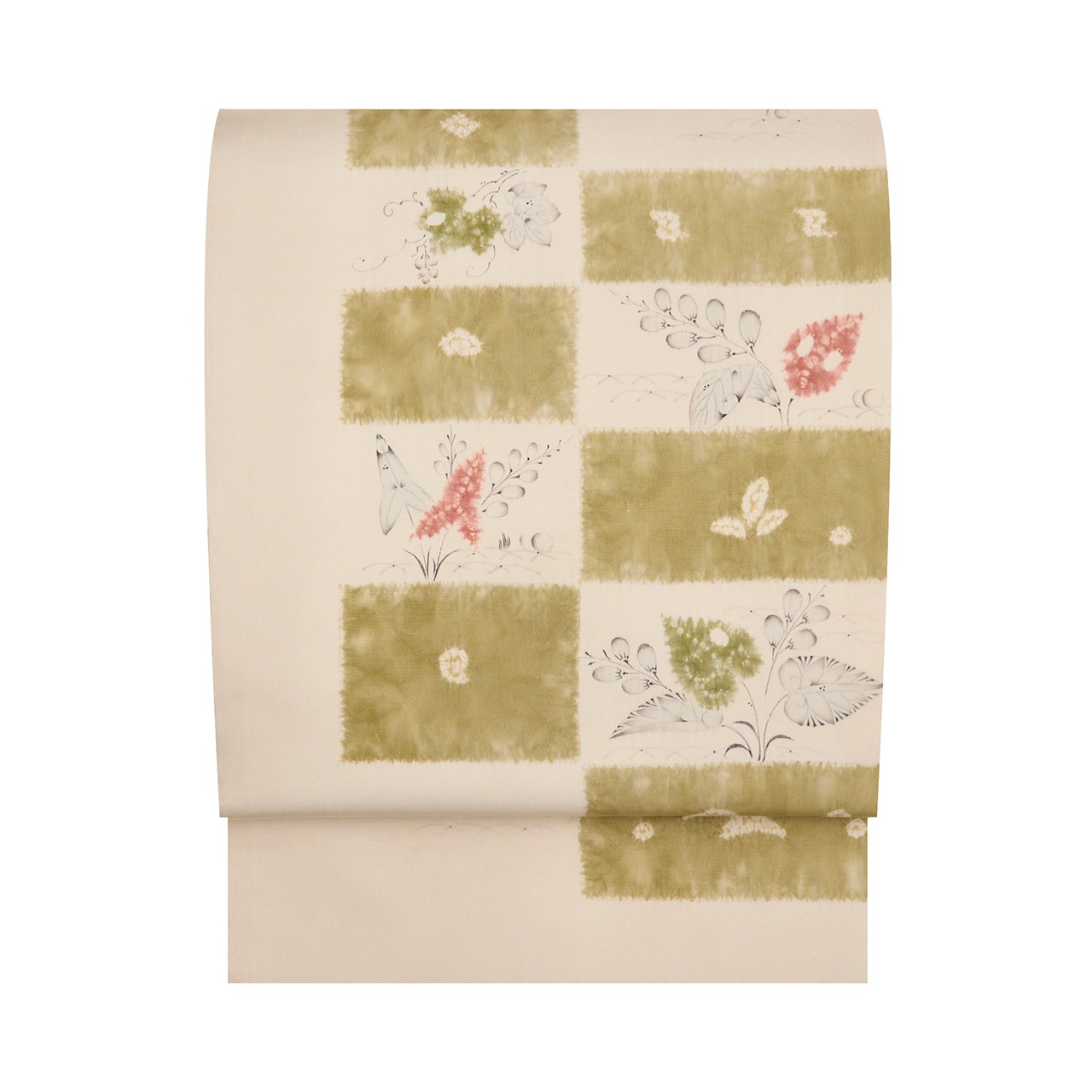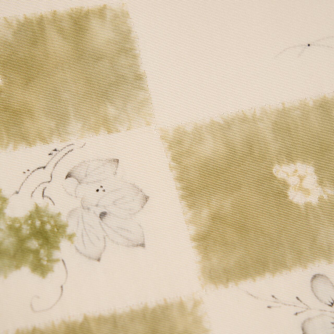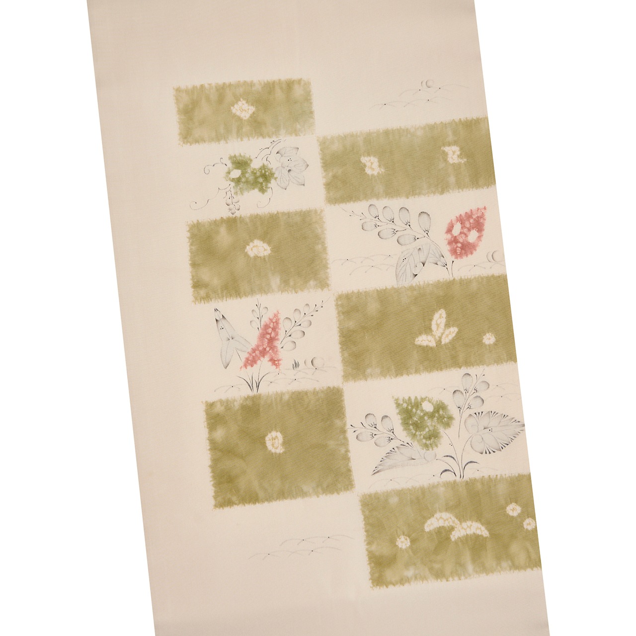 象牙色のしなやかな塩瀬の生地のお太鼓に大きく市松が取られ、一方には絞り染めで青丹色の草色が、もう一方には絞り染めで草の葉が染められ、墨でも草の葉や花などが描かれた、とても素敵な雰囲気の辻が花染めの九寸の開名古屋帯です。