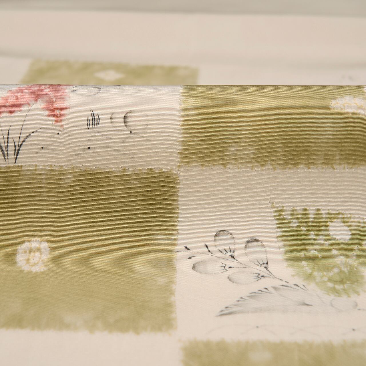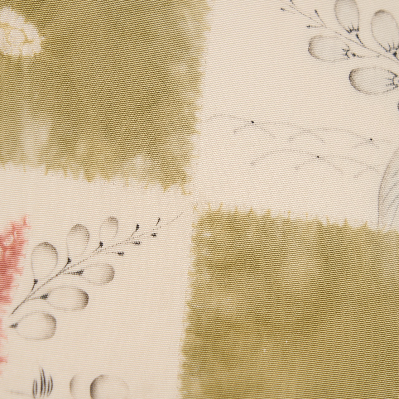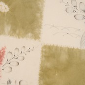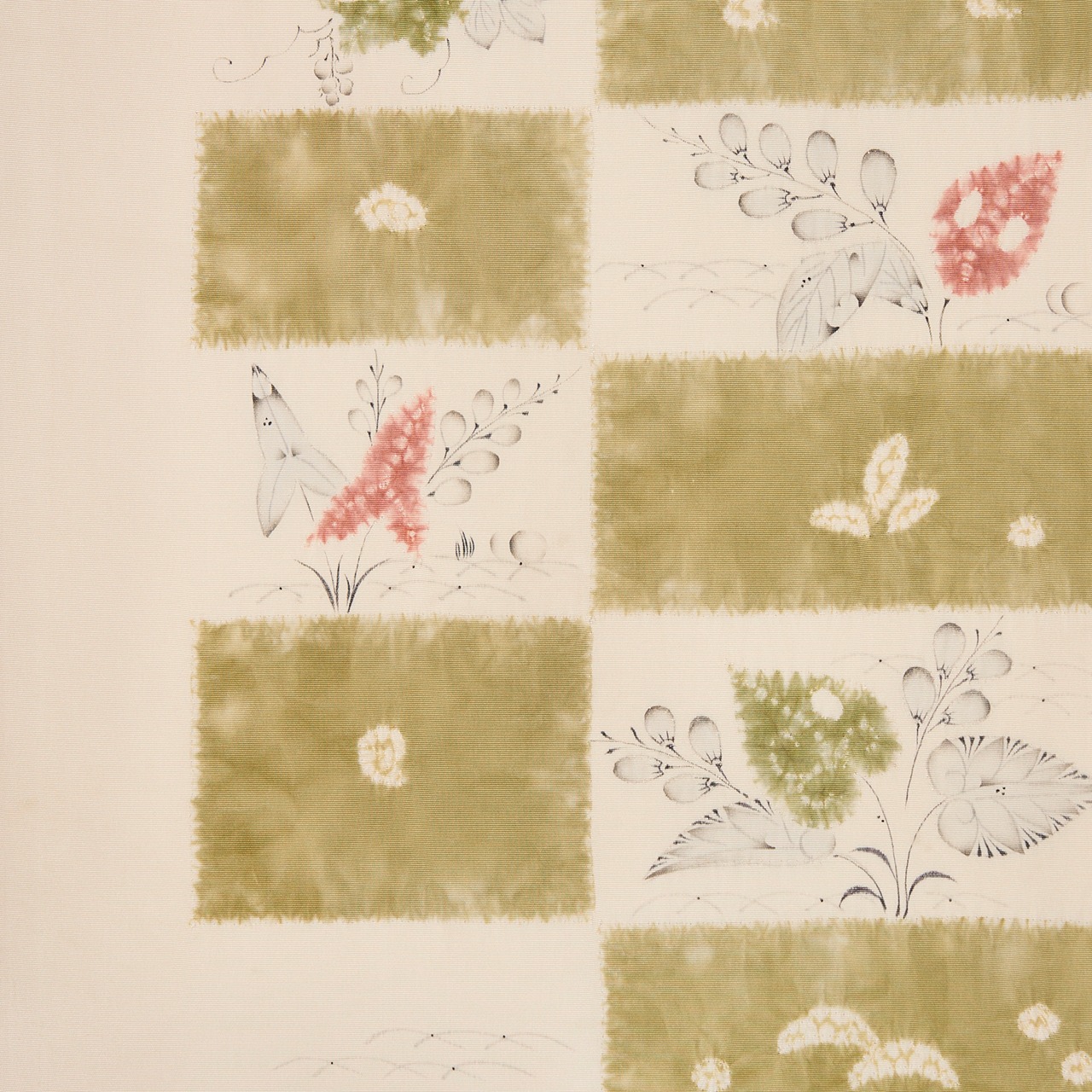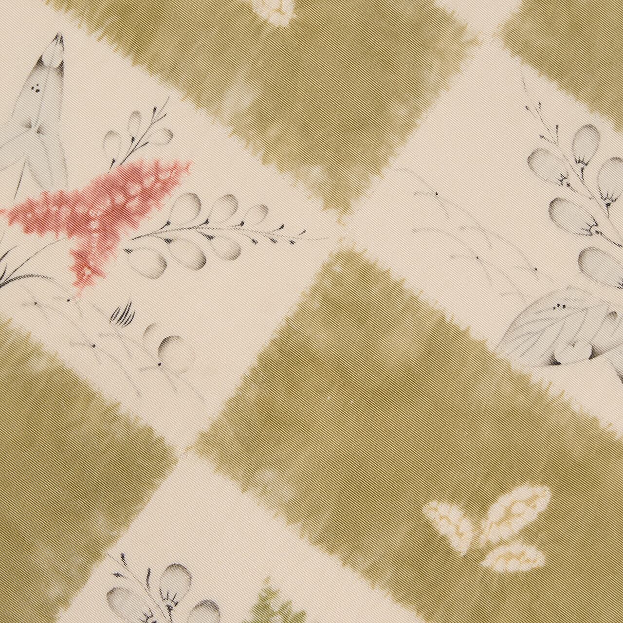 象牙色のしなやかな塩瀬の生地のお太鼓に大きく市松が取られ、一方には絞り染めで青丹色の草色が、もう一方には絞り染めで草の葉が染められ、墨でも草の葉や花などが描かれた、とても素敵な雰囲気の辻が花染めの九寸の開名古屋帯です。
