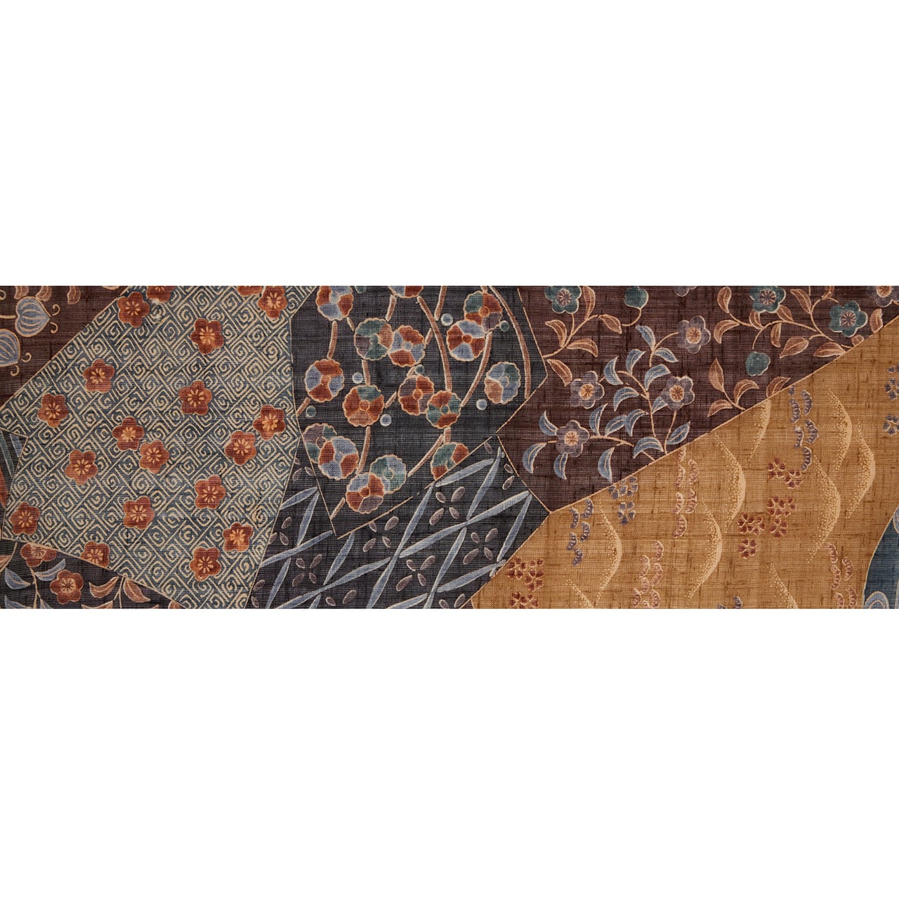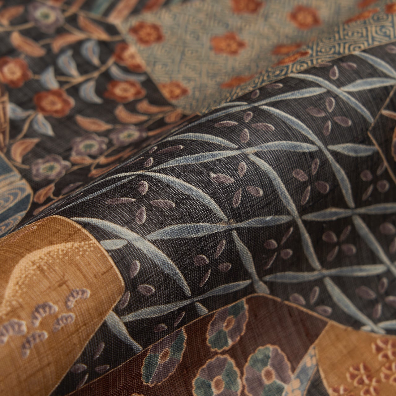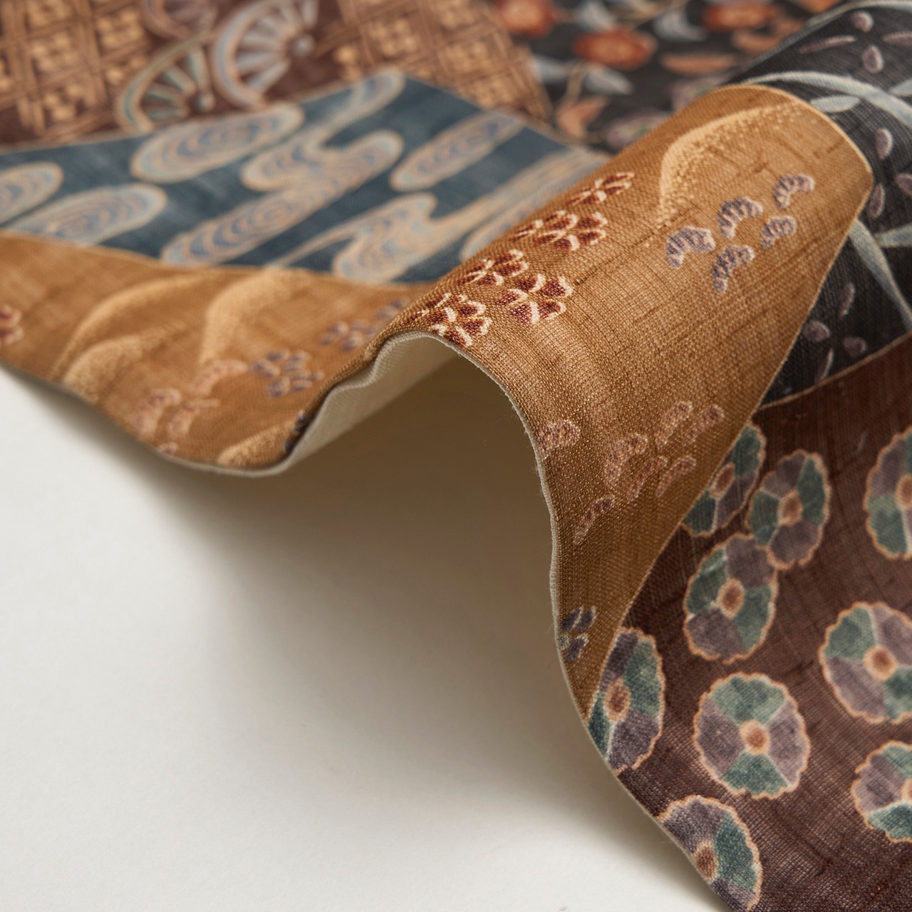 シャリっとした張りのある質感の、多ち花さんでよく使われる生紬の生地が裂取りの模様に区切られ、櫨色の茶色、憲法色の焦げ茶、錆御納戸色のグレー、黒などに染め分けられ、その中には流水や源氏車、露芝に撫子のお花、遠山に桜、縞といった調子に様々な小紋の模様が染められた、シックな色調がとてもお洒落な九寸名古屋帯です。