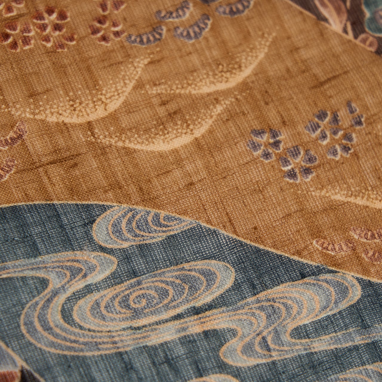 濃い目の色を使って摺型友禅で染められていますが、生地の特性からかあまり強い発色ではなく、柔らかい色調となっています。