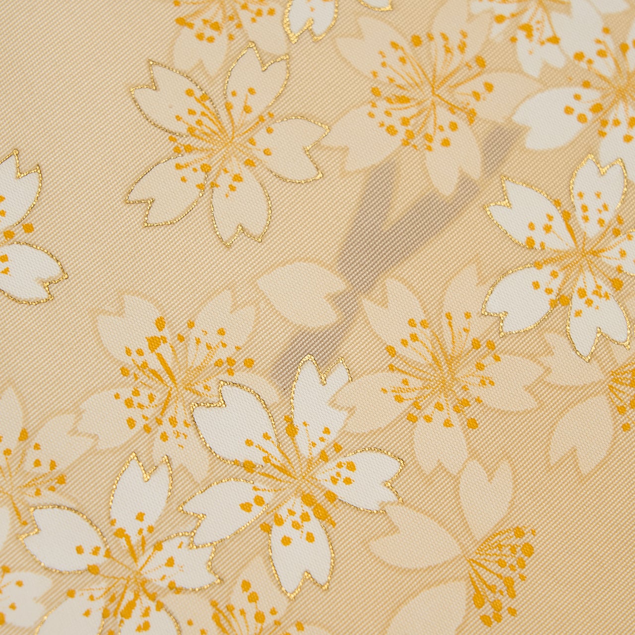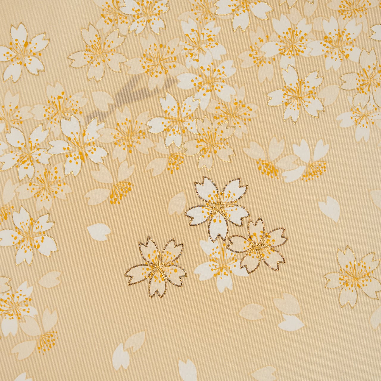 少しだけオレンジ味の感じられる黄色・砥粉色のしっかりとした塩瀬の生地に、お太鼓には満開に咲く桜のお花が胡粉色で陰影をつけて描かれ、中心には蜂蜜色の暈しが加えられ、ところどころに金彩で縁取りがされたり、金駒刺繍が施されたりした、ボリューム感のあるとても素敵な九寸名古屋帯です。
