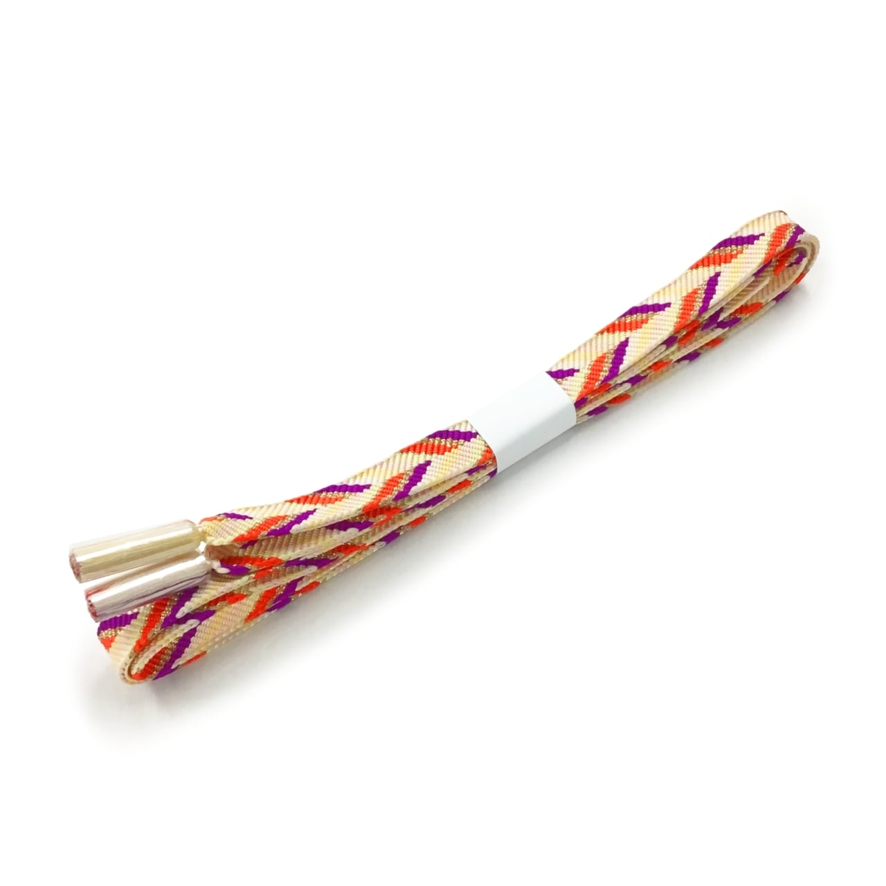 色味は、象牙色地に明るい紫紺色、金糸、朱色、白緑色、桜色が矢羽根柄で組まれています。