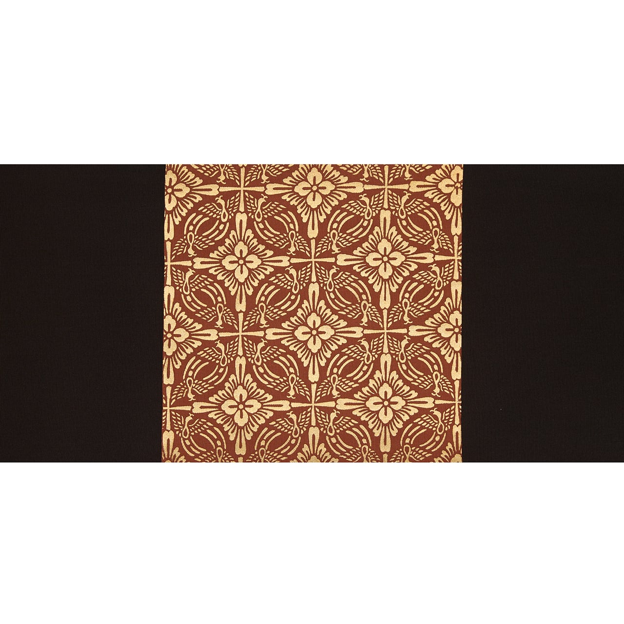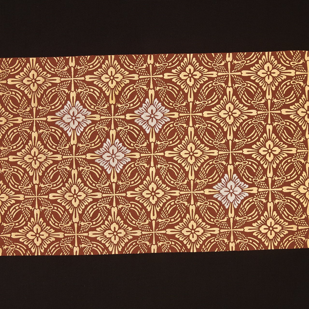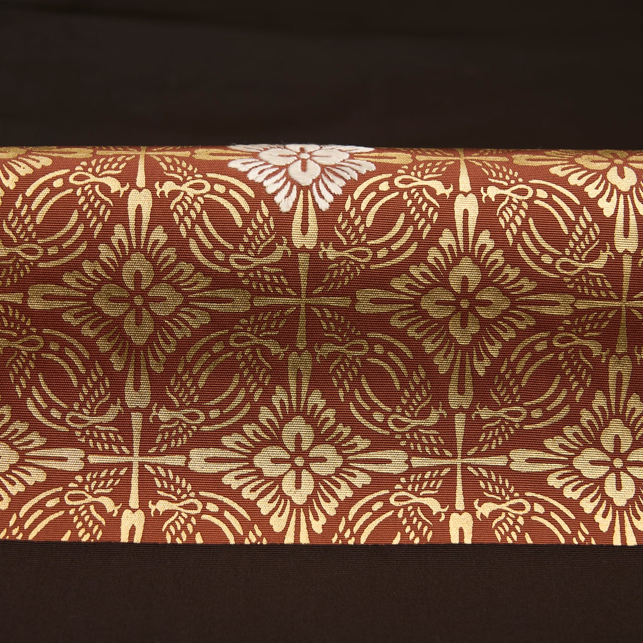 黒のしっかりとしながらもしなやかさのある塩瀬の生地のお太鼓に褐色の段が取られ、それに有職文様の鳥襷文が摺り金の技法で染められ、部分的には生成り色の糸で手刺繍が施された、格調高さの感じられる素敵な九寸名古屋帯です。