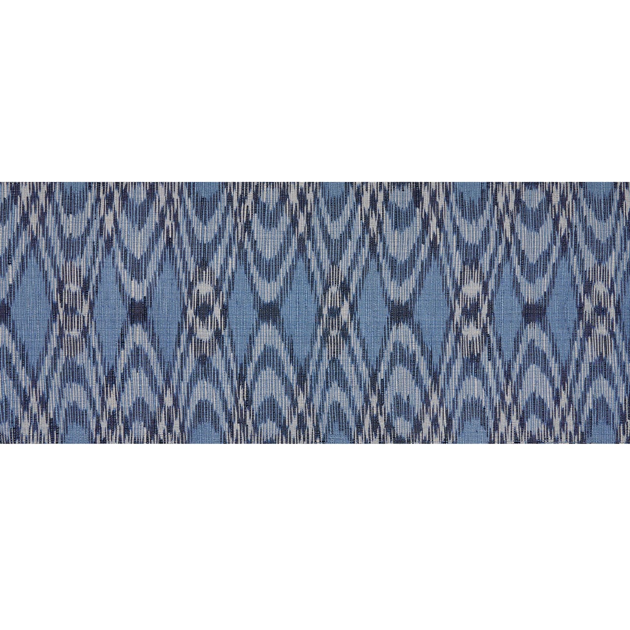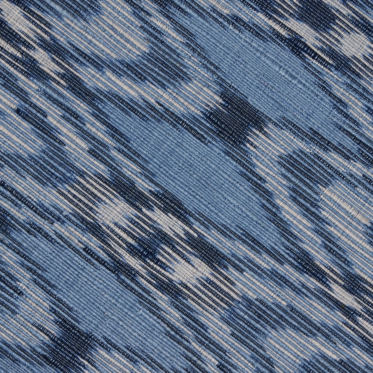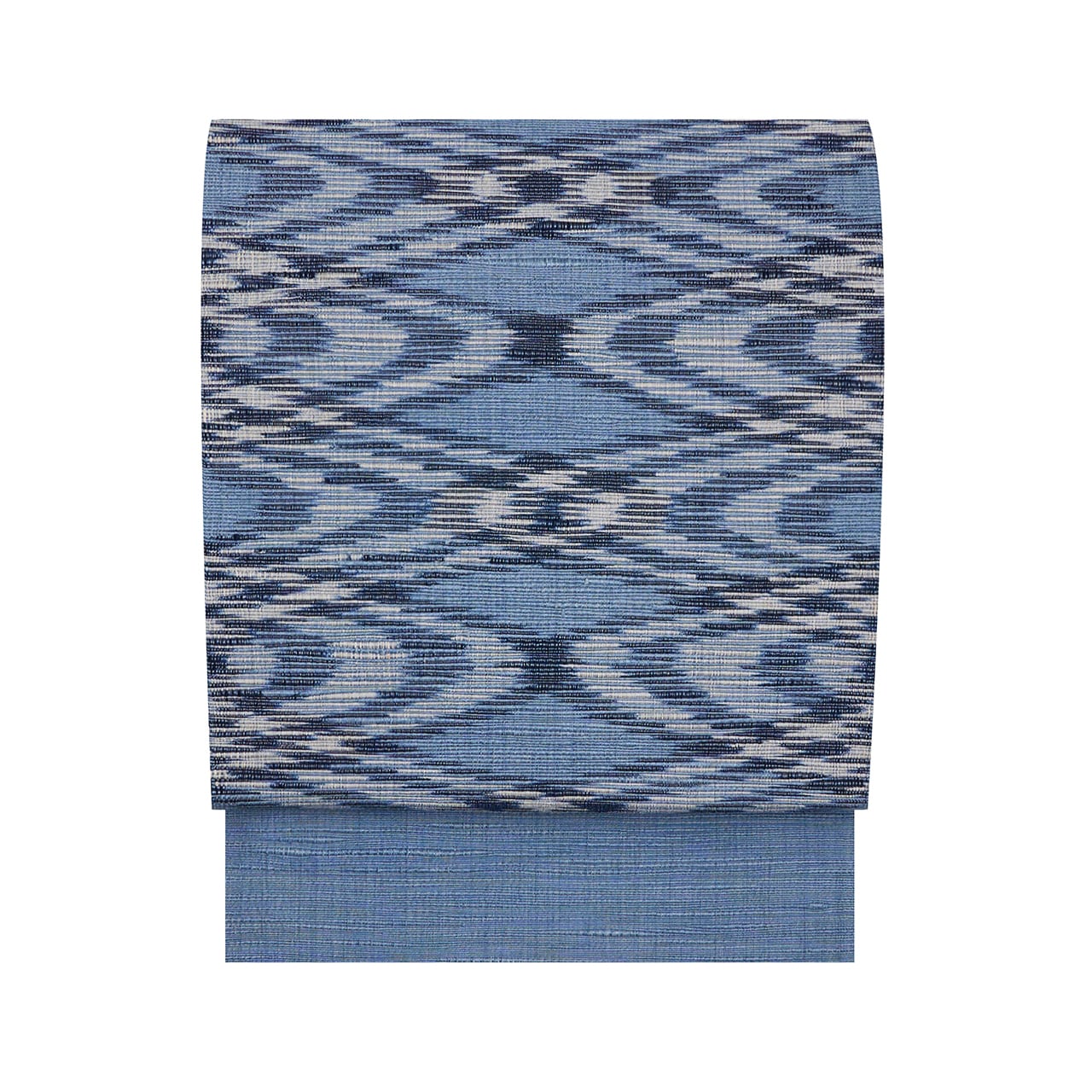 明るい藍染めの澄んだ青・薄花色の地に、変り立涌のような絣模様が、浅縹色と濃い藍・深縹などの藍の濃淡で織り出された、裂き織風の味わいのある八寸名古屋帯です。