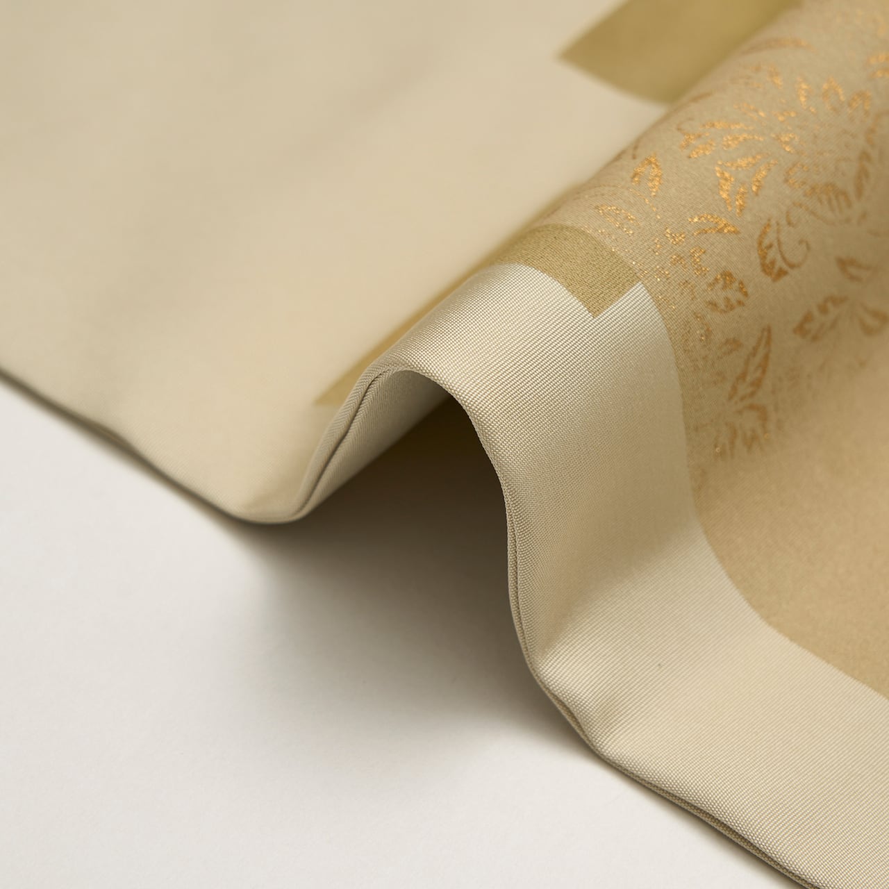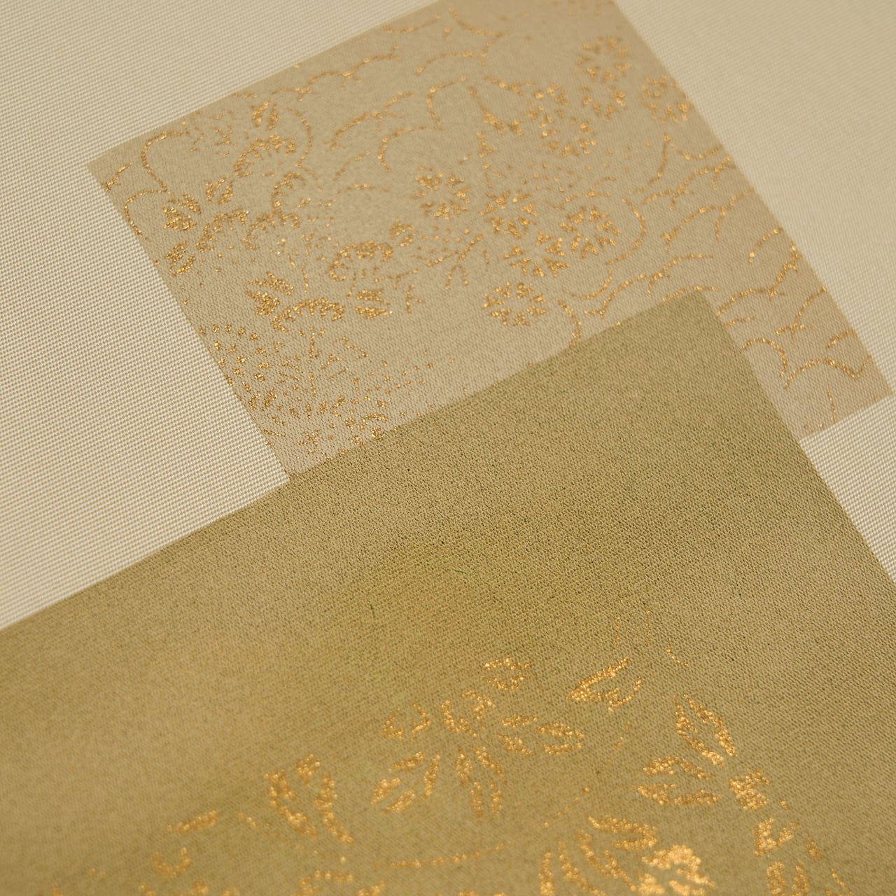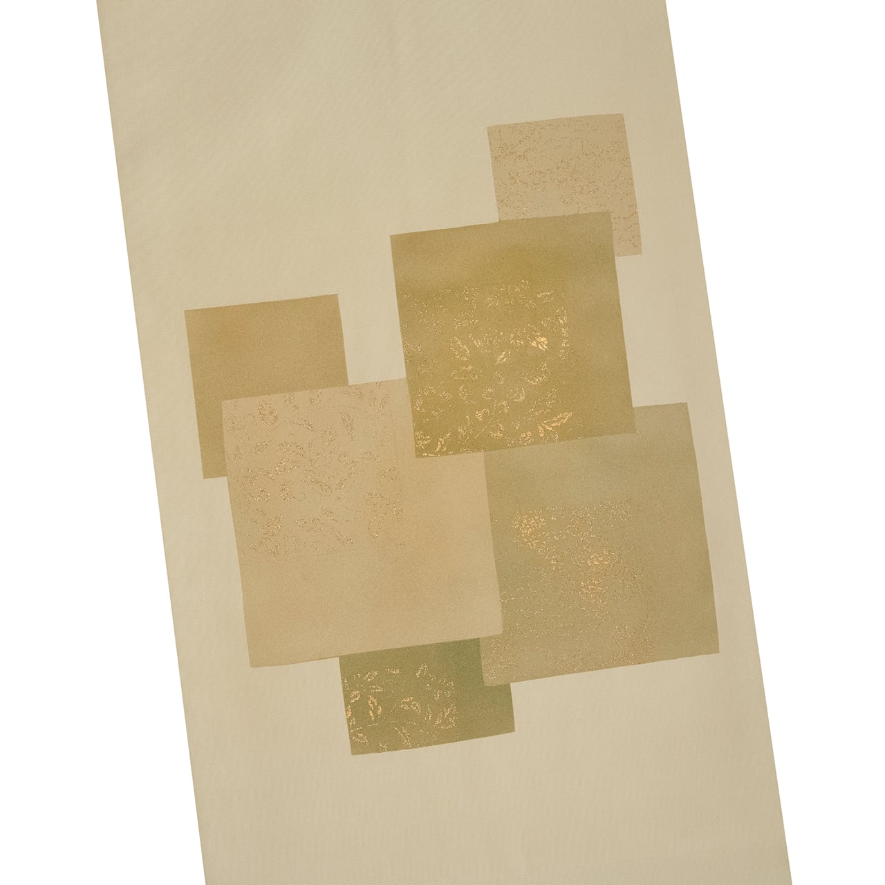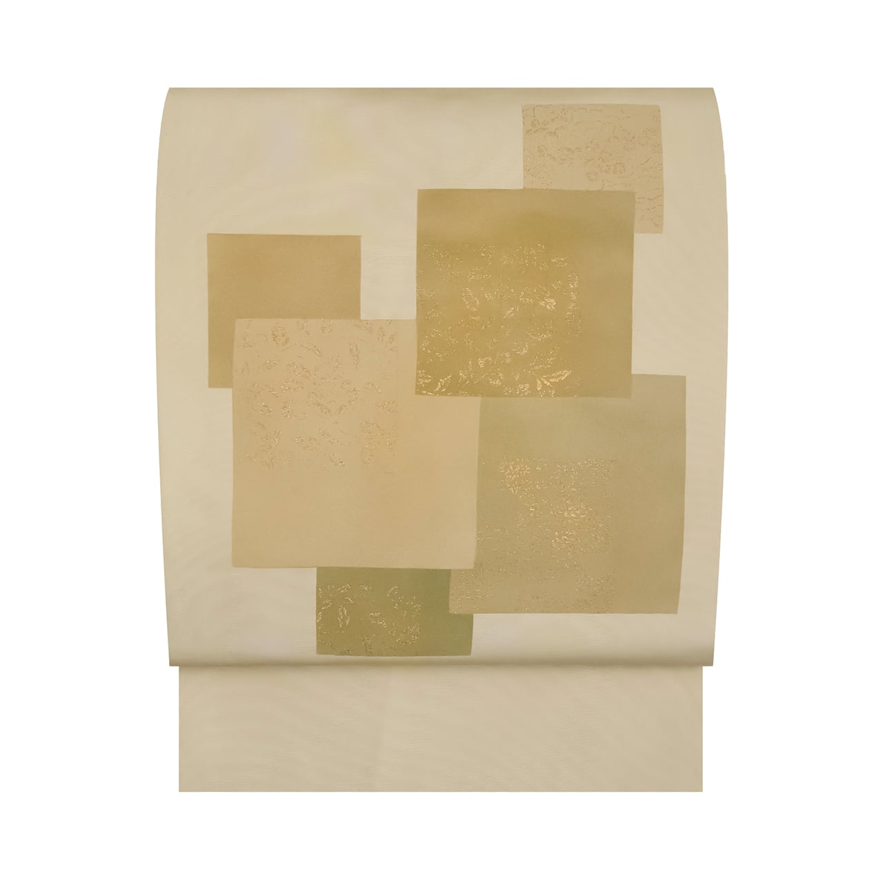 淡いベージュ・亜麻色のしなやかさのある塩瀬の生地に、お太鼓には何枚かの色紙が重なるように取られ、それぞれが利休色や白橡色、鶸茶色などに染められ、かすれるように草花の模様が金彩で染められた、気品の感じられる素敵な九寸名古屋帯です。