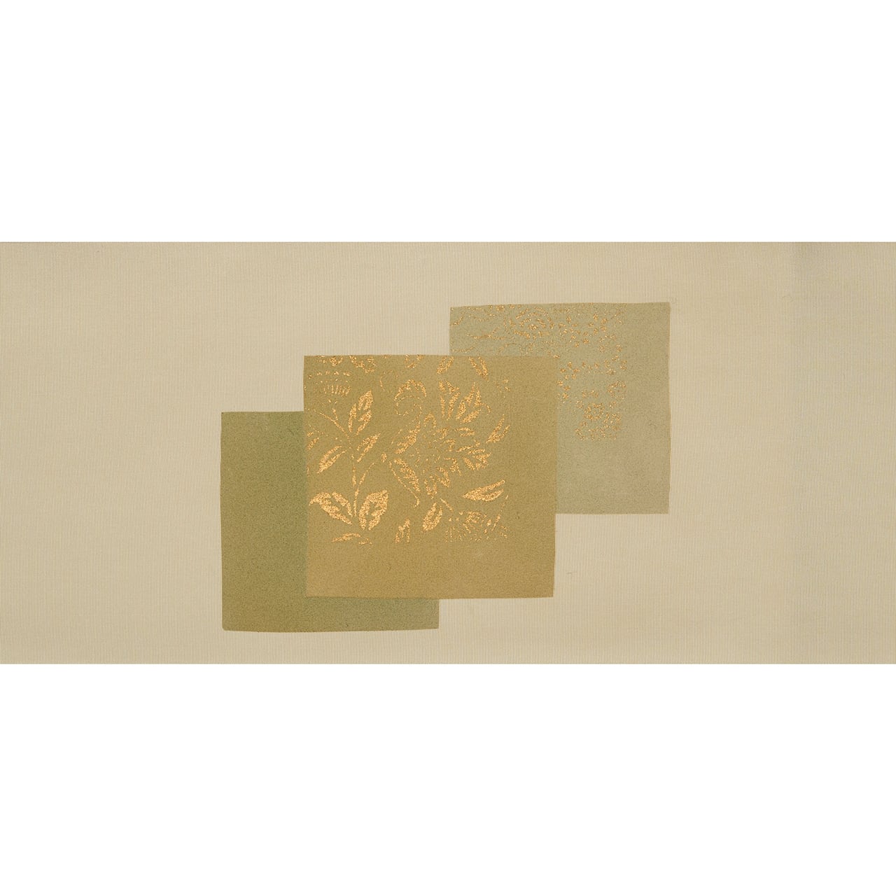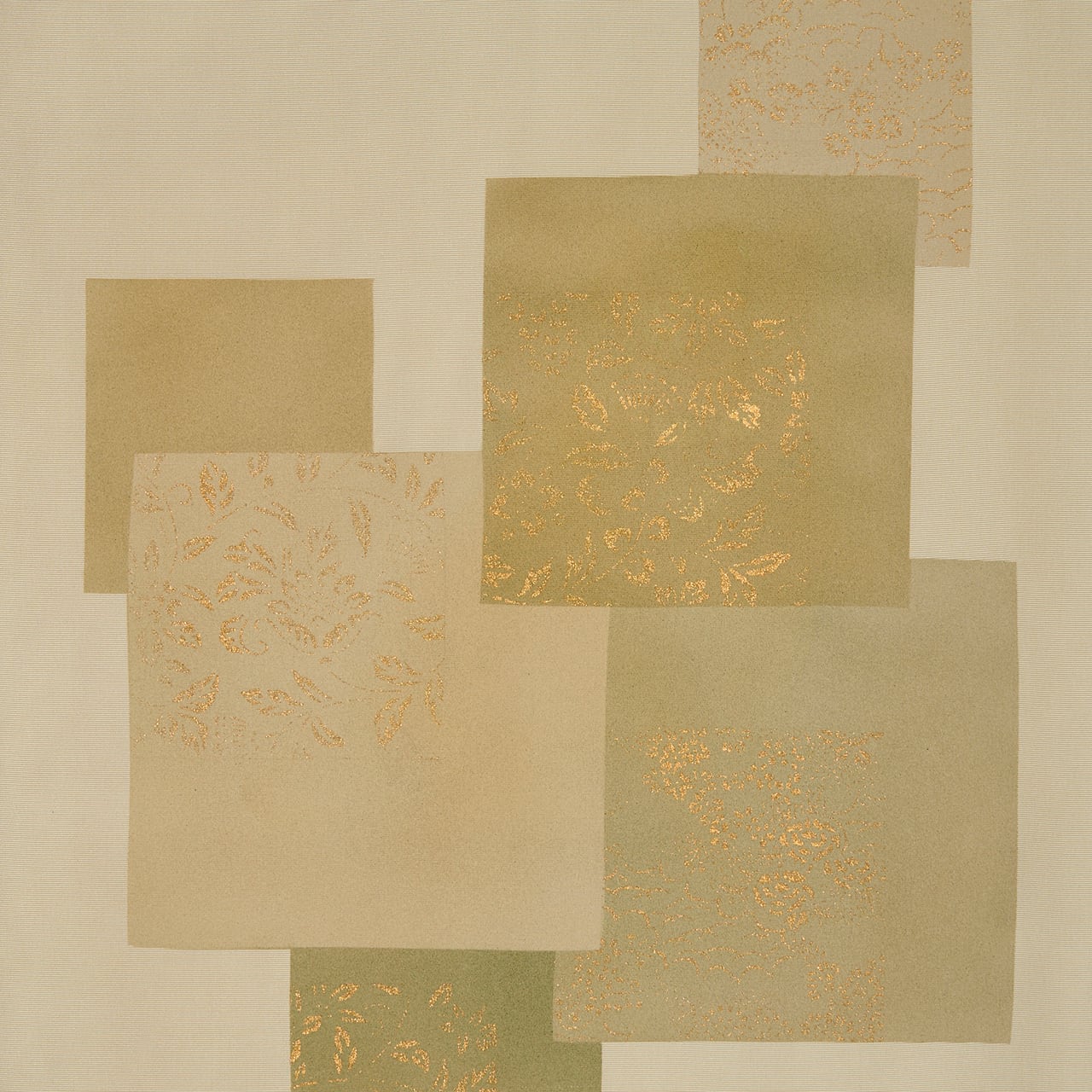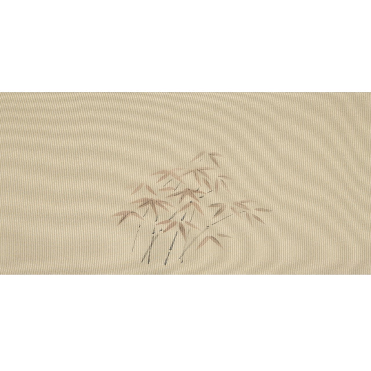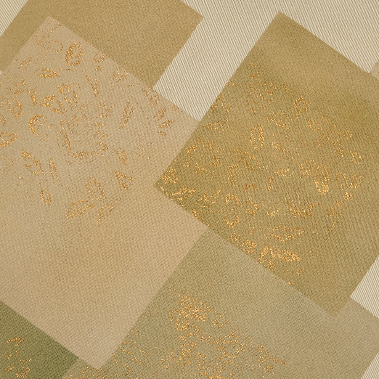 淡いベージュ・亜麻色のしなやかさのある塩瀬の生地に、お太鼓には何枚かの色紙が重なるように取られ、それぞれが利休色や白橡色、鶸茶色などに染められ、かすれるように草花の模様が金彩で染められた、気品の感じられる素敵な九寸名古屋帯です。