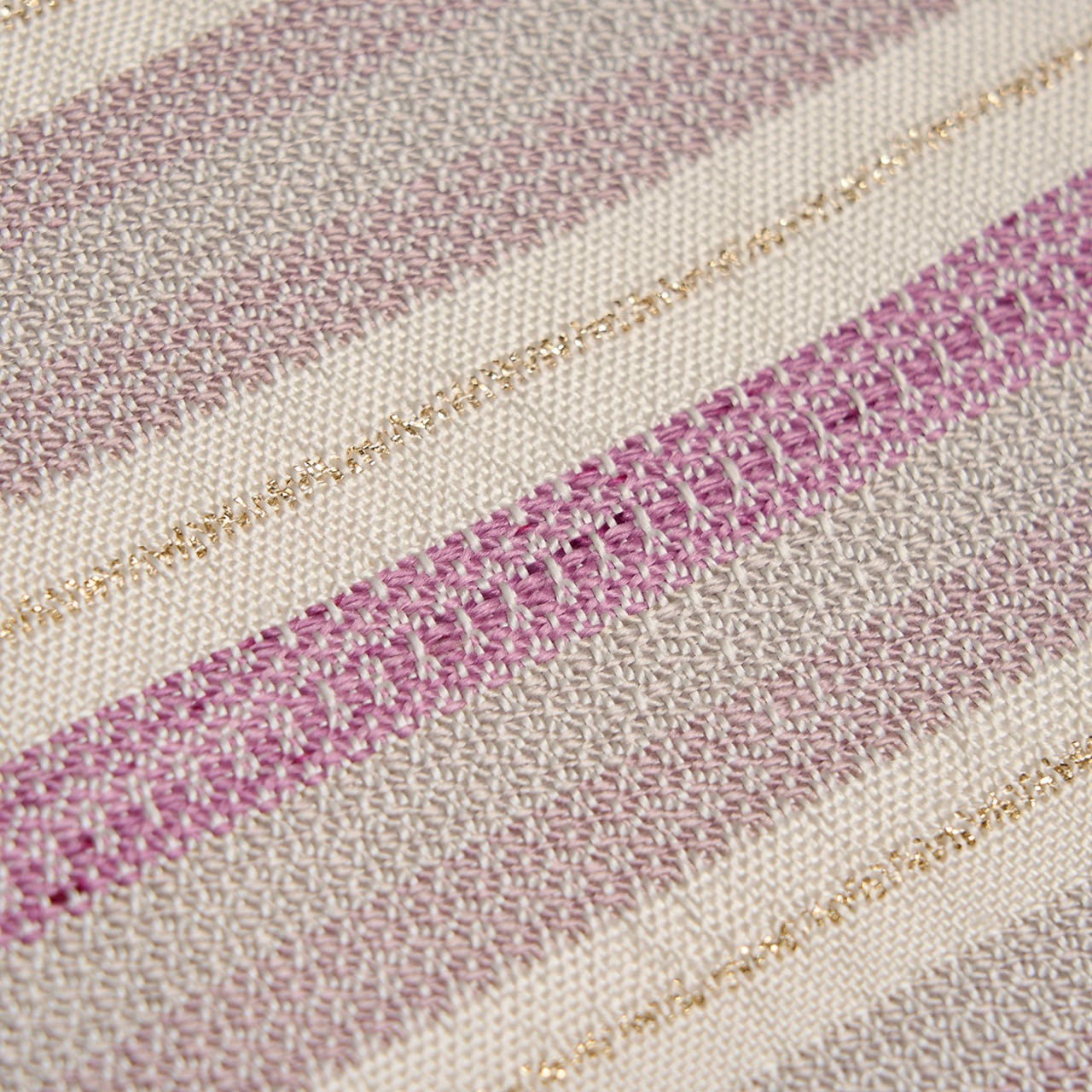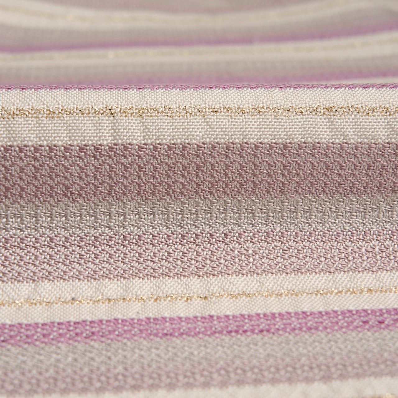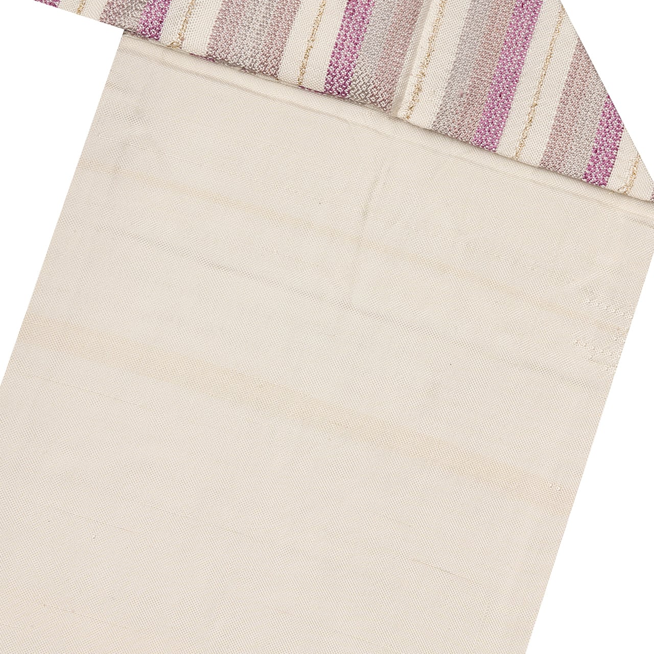 象牙色のしっとりとした手触りの良い生地に、段変わりに、薄鈍色の淡いグレーから、やや赤紫がっかったグレー・薄梅鼠色、そして梅紫色がグラデーションで並び、黄八丈などに見られるまるまなこのような変り織が織られ、象牙色の段には非常に細やかな金の糸で横縞のような変り織が入れられた、工芸的な良さの感じられる素敵な九寸名古屋帯です。