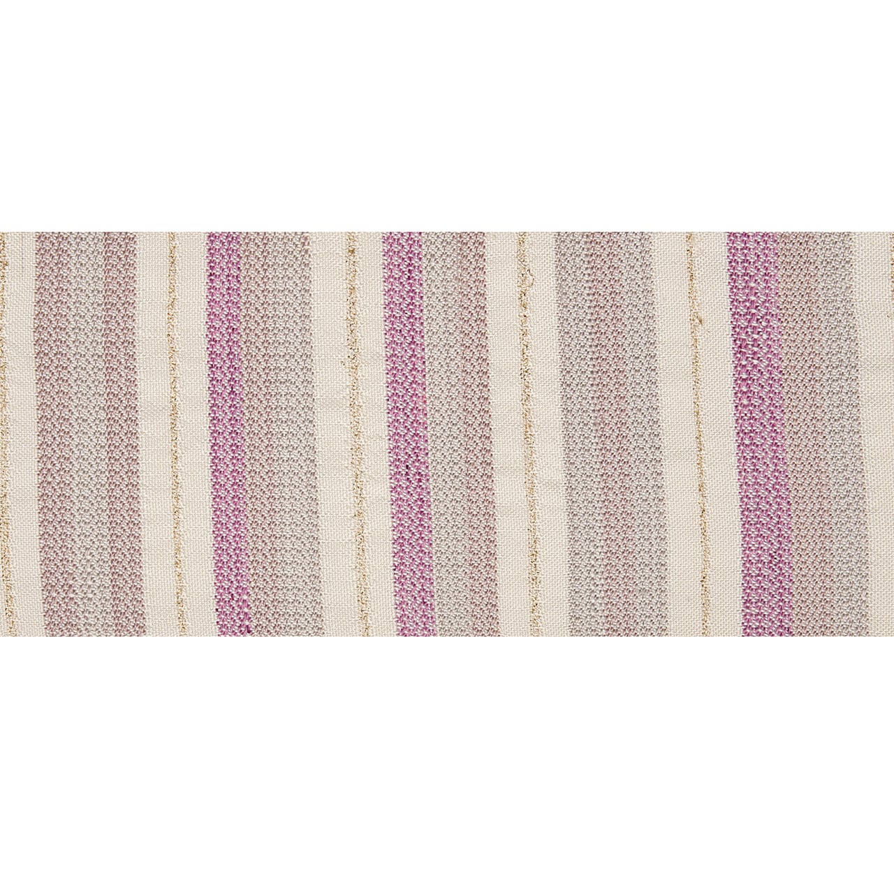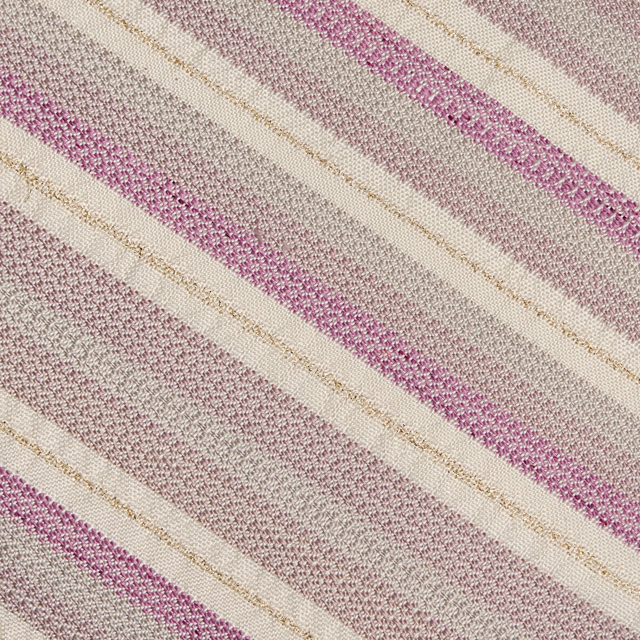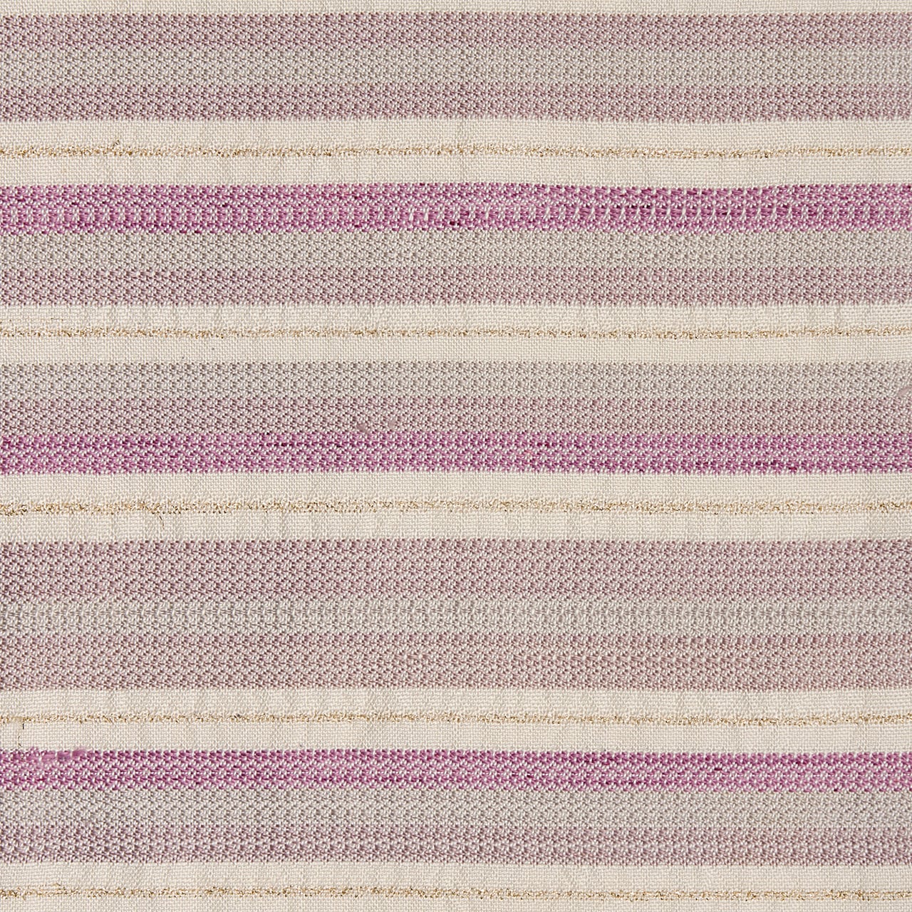 象牙色のしっとりとした手触りの良い生地に、段変わりに、薄鈍色の淡いグレーから、やや赤紫がっかったグレー・薄梅鼠色、そして梅紫色がグラデーションで並び、黄八丈などに見られるまるまなこのような変り織が織られ、象牙色の段には非常に細やかな金の糸で横縞のような変り織が入れられた、工芸的な良さの感じられる素敵な九寸名古屋帯です。
