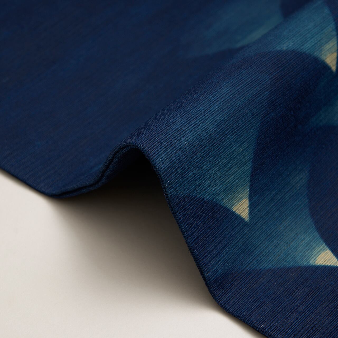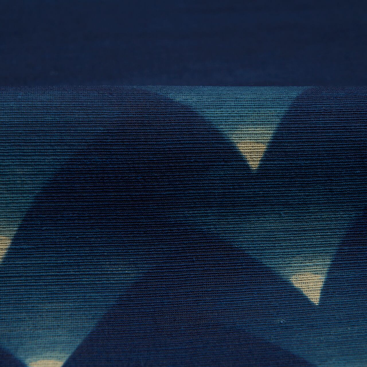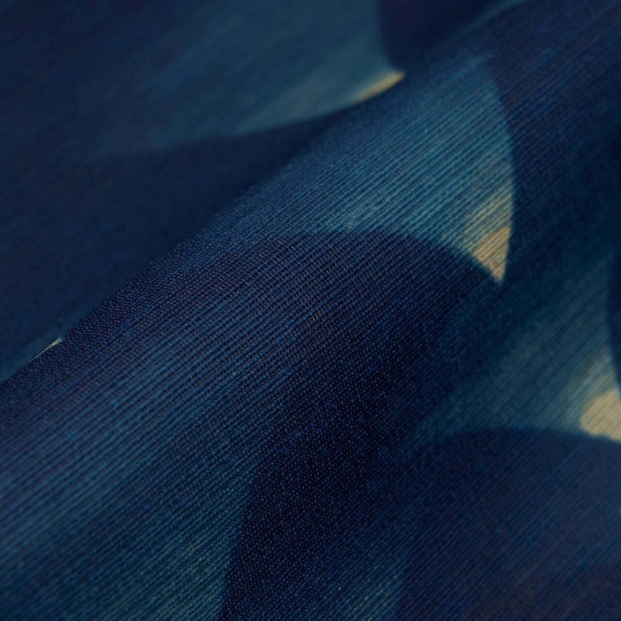 幾重にも重なる藍の濃淡が奏でる繧繝(うんげん)の染め色の妙味は素晴らしく、色相の数だけ型を取り換え、糊を置いては染めるということを何十回も繰り返し生まれてくる模様です。