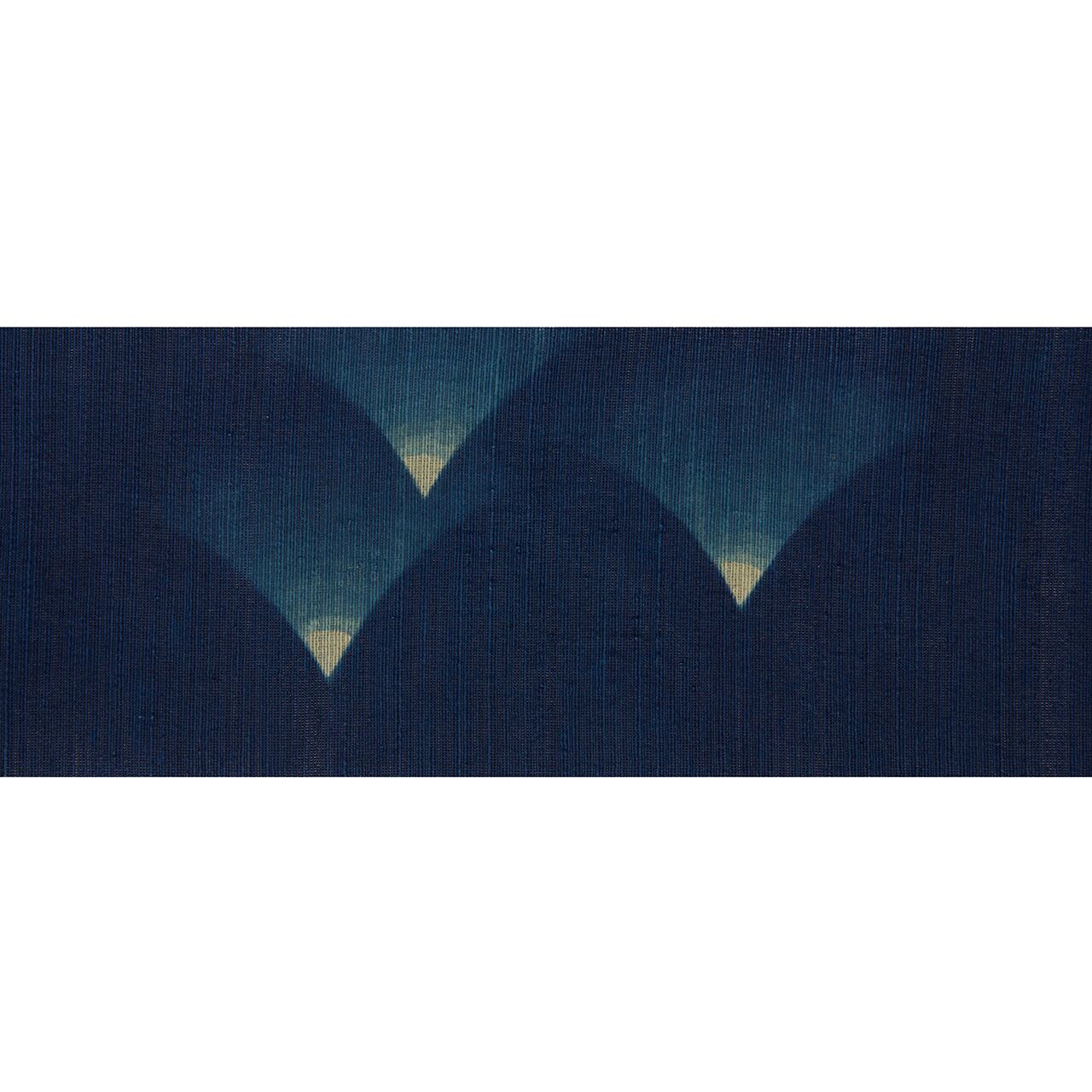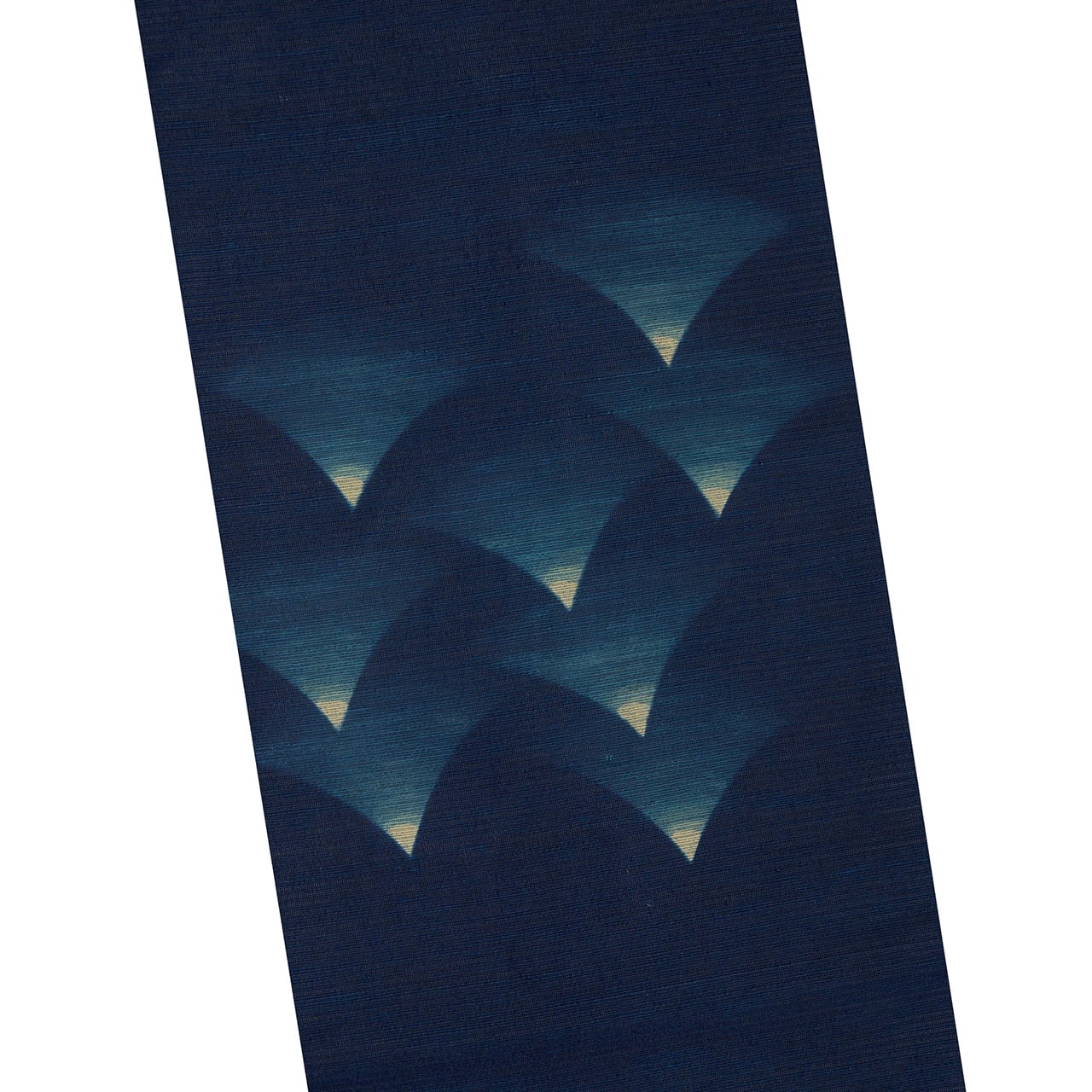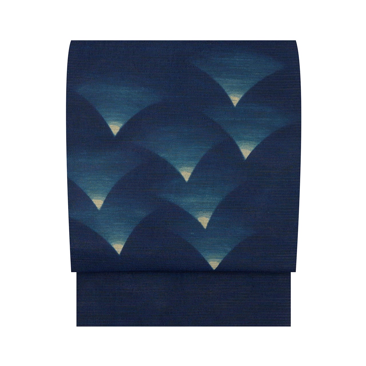 少し撚りが掛かったような強めの緯糸で織られた、シャリっとした質感の紬地に、お太鼓には扇型のような図案がグラデーションで8個染められた、不思議な陰影の感じられる、繧繝彩色藍形染の素晴らしい九寸名古屋帯の作品です。