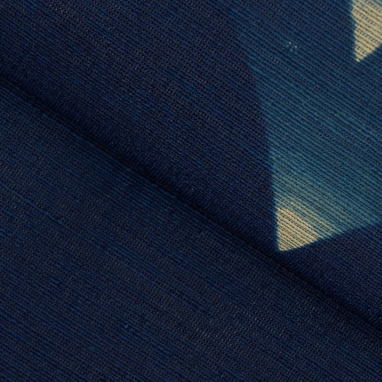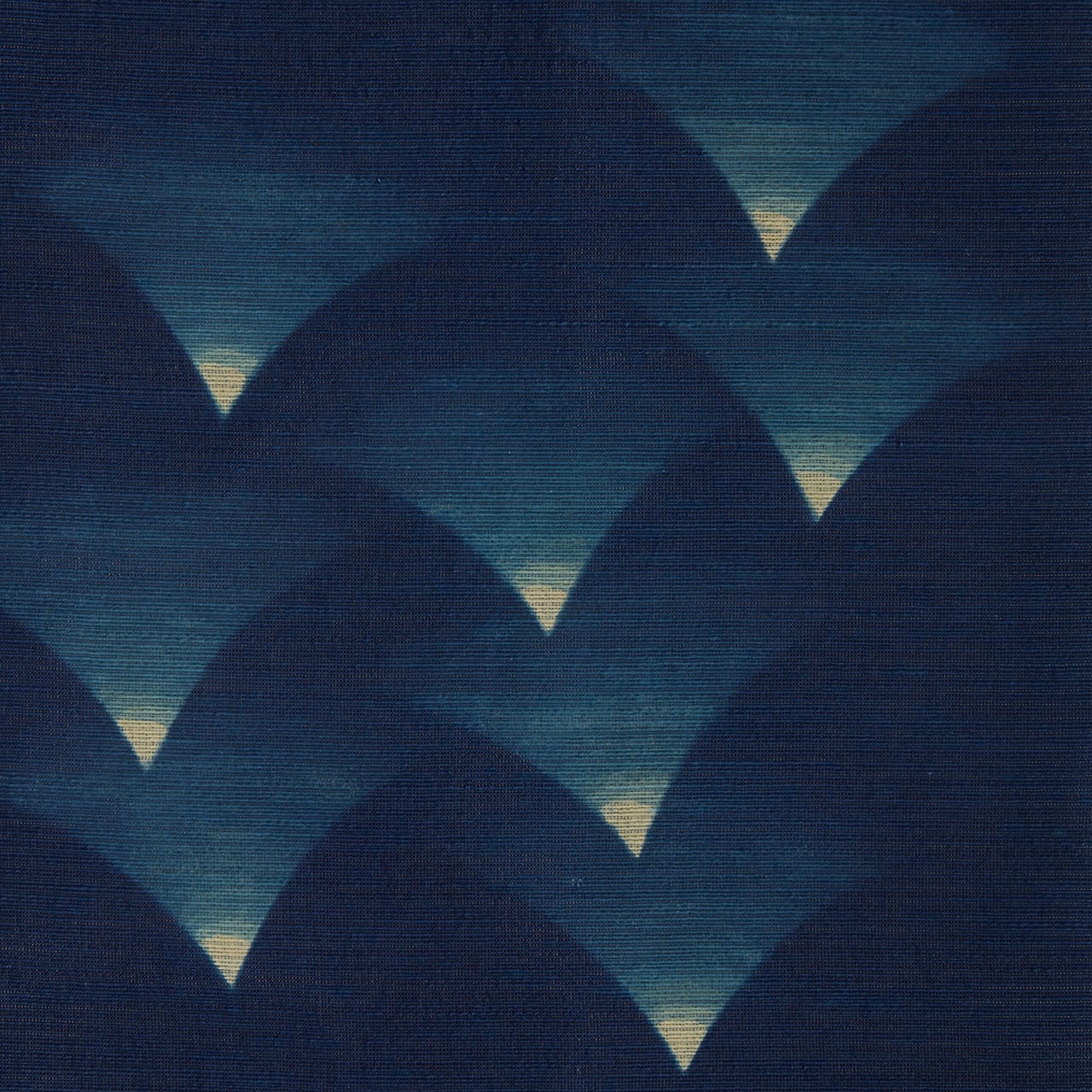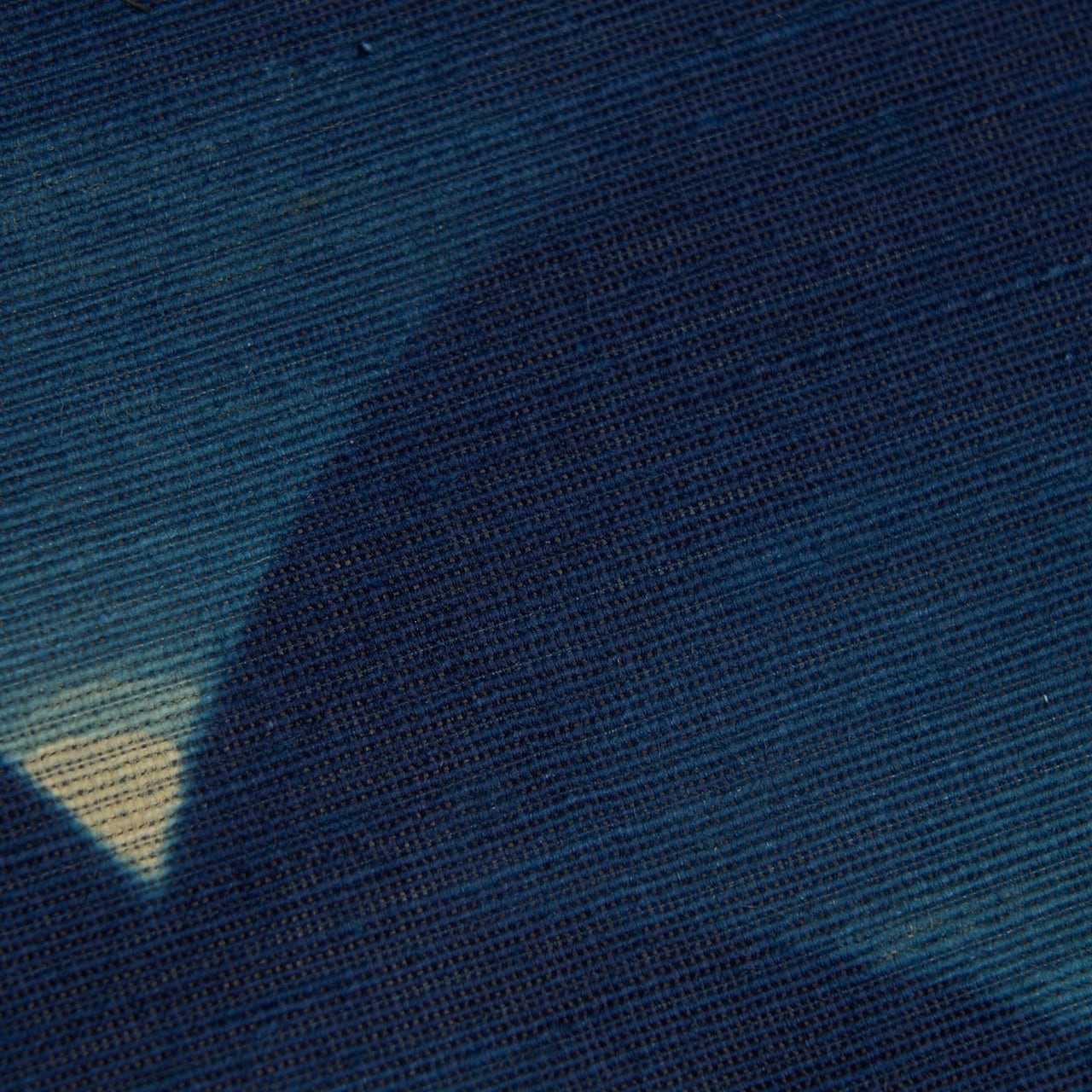 少し撚りが掛かったような強めの緯糸で織られた、シャリっとした質感の紬地に、お太鼓には扇型のような図案がグラデーションで8個染められた、不思議な陰影の感じられる、繧繝彩色藍形染の素晴らしい九寸名古屋帯の作品です。