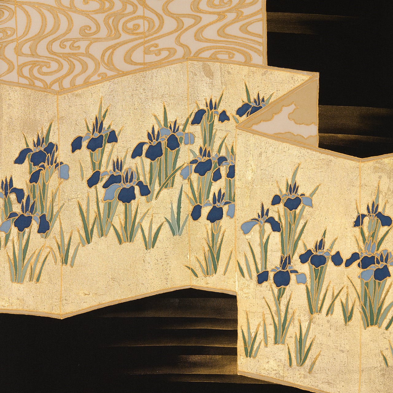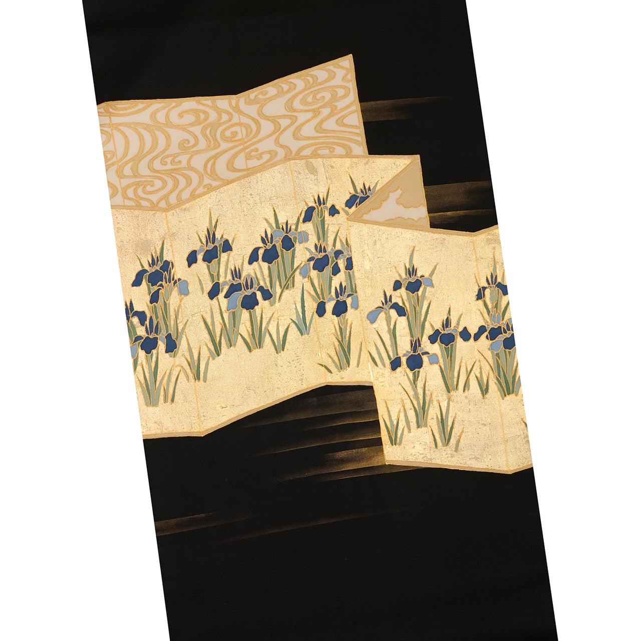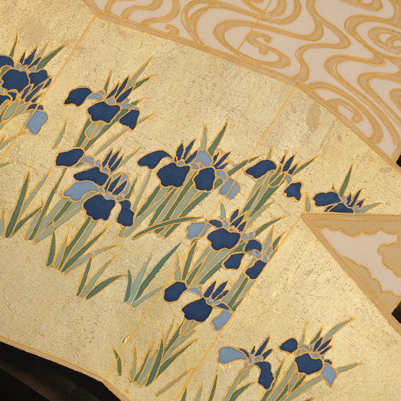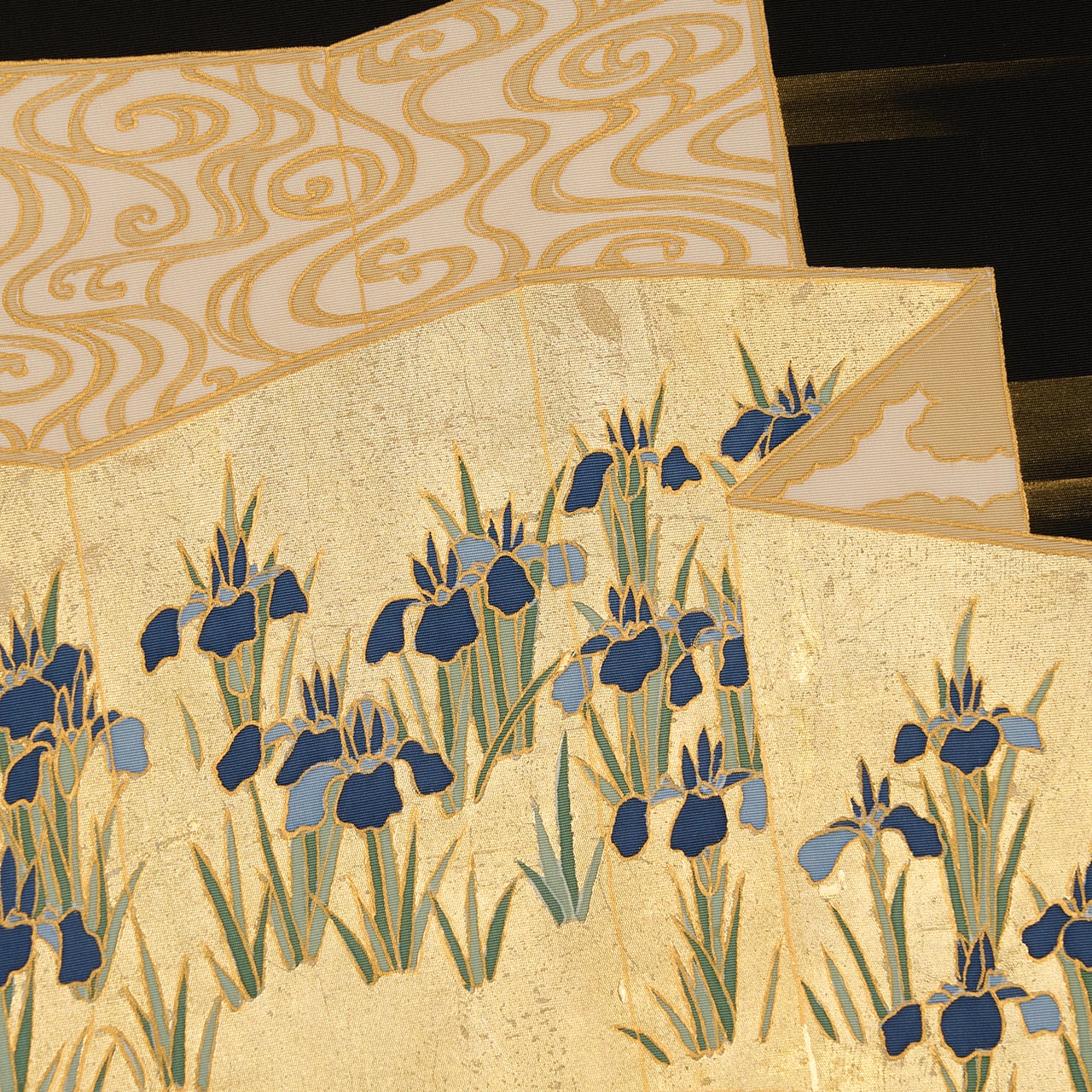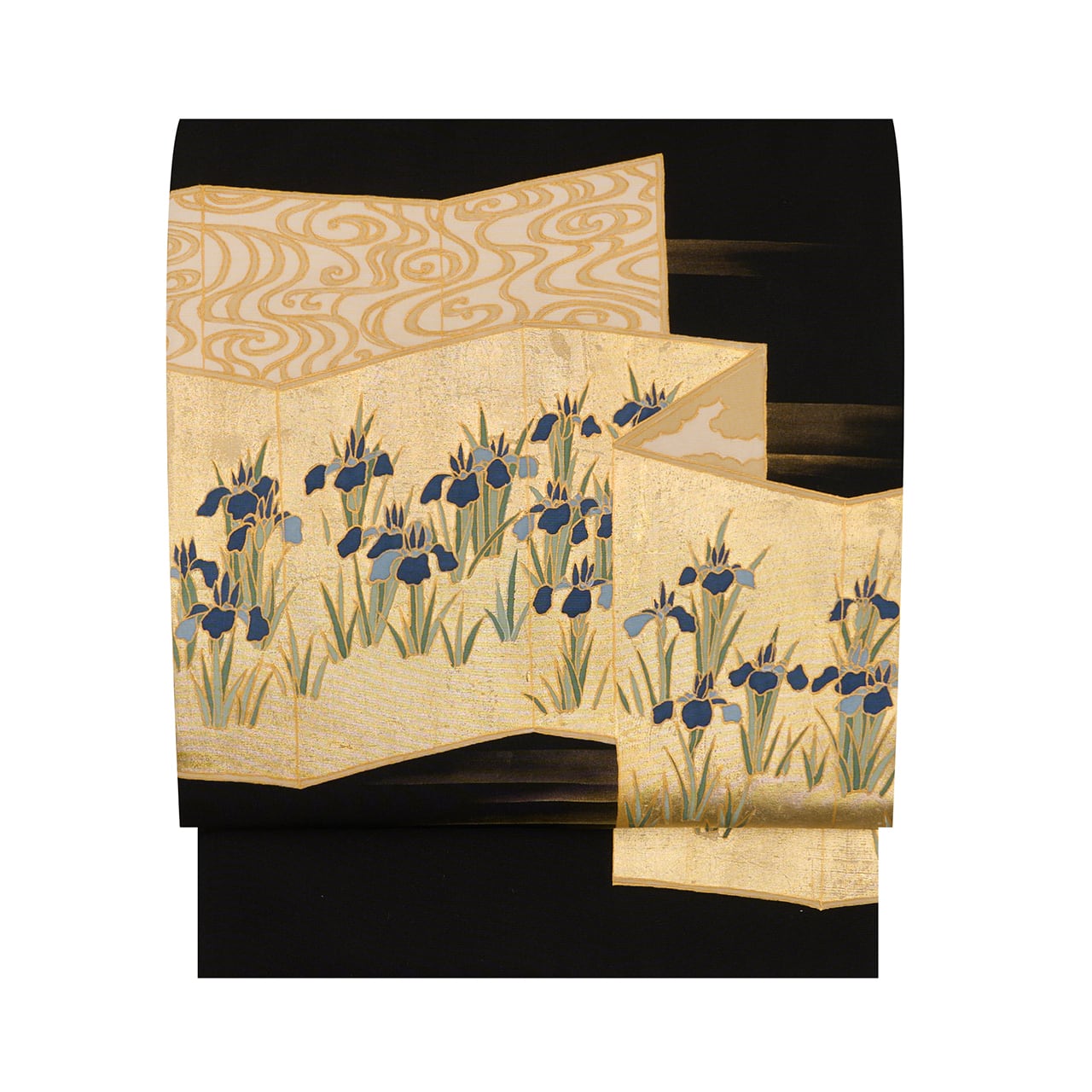 しっかりとしながらもしなやかさのある塩瀬の生地が黒に染められ、お太鼓には屏風の形が取られ、一枚は金箔でうめられた中に咲き競うように並ぶ燕子花のお花が描かれ、もう一枚はその裏側のような琳派の水の模様が描かれた、琳派の図案ならではの迫力が感じられるような九寸名古屋帯です。