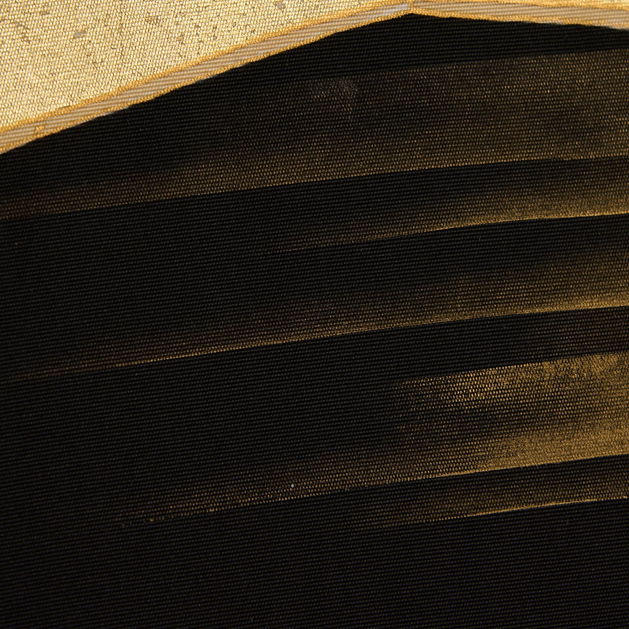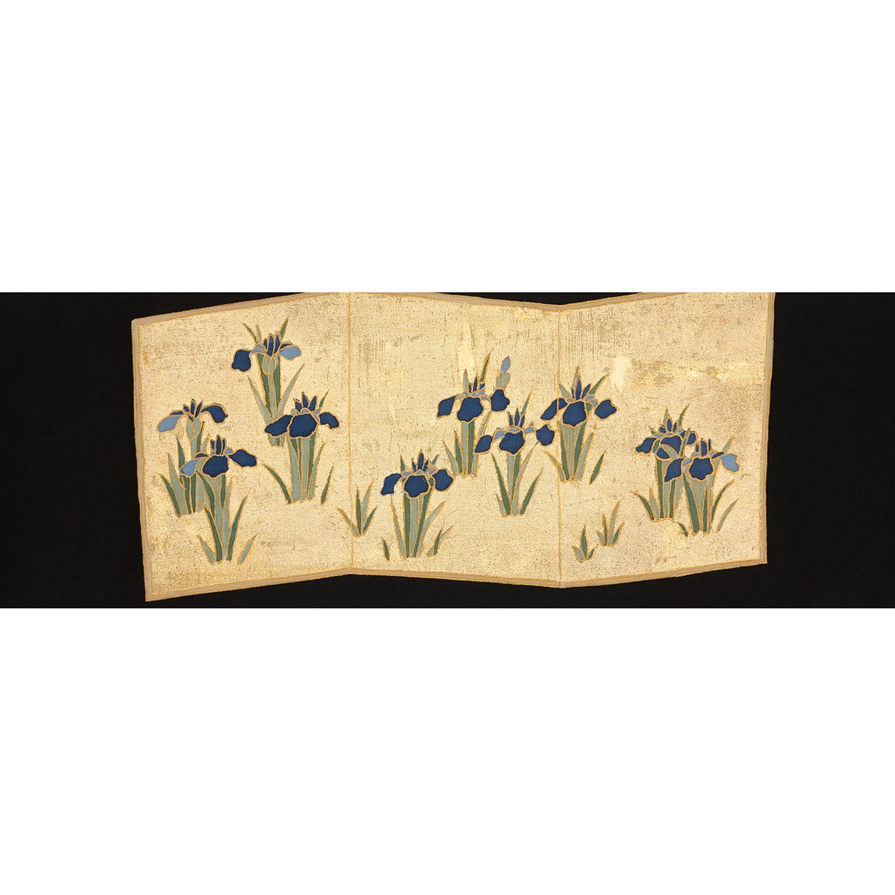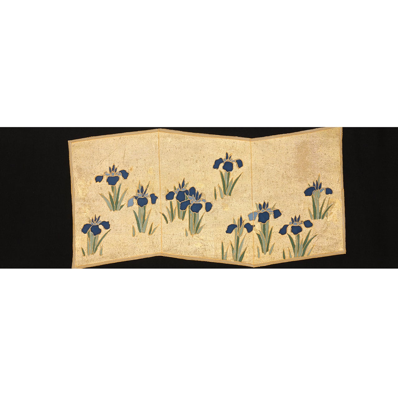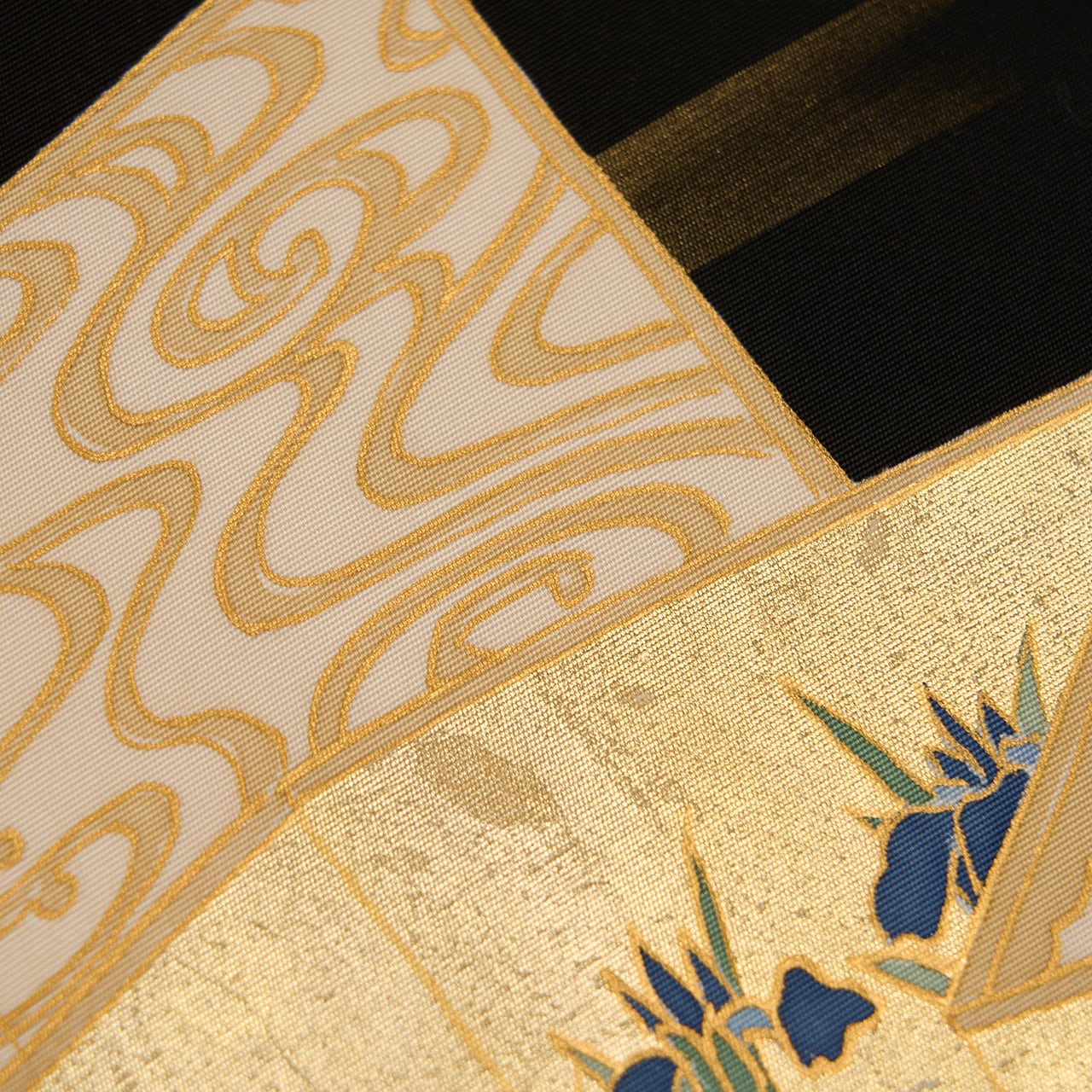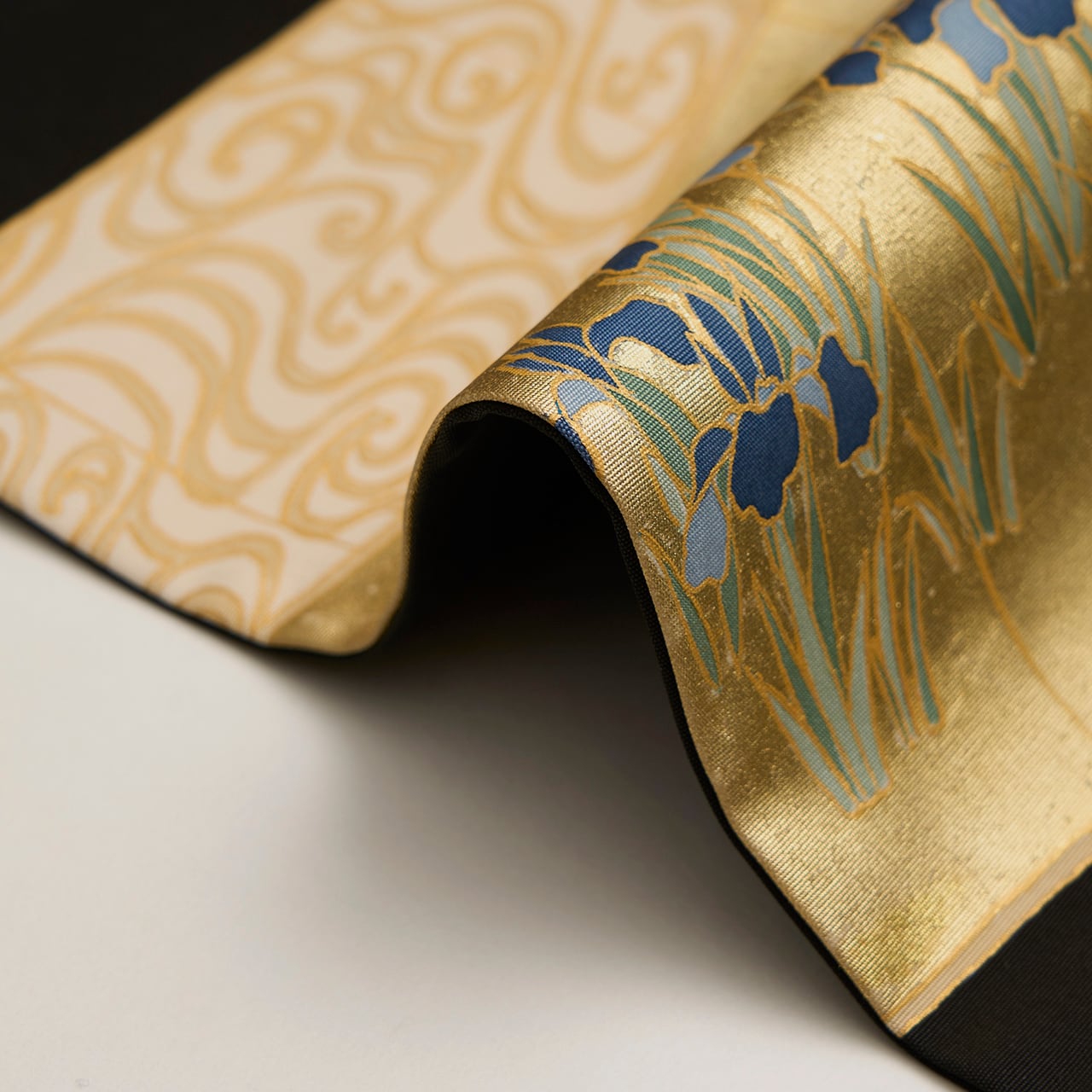 しっかりとしながらもしなやかさのある塩瀬の生地が黒に染められ、お太鼓には屏風の形が取られ、一枚は金箔でうめられた中に咲き競うように並ぶ燕子花のお花が描かれ、もう一枚はその裏側のような琳派の水の模様が描かれた、琳派の図案ならではの迫力が感じられるような九寸名古屋帯です。