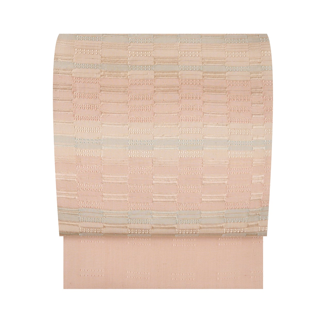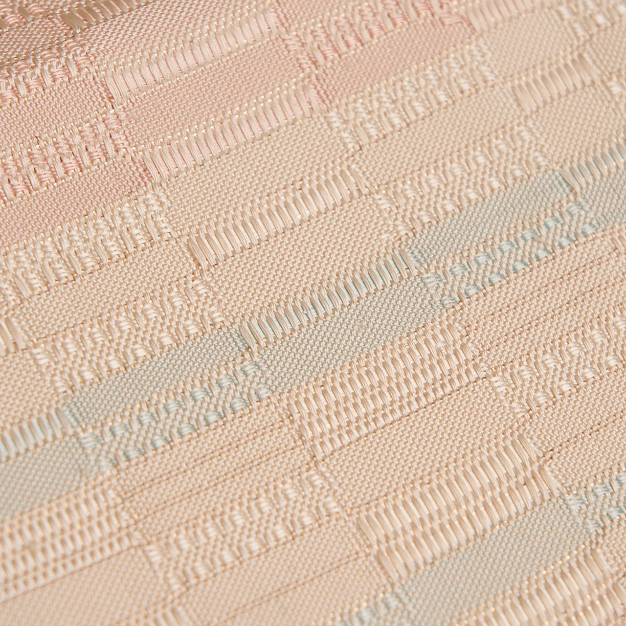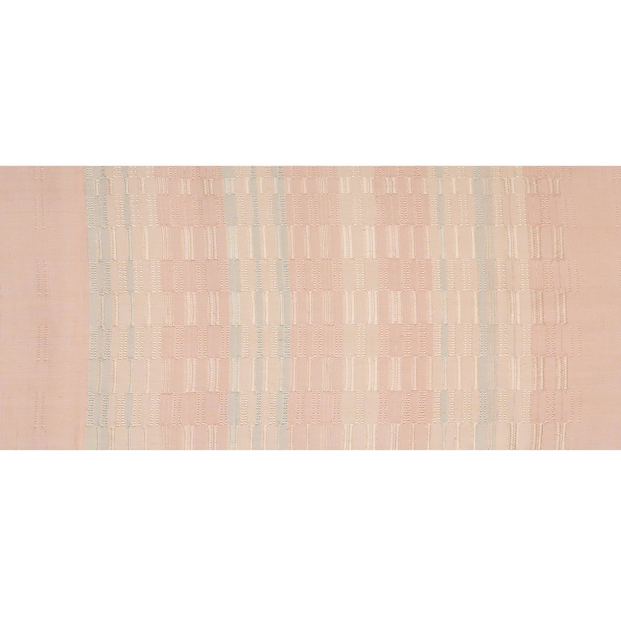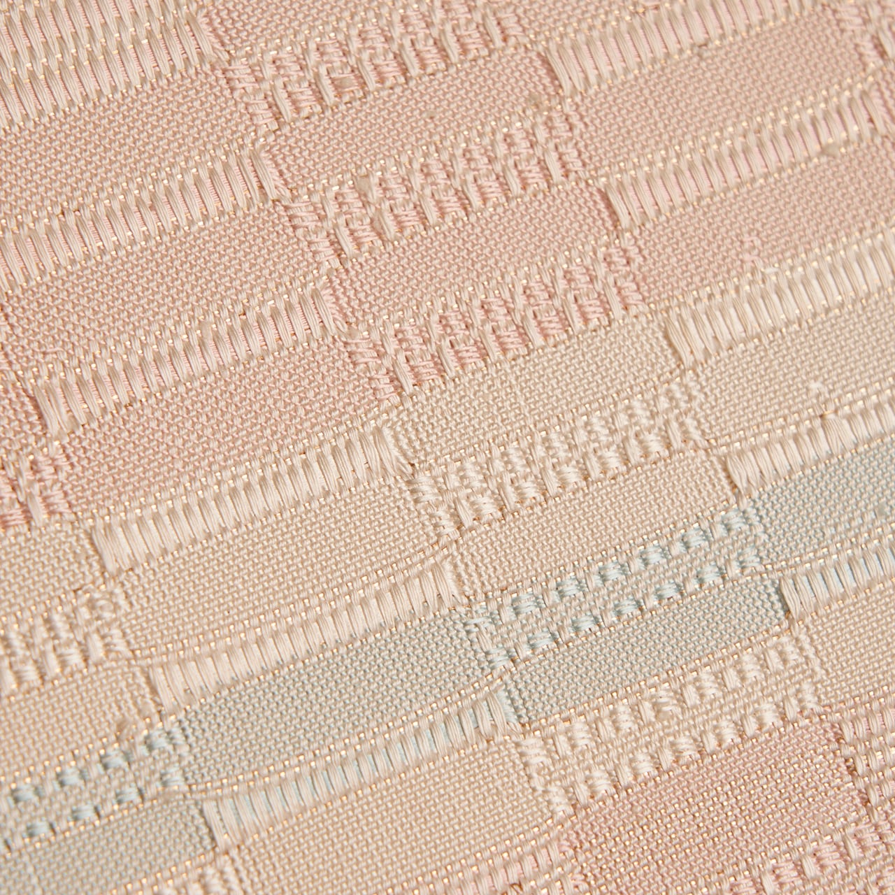 手織ならではのしなやかでありながらもしっかりとした質感の淡いピンク・灰梅色の地に、秘色色の淡いブルーや象牙色の段が取られた、光沢の美しさが目を引く吉野織が織り出された、とても素晴らしい九寸の開名古屋帯です。