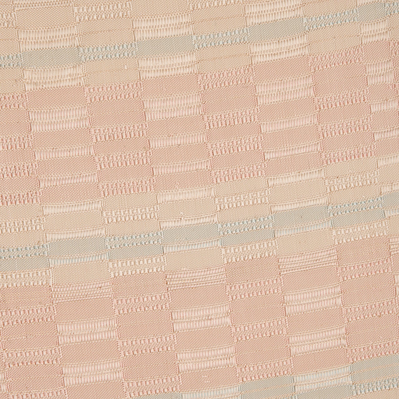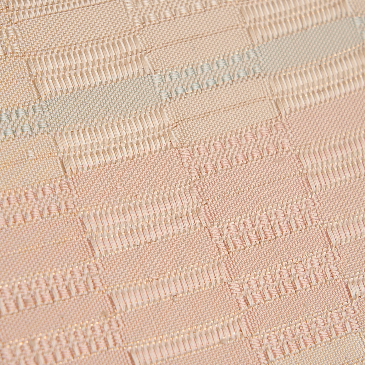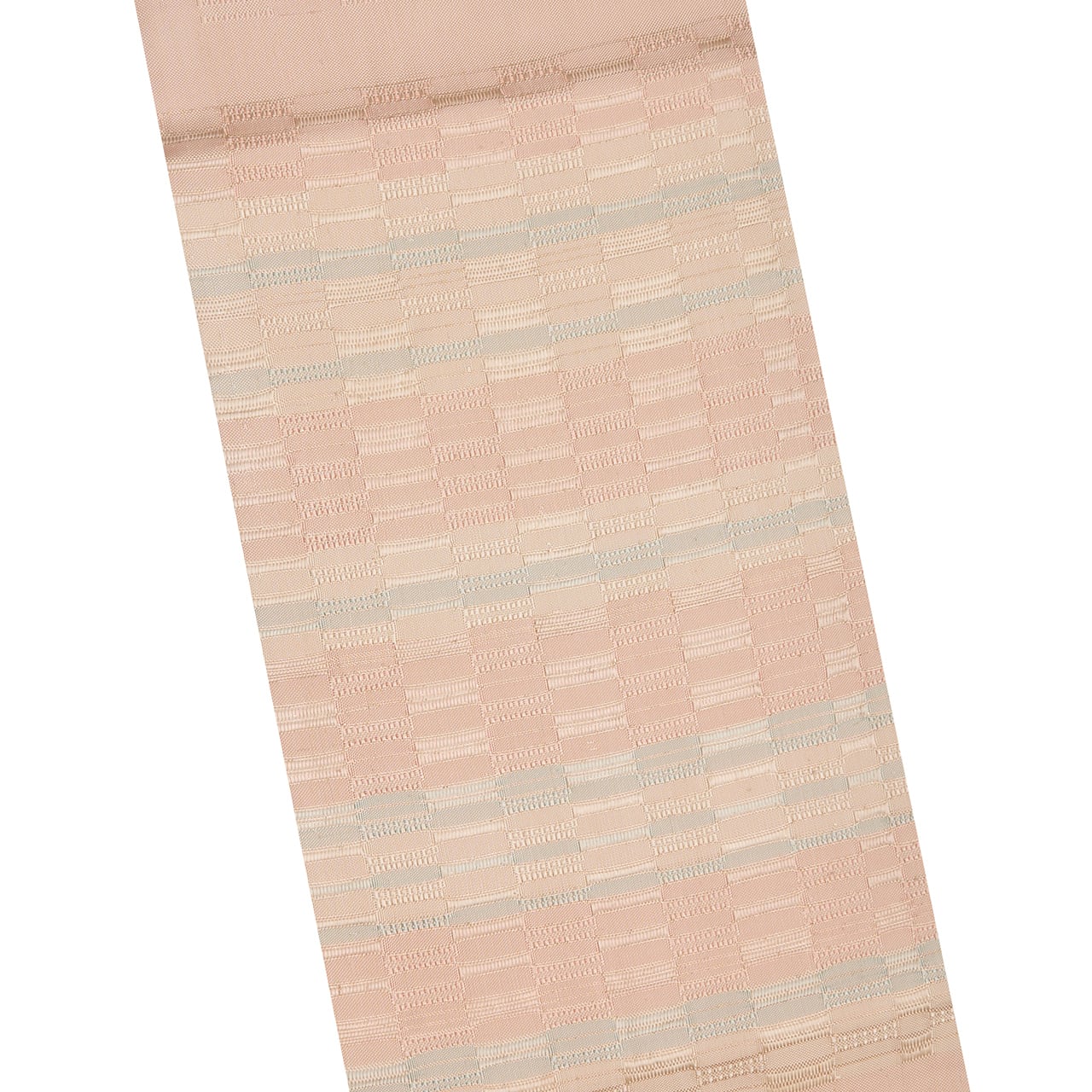 手織ならではのしなやかでありながらもしっかりとした質感の淡いピンク・灰梅色の地に、秘色色の淡いブルーや象牙色の段が取られた、光沢の美しさが目を引く吉野織が織り出された、とても素晴らしい九寸の開名古屋帯です。