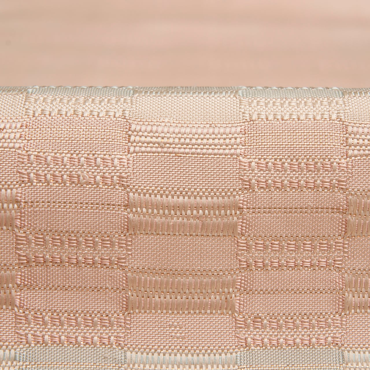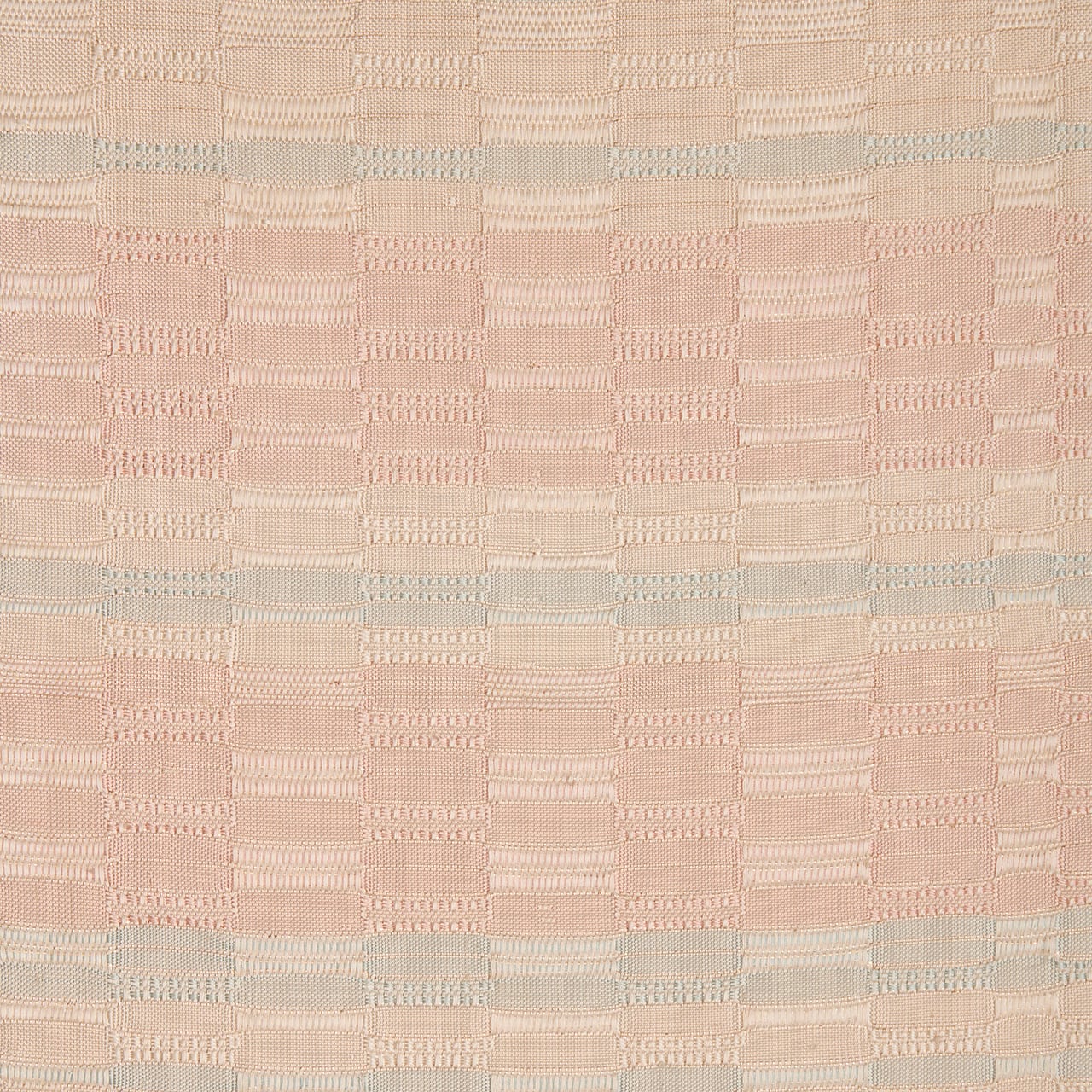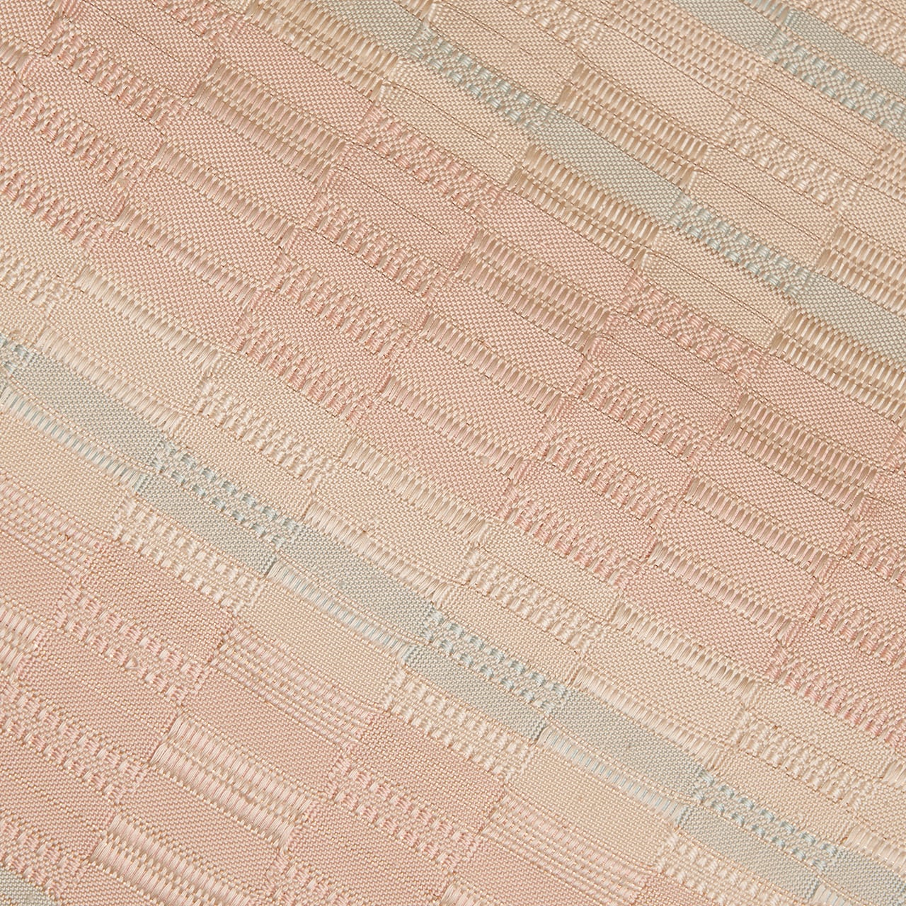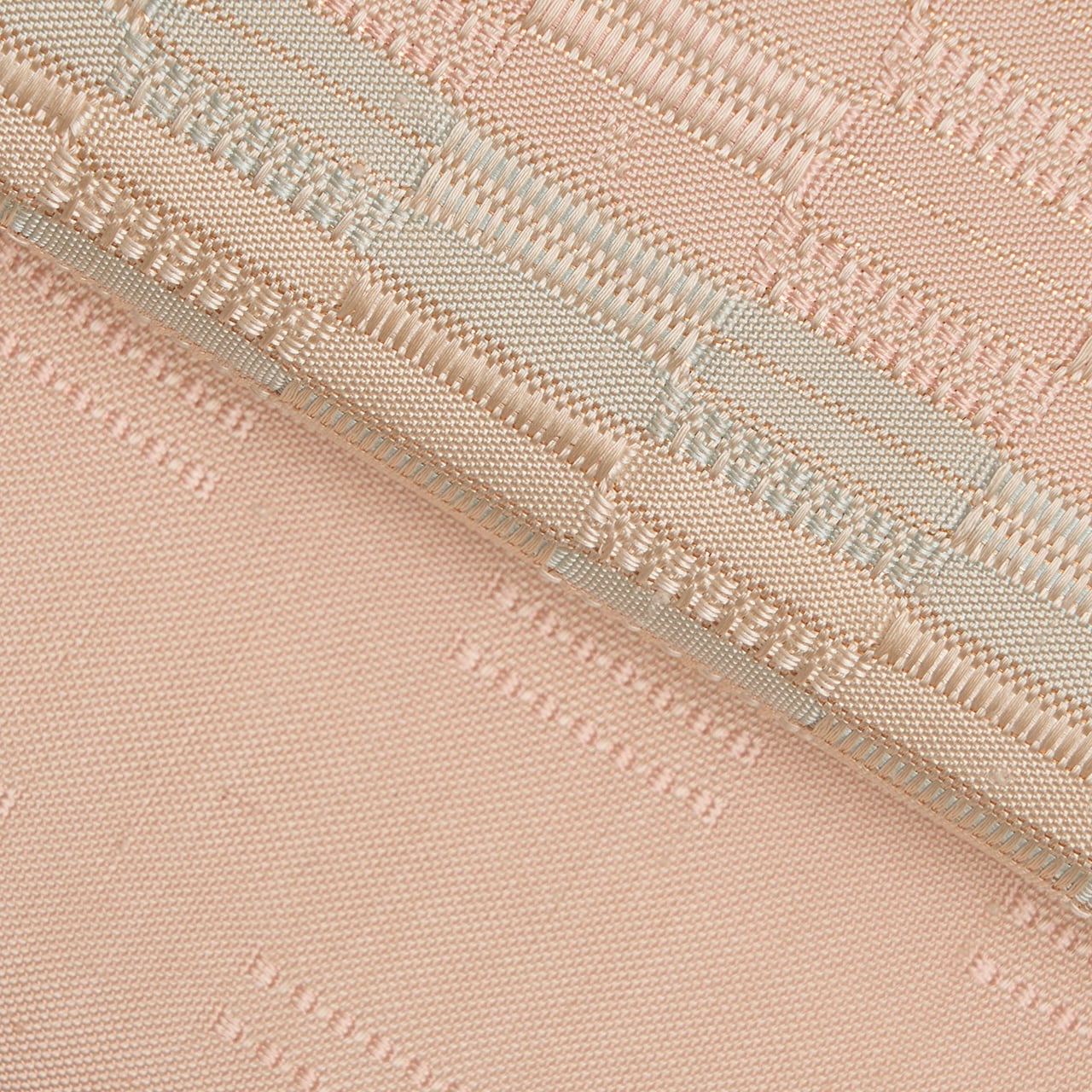 手織ならではのしなやかでありながらもしっかりとした質感の淡いピンク・灰梅色の地に、秘色色の淡いブルーや象牙色の段が取られた、光沢の美しさが目を引く吉野織が織り出された、とても素晴らしい九寸の開名古屋帯です。