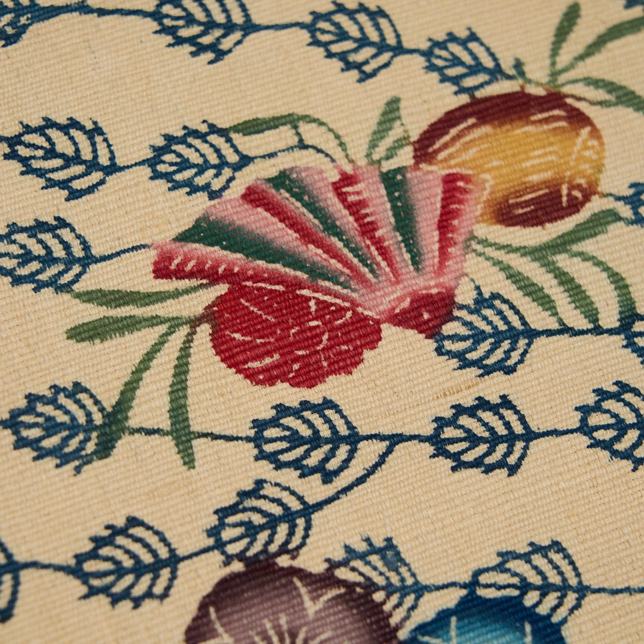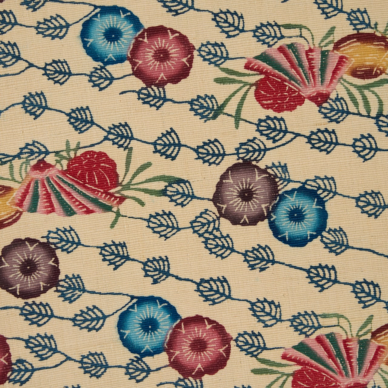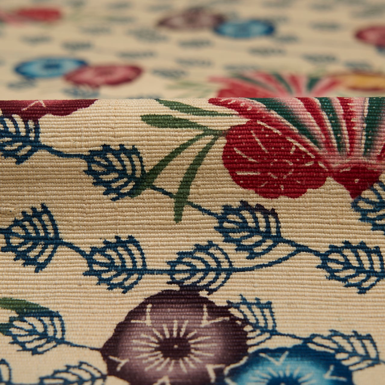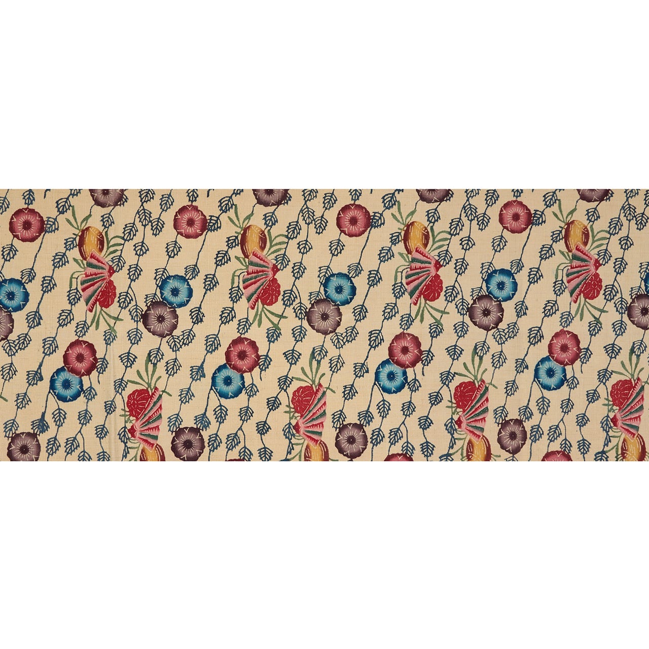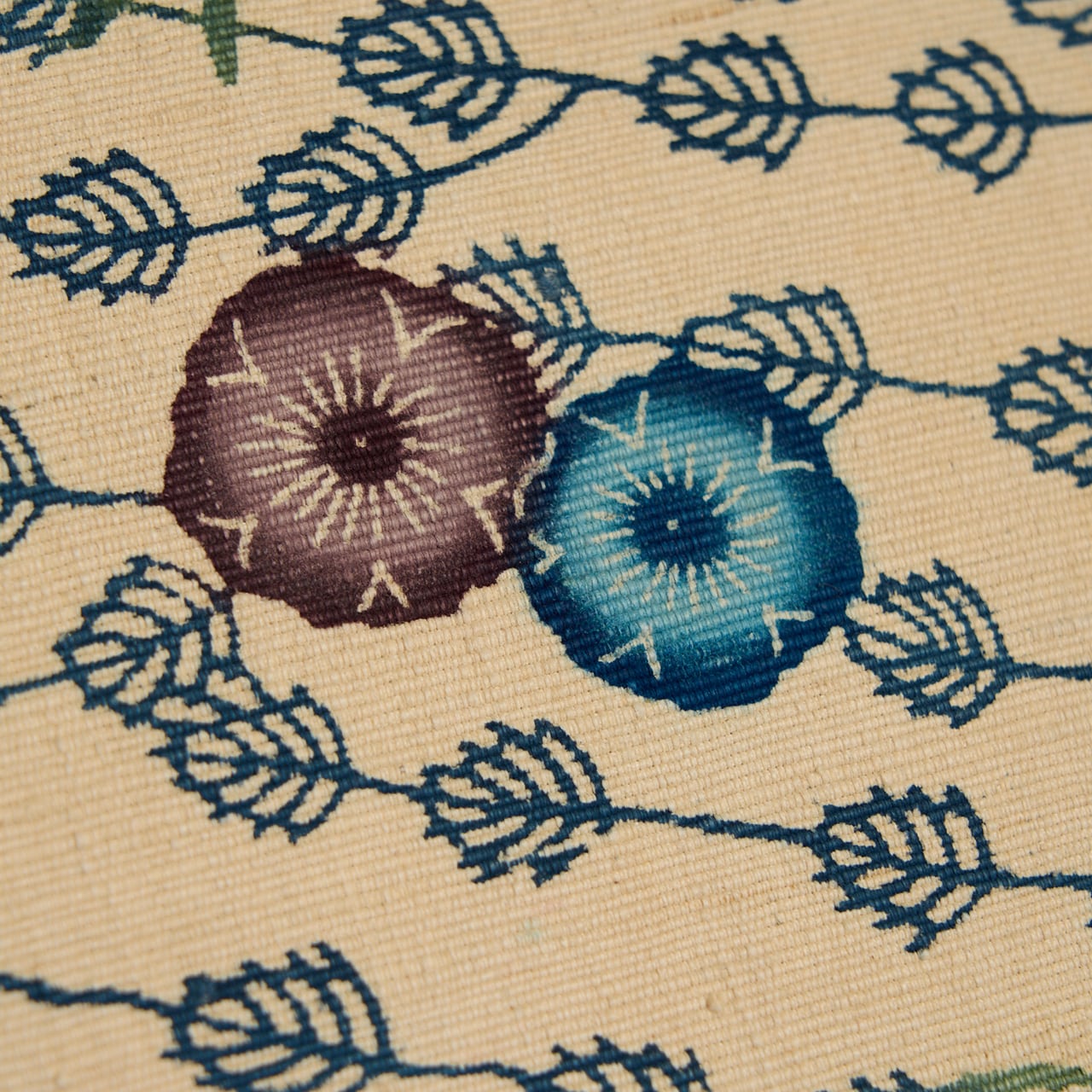 紅型染は染料ではなく顔料を使って、模様のひとつずつに刷毛で色を入れて染めますが、こちらは生地が太めの真綿のような緯糸で織られていますので、しっかりと顔料が浸みこんでいるようで、発色もくっきりとしたメリハリの感じられるものとなっているようです。