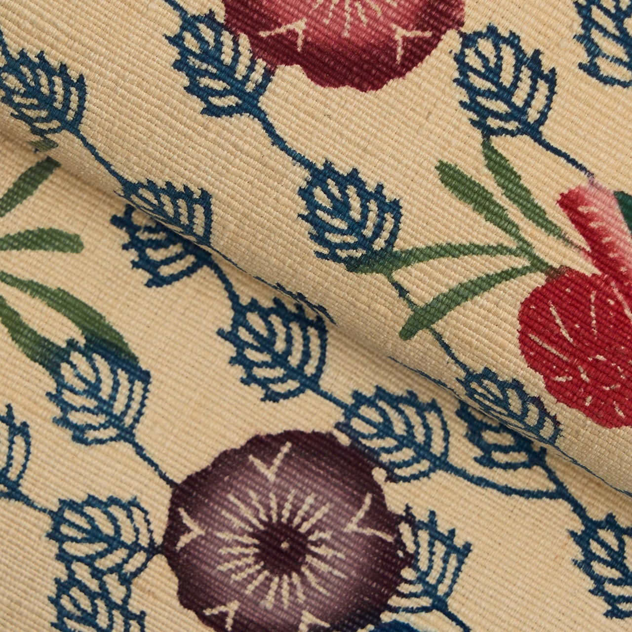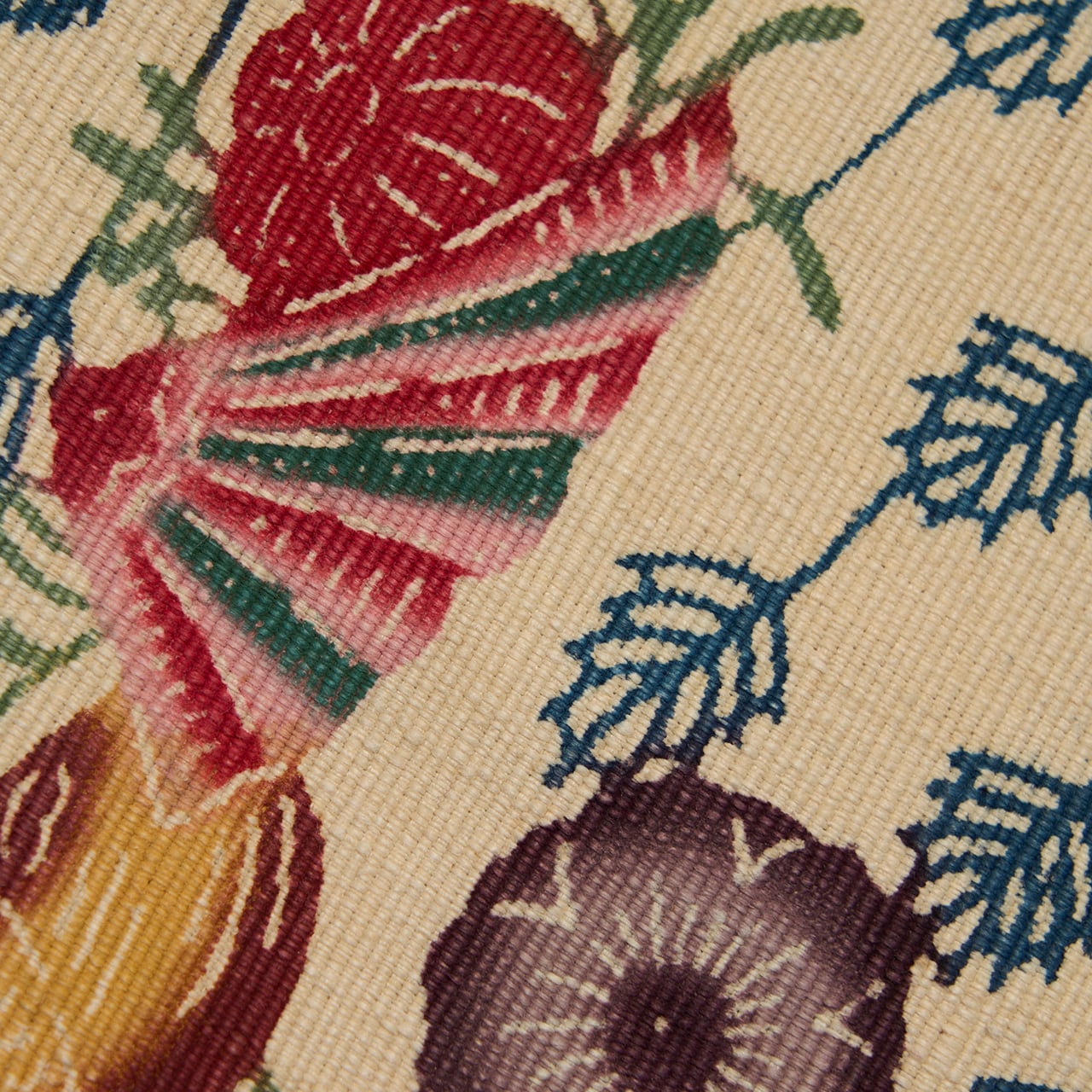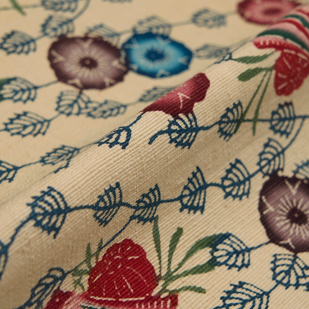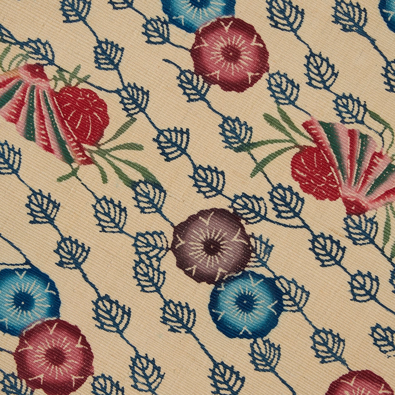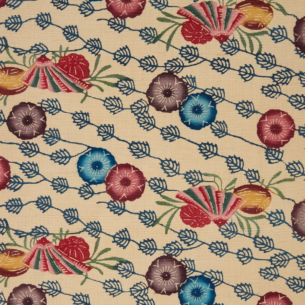 紅型染は染料ではなく顔料を使って、模様のひとつずつに刷毛で色を入れて染めますが、こちらは生地が太めの真綿のような緯糸で織られていますので、しっかりと顔料が浸みこんでいるようで、発色もくっきりとしたメリハリの感じられるものとなっているようです。