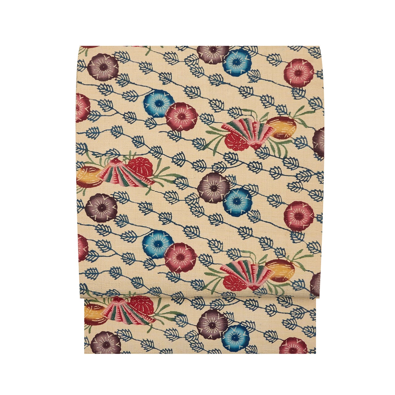 緯糸がやや太めで、張りのあるしっかりとした質感の象牙色の生地に、木の葉をつけた枝のようなものが斜め縞のように描かれ、それを背景にして桜のようなふっくらとしたお花と、綺麗な色使いの貝が紅型染めで描かれた、とてもメリハリの感じられる素敵な八寸名古屋帯です。