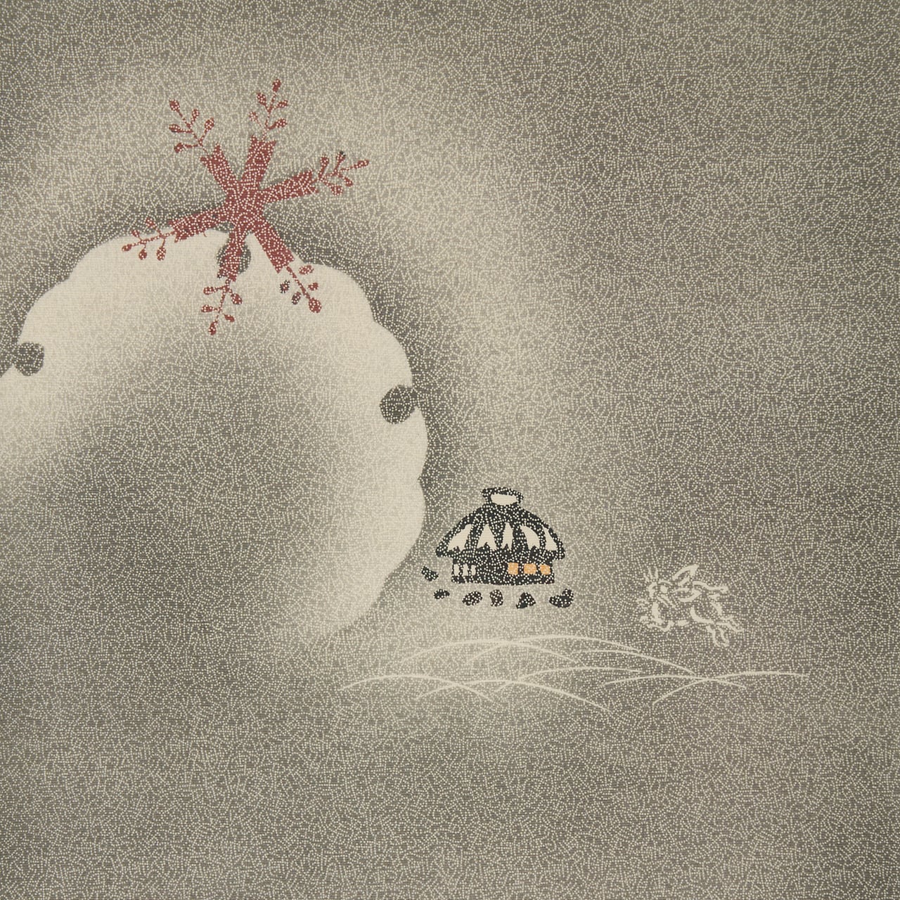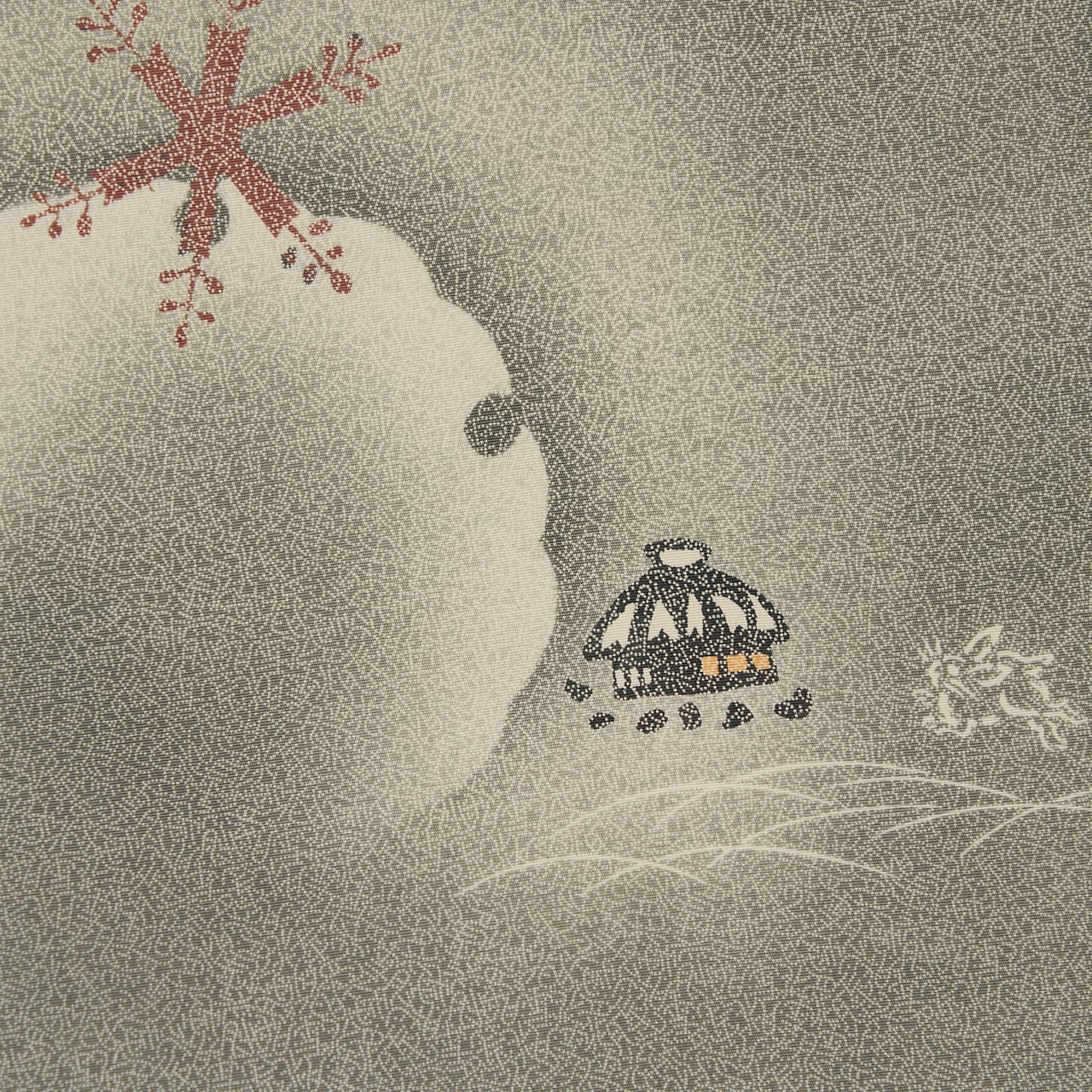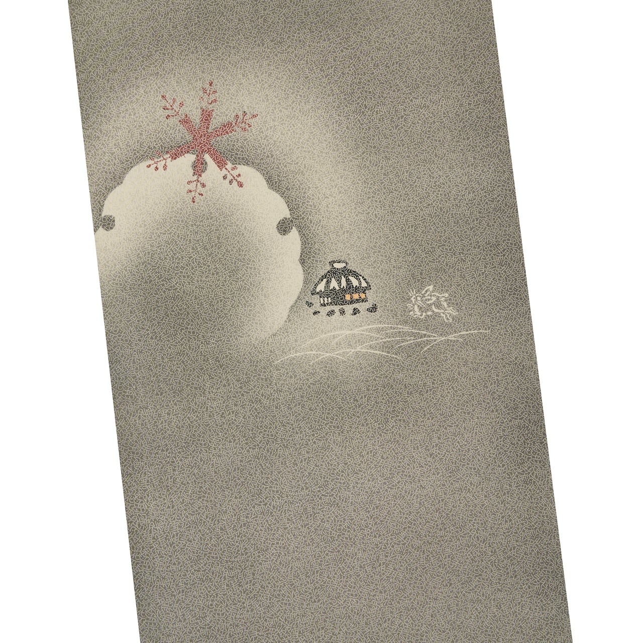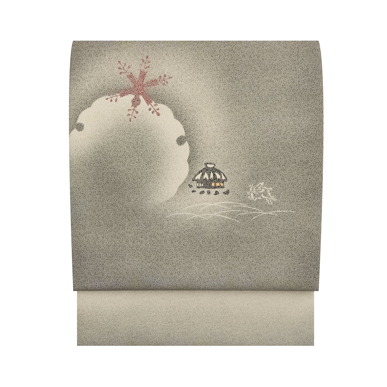 しなやかさのある塩瀬の生地に、お太鼓と前柄の部分を中心にかなり広い範囲に「雪月花」の文字の江戸小紋が染められ、お太鼓には大きな雪輪が素色で染め抜かれ、それに雪の結晶がひとつかかり、傍らには茅葺の小さなお家と、その傍をうさぎが跳ねているといった、昔話の1ページのような情景が染められた、素敵な九寸名古屋帯です。