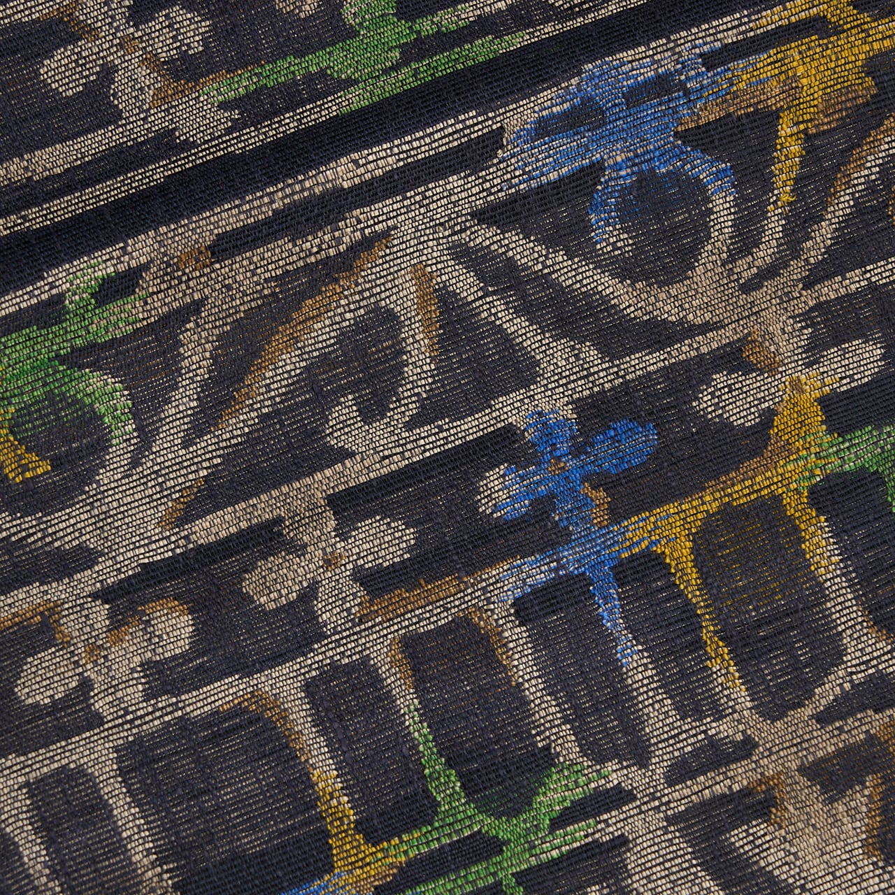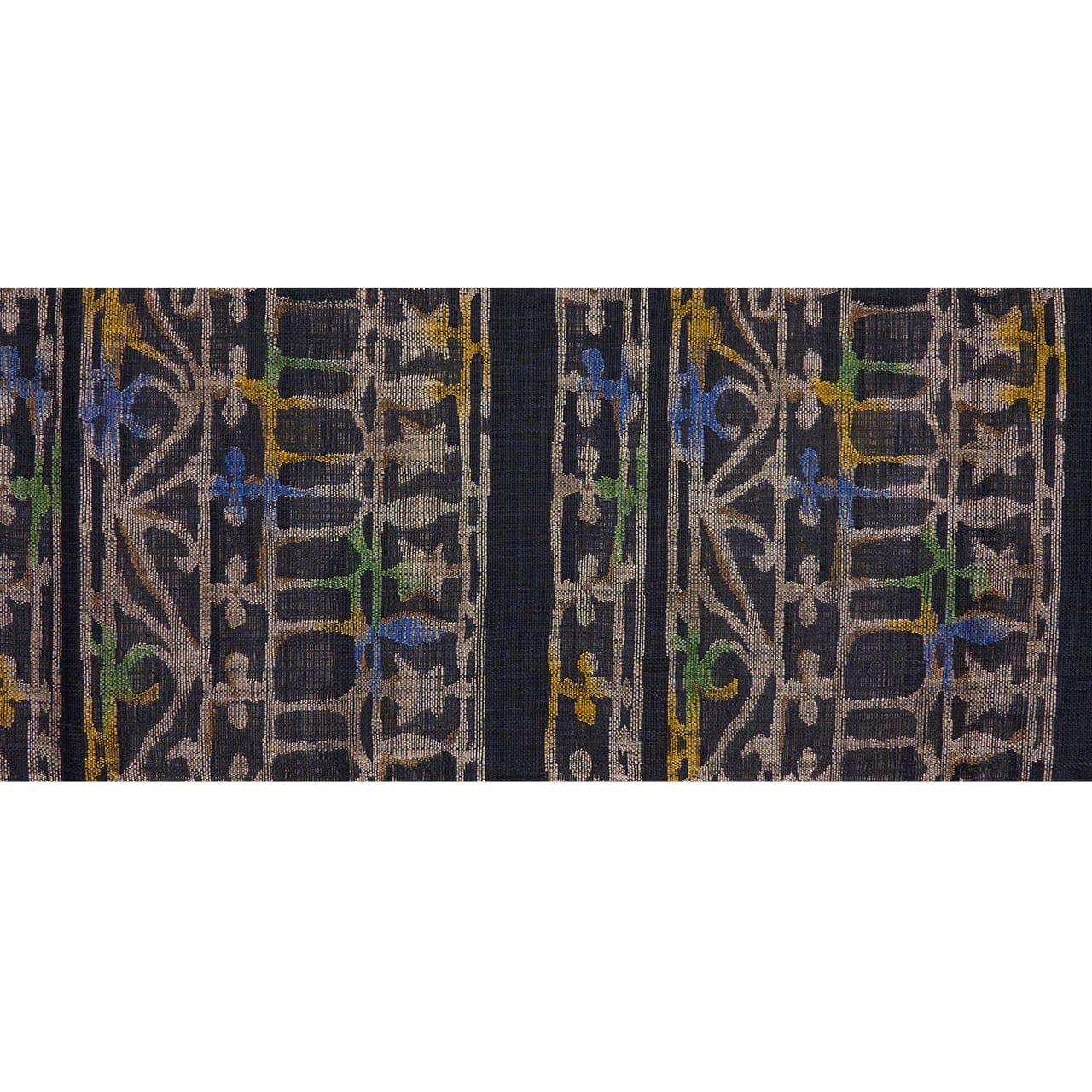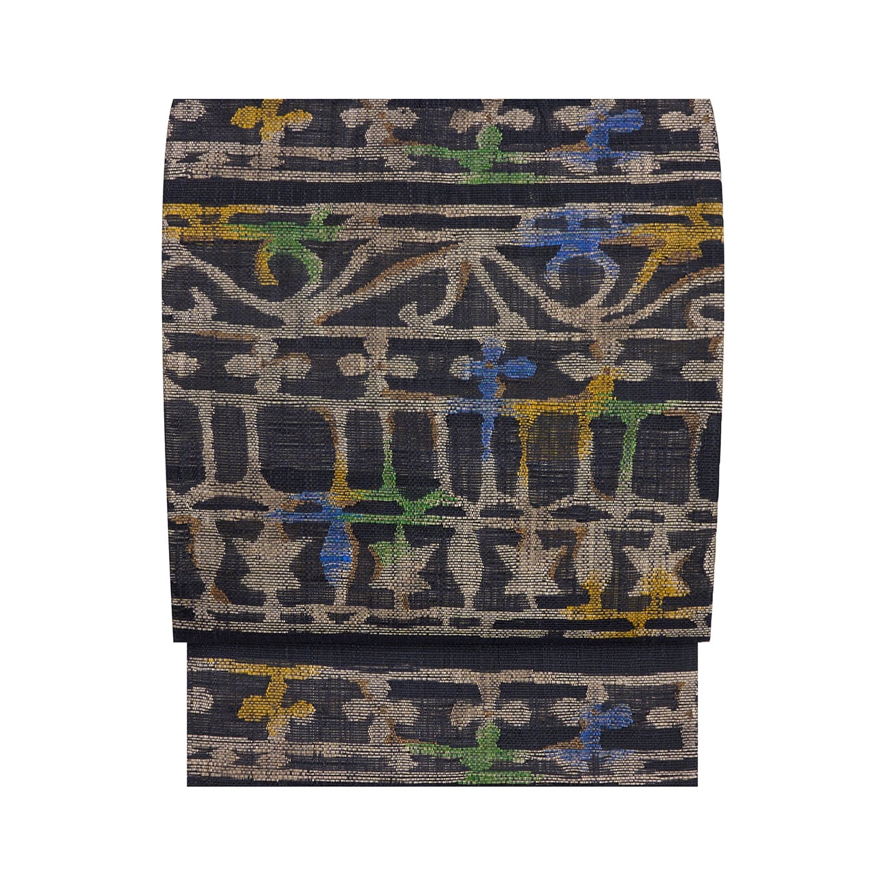 模様の部分に特にやや透け感のあるような、シャリっとした質感に織られた黒の地に、淡いグレー・枯野色の糸でヨーロッパの教会の内装のような幾何学文様が織り出され、そのところどころに明るい緑・花緑青色や紺藍色、鶸色の黄色、桑染色の薄茶などの糸が挿し色のように織り込まれて変化をもたらしている、帯屋捨松さんならではのとても素敵な袋帯です。