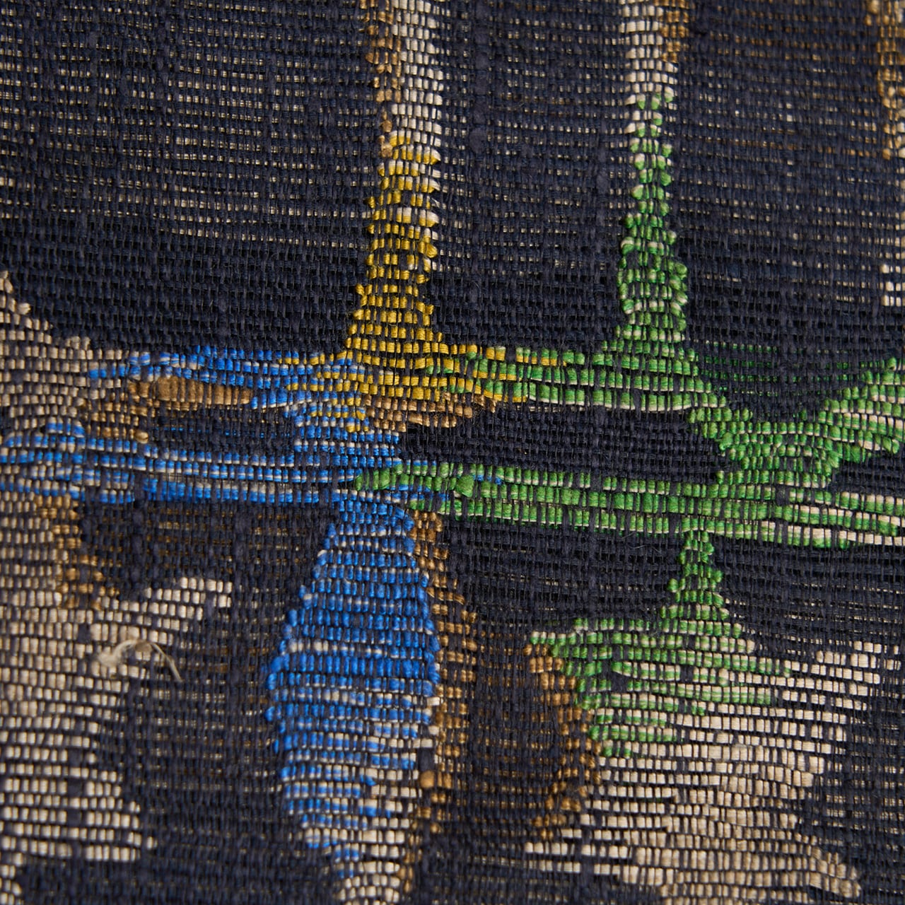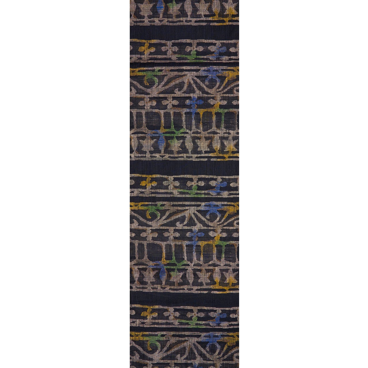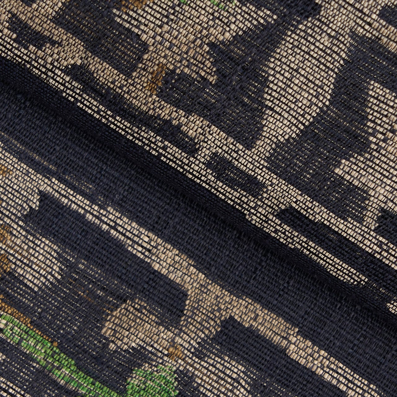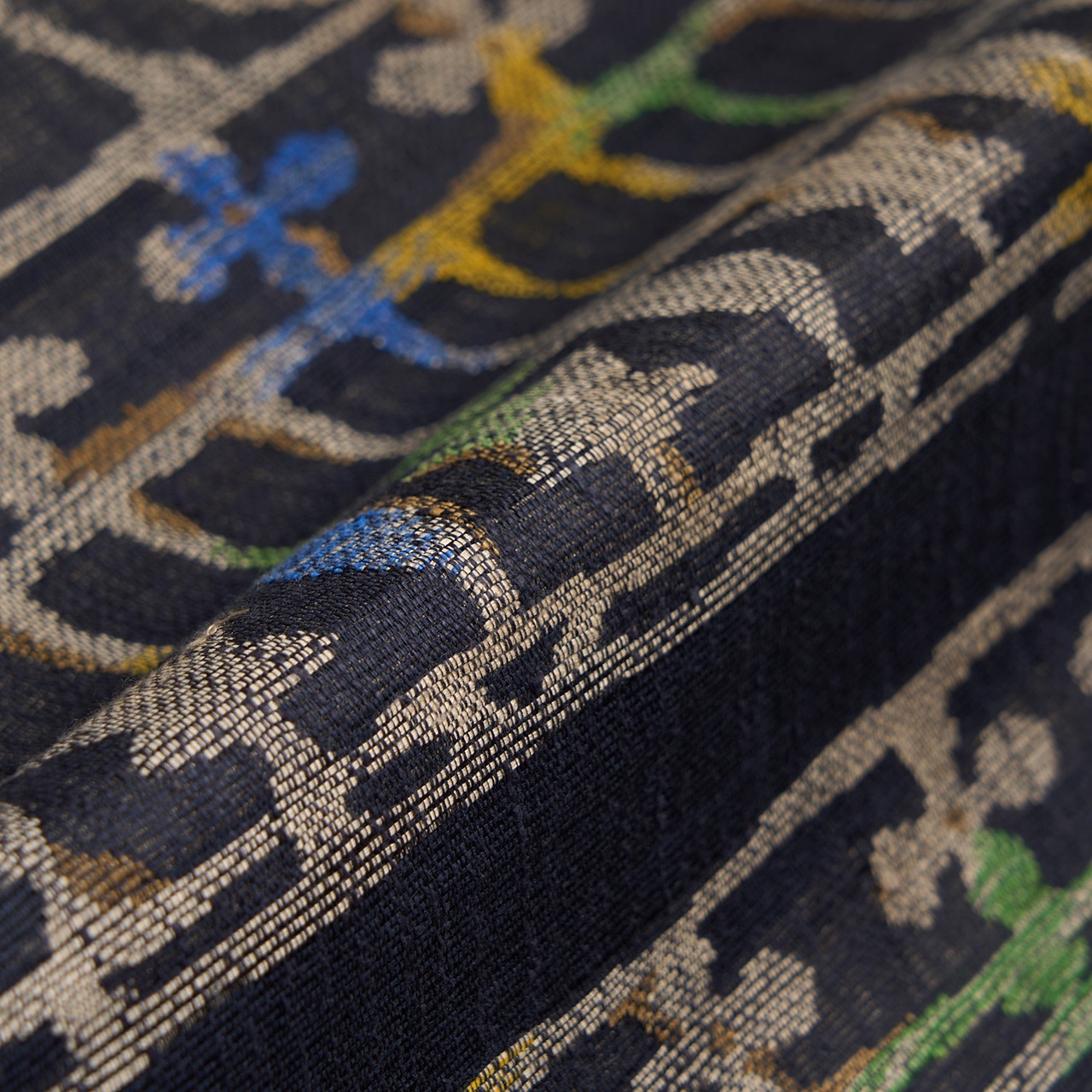 模様の部分に特にやや透け感のあるような、シャリっとした質感に織られた黒の地に、淡いグレー・枯野色の糸でヨーロッパの教会の内装のような幾何学文様が織り出され、そのところどころに明るい緑・花緑青色や紺藍色、鶸色の黄色、桑染色の薄茶などの糸が挿し色のように織り込まれて変化をもたらしている、帯屋捨松さんならではのとても素敵な袋帯です。