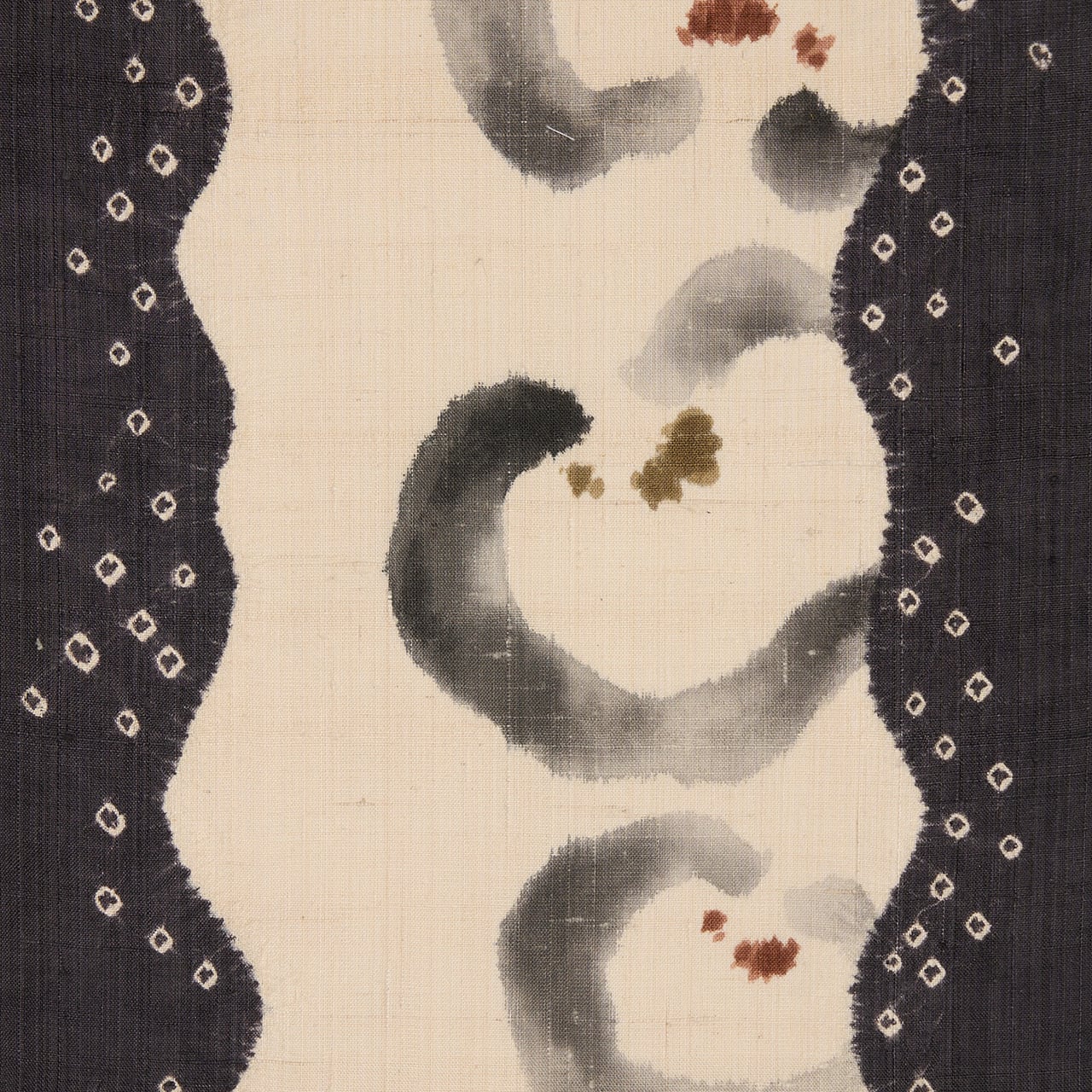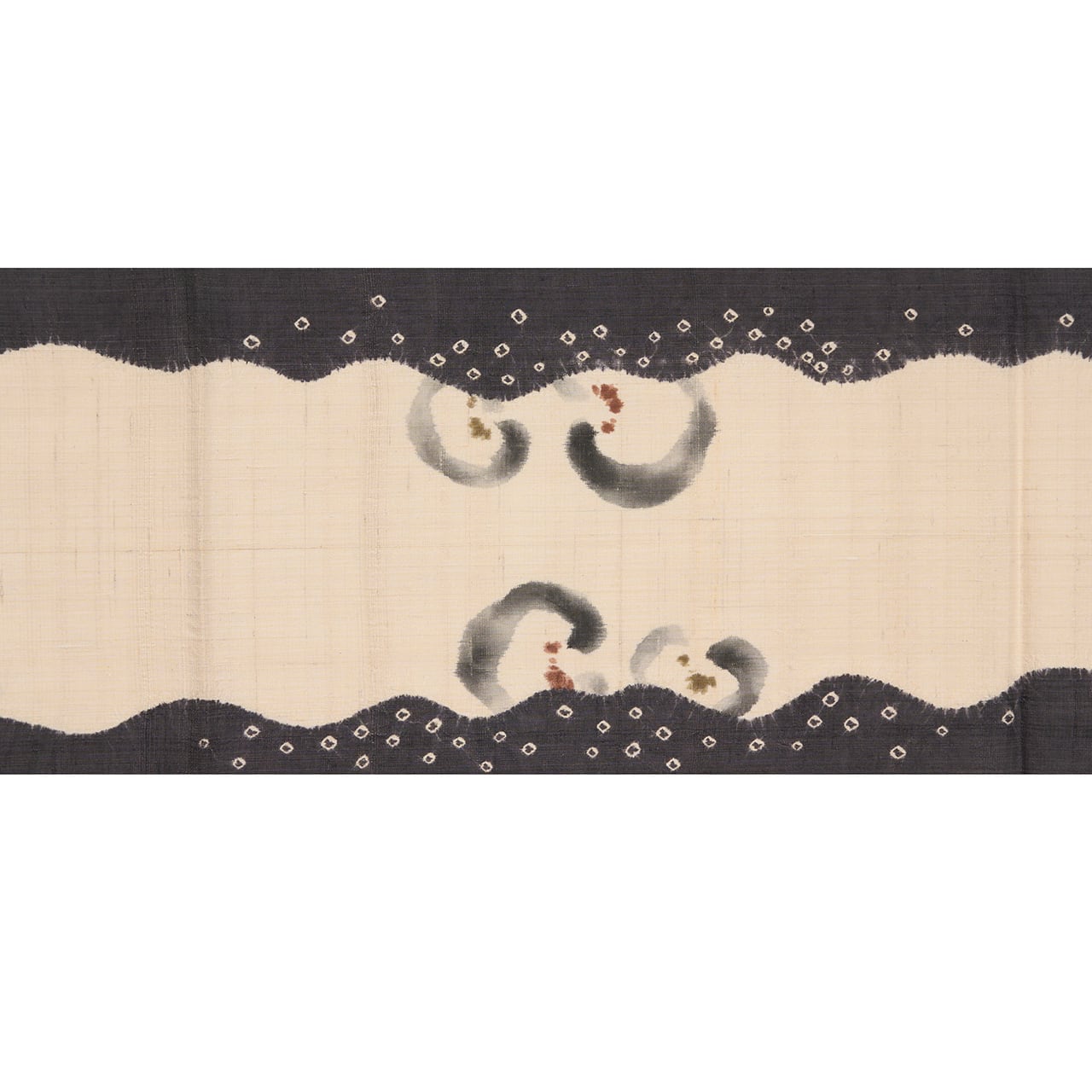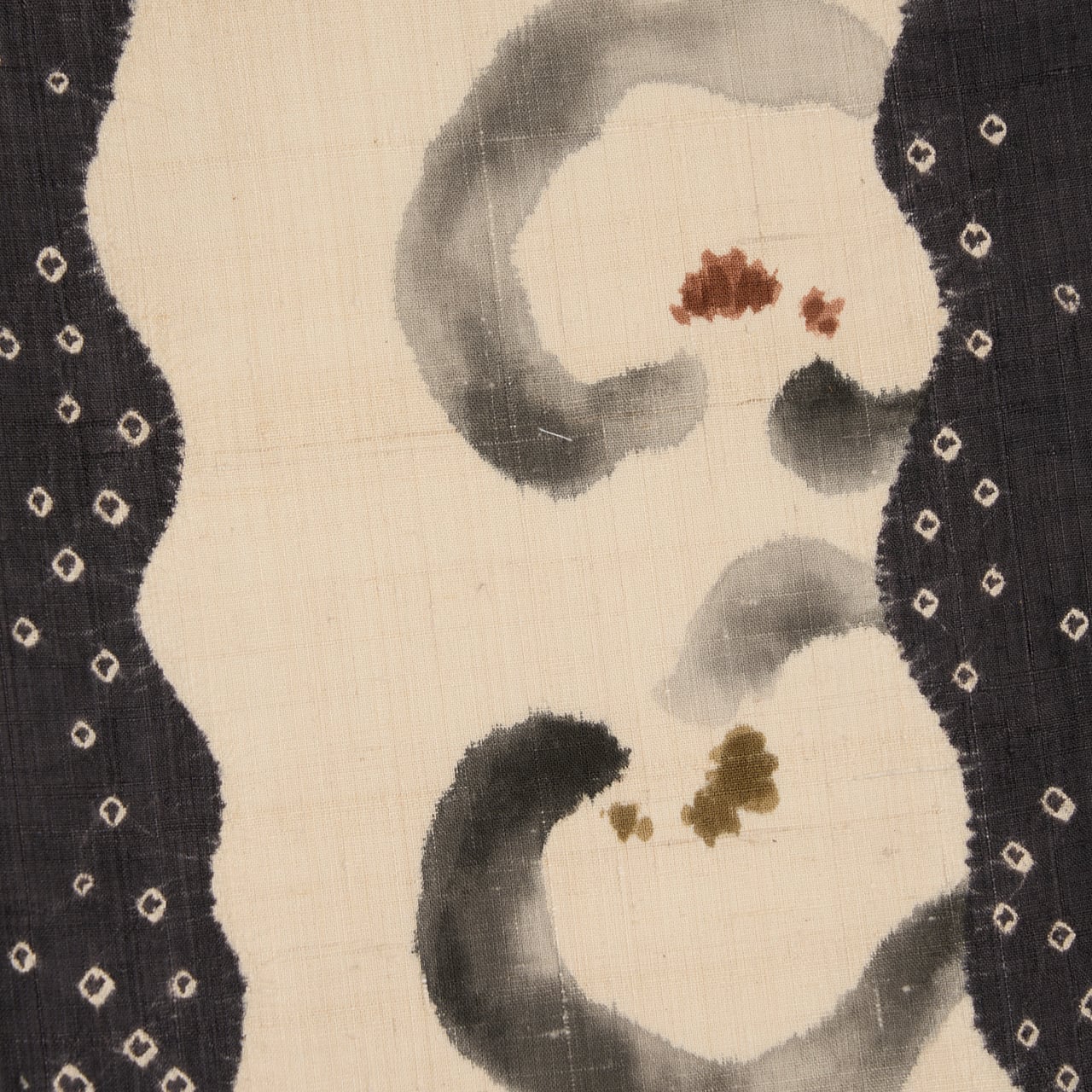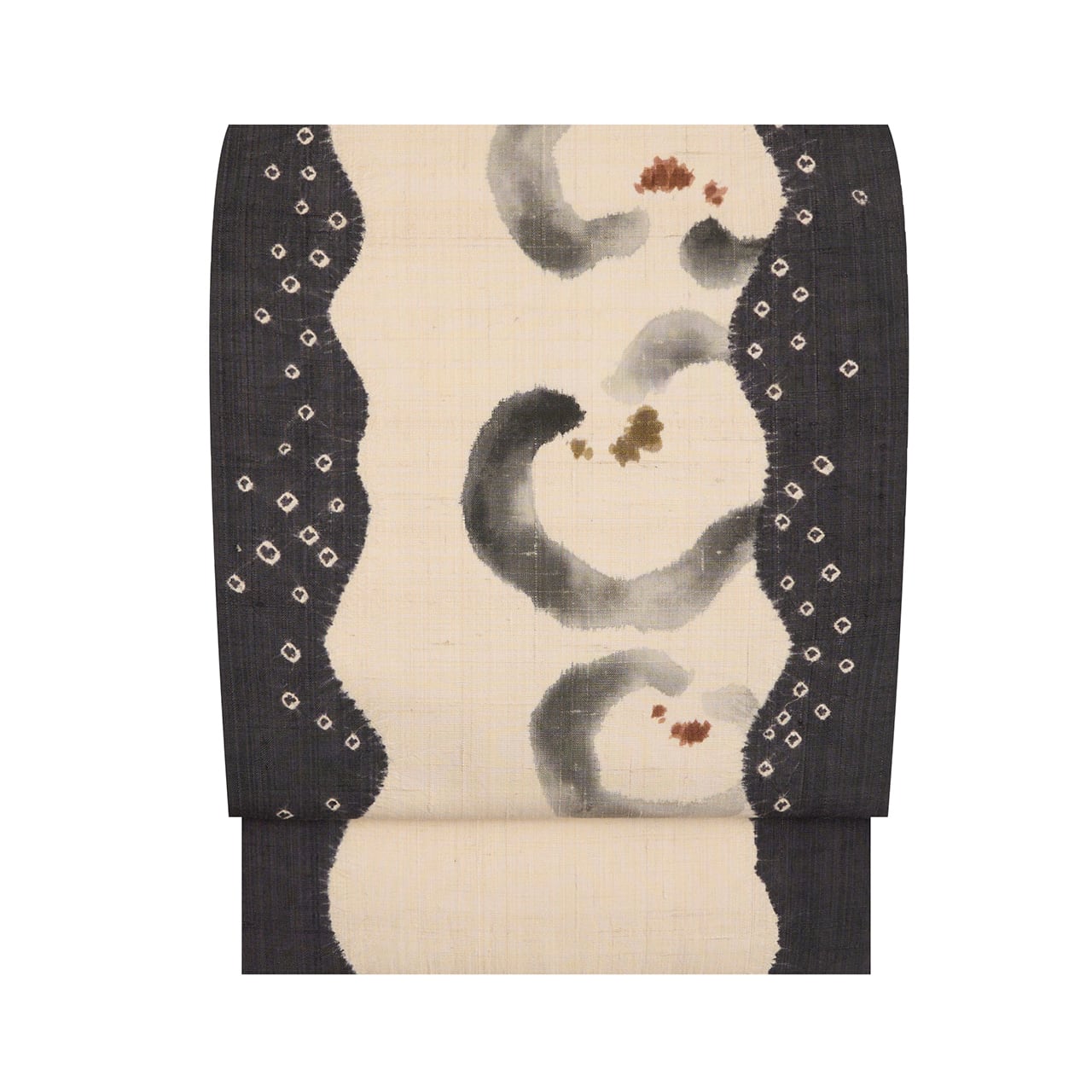 緯糸に節のある、しょうざんさんらしい上質な赤城の座繰りの象牙色の紬地のお太鼓の両端が、立涌のような輪郭の絞り染めで藍墨茶色に染め分けられ、中には小さな豆絞りも施されていて、真ん中の象牙色の部分には、濡れ書きのようなタッチの墨書きで大きめの椿のお花が3つ描かれ、たとてもすっきりとした洒脱な雰囲気の九寸名古屋帯です。