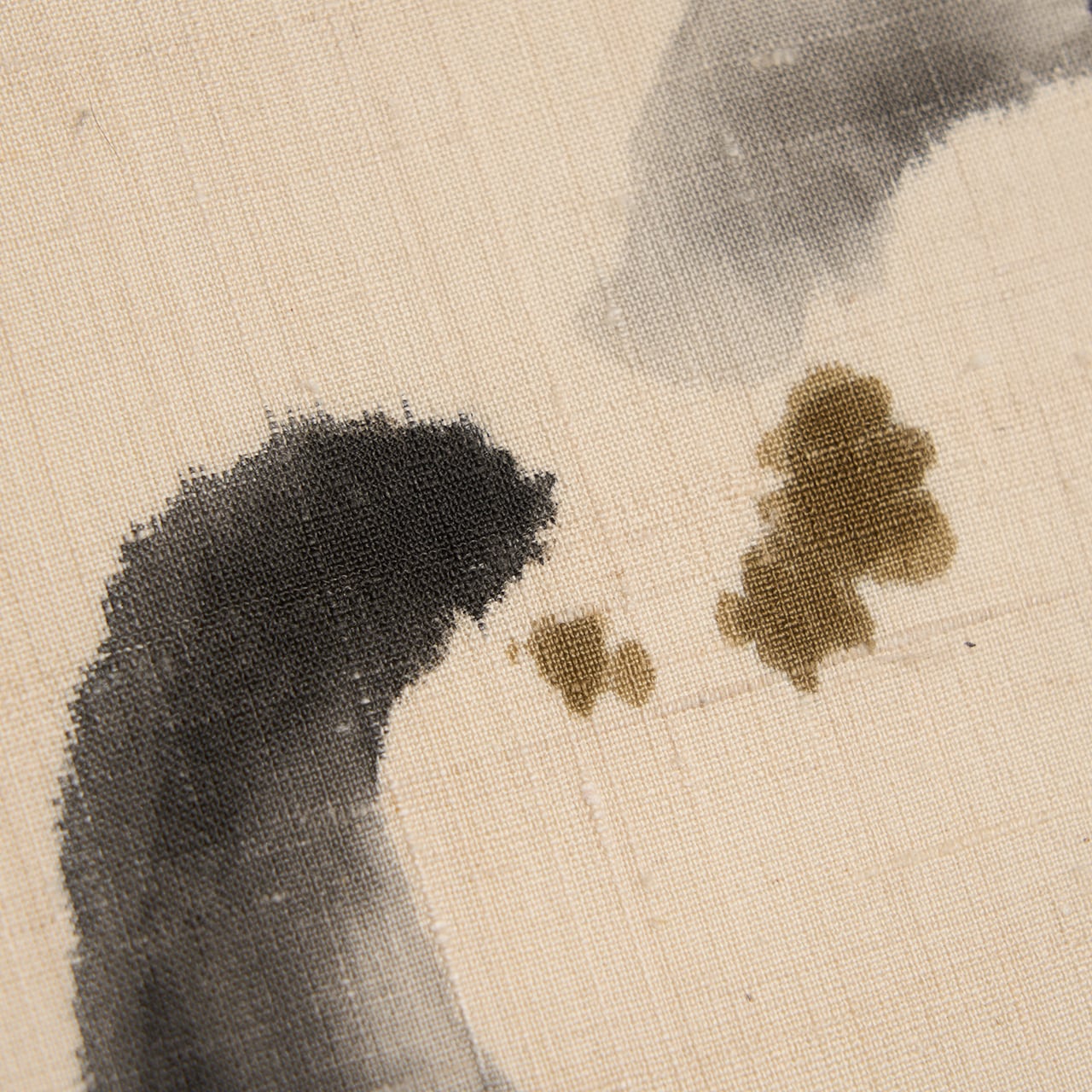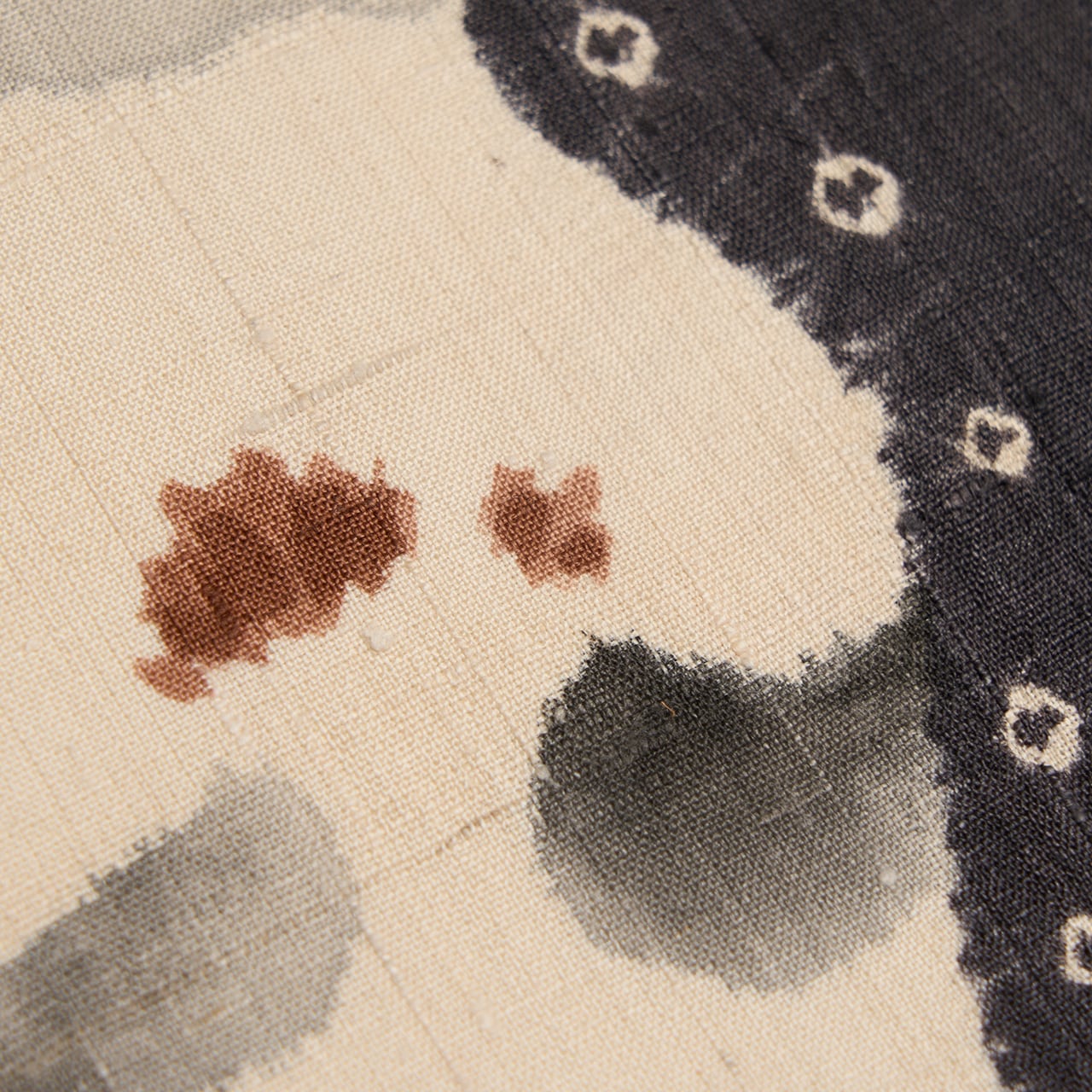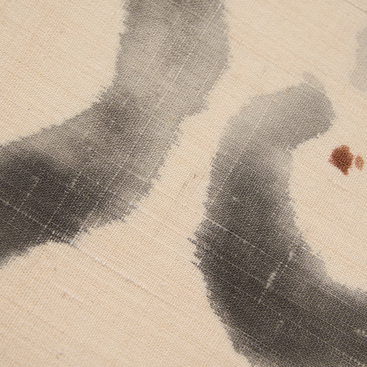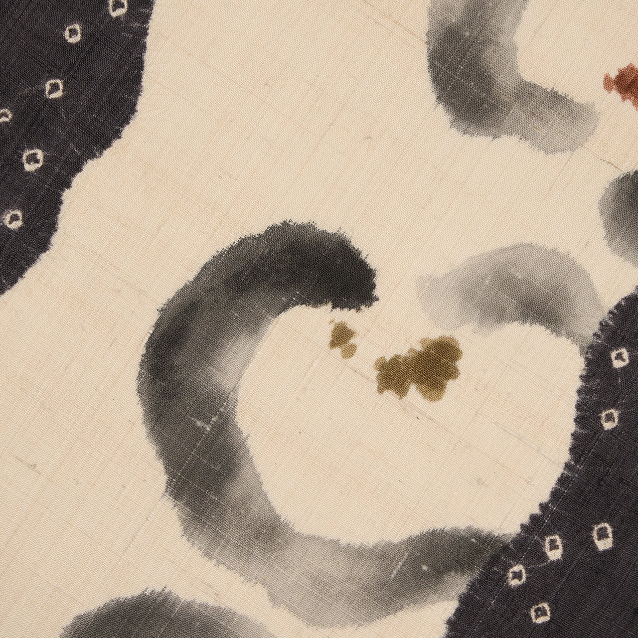緯糸に節のある、しょうざんさんらしい上質な赤城の座繰りの象牙色の紬地のお太鼓の両端が、立涌のような輪郭の絞り染めで藍墨茶色に染め分けられ、中には小さな豆絞りも施されていて、真ん中の象牙色の部分には、濡れ書きのようなタッチの墨書きで大きめの椿のお花が3つ描かれ、たとてもすっきりとした洒脱な雰囲気の九寸名古屋帯です。