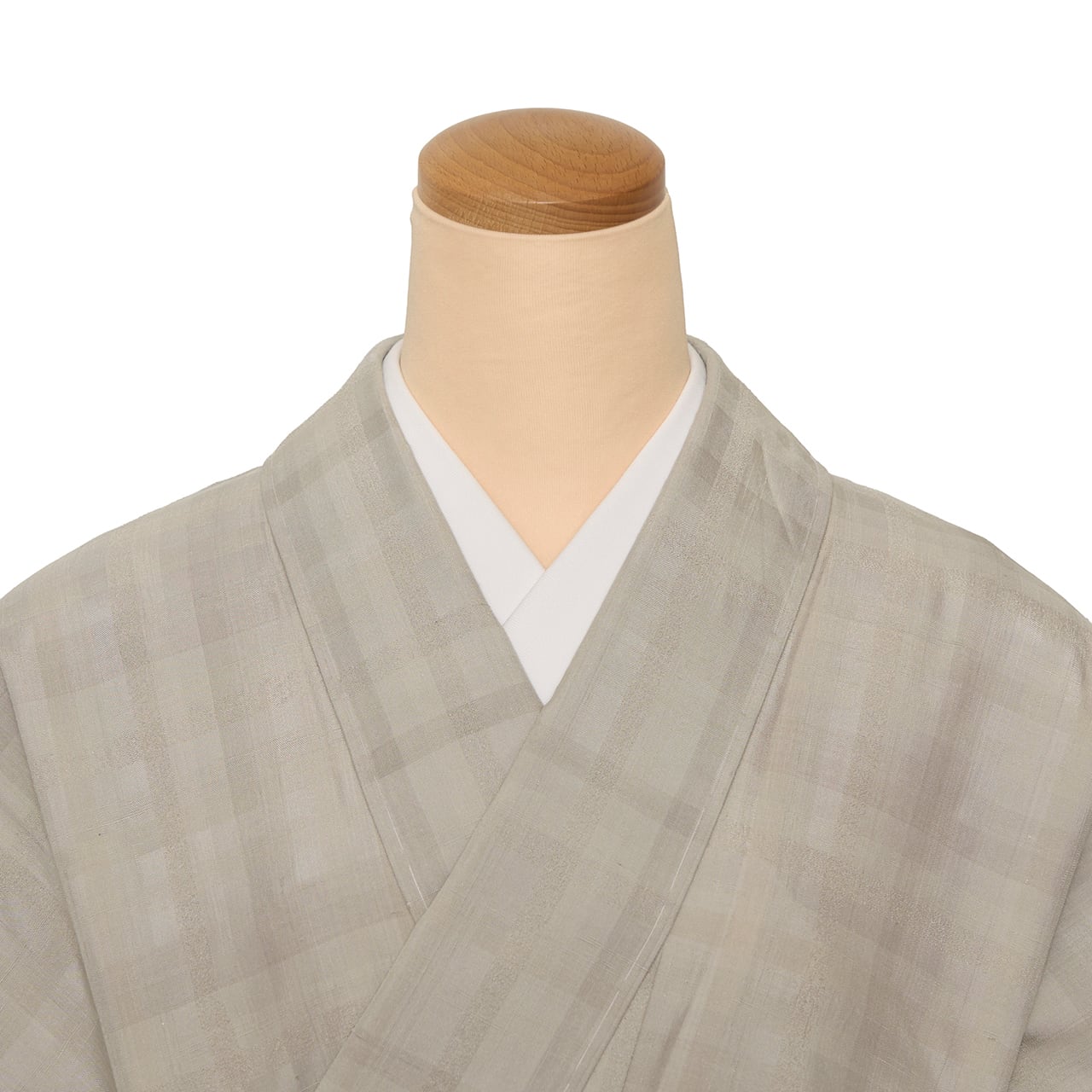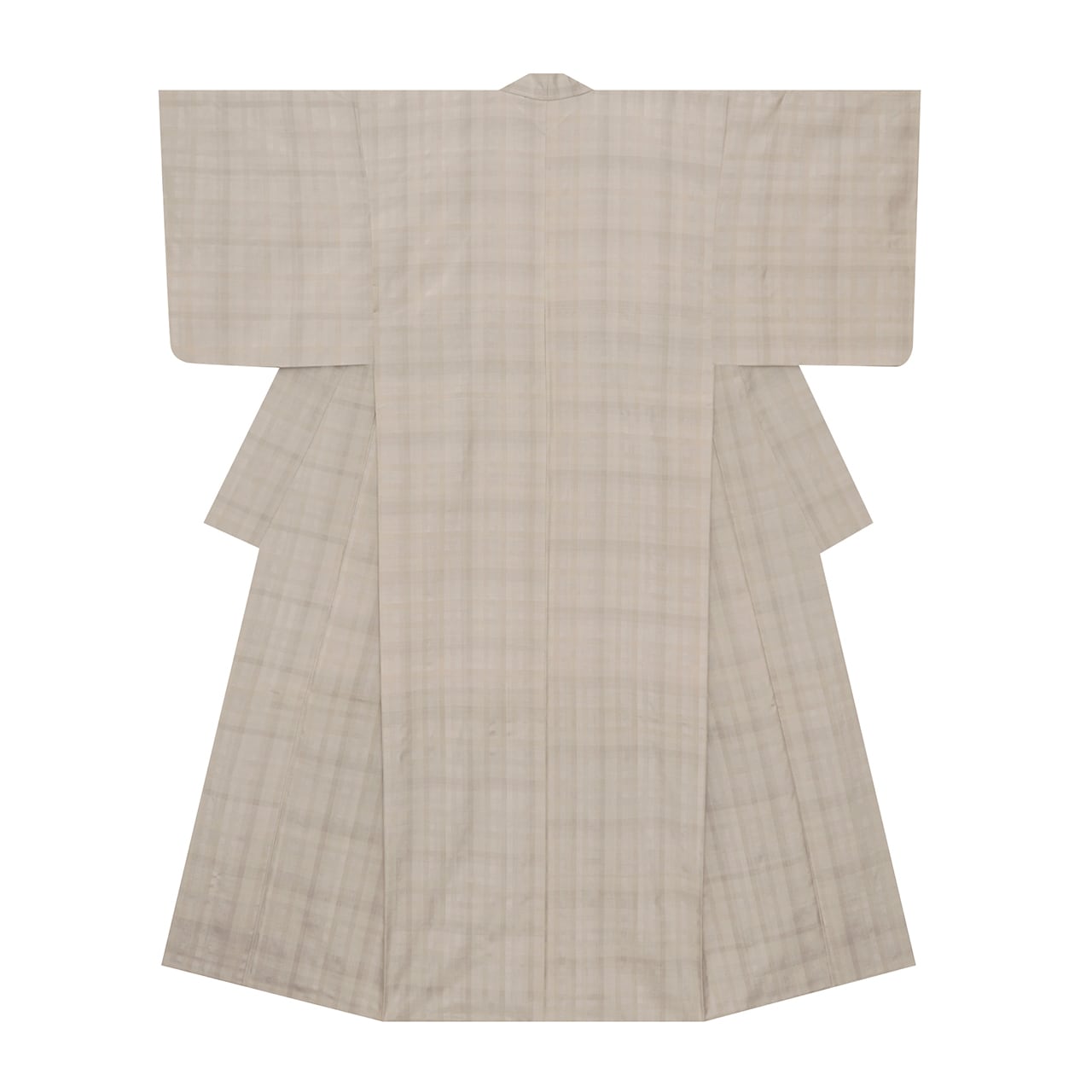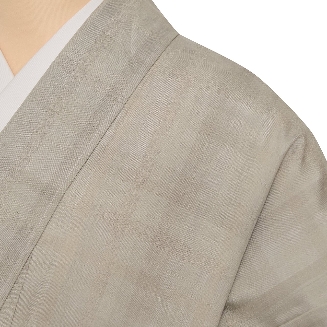 少しだけ光沢のあるしなやかな質感の綺麗なグレー・絹鼠色の地に、それよりほんの少しだけ濃い色の縞が交差して、中くらいの大きさの格子を構成していますが、それにさらにところどころにとても強く撚りを掛けられた地色と同色の糸が織り込まれて、変化のある格子の模様となった、無地感覚のとてもお洒落なお着物です。