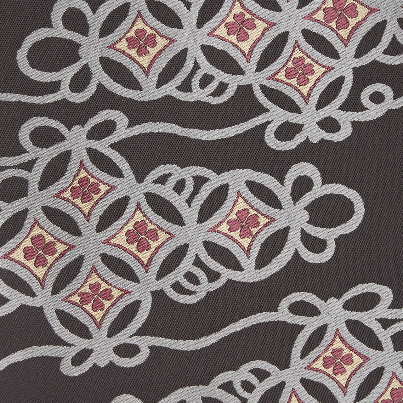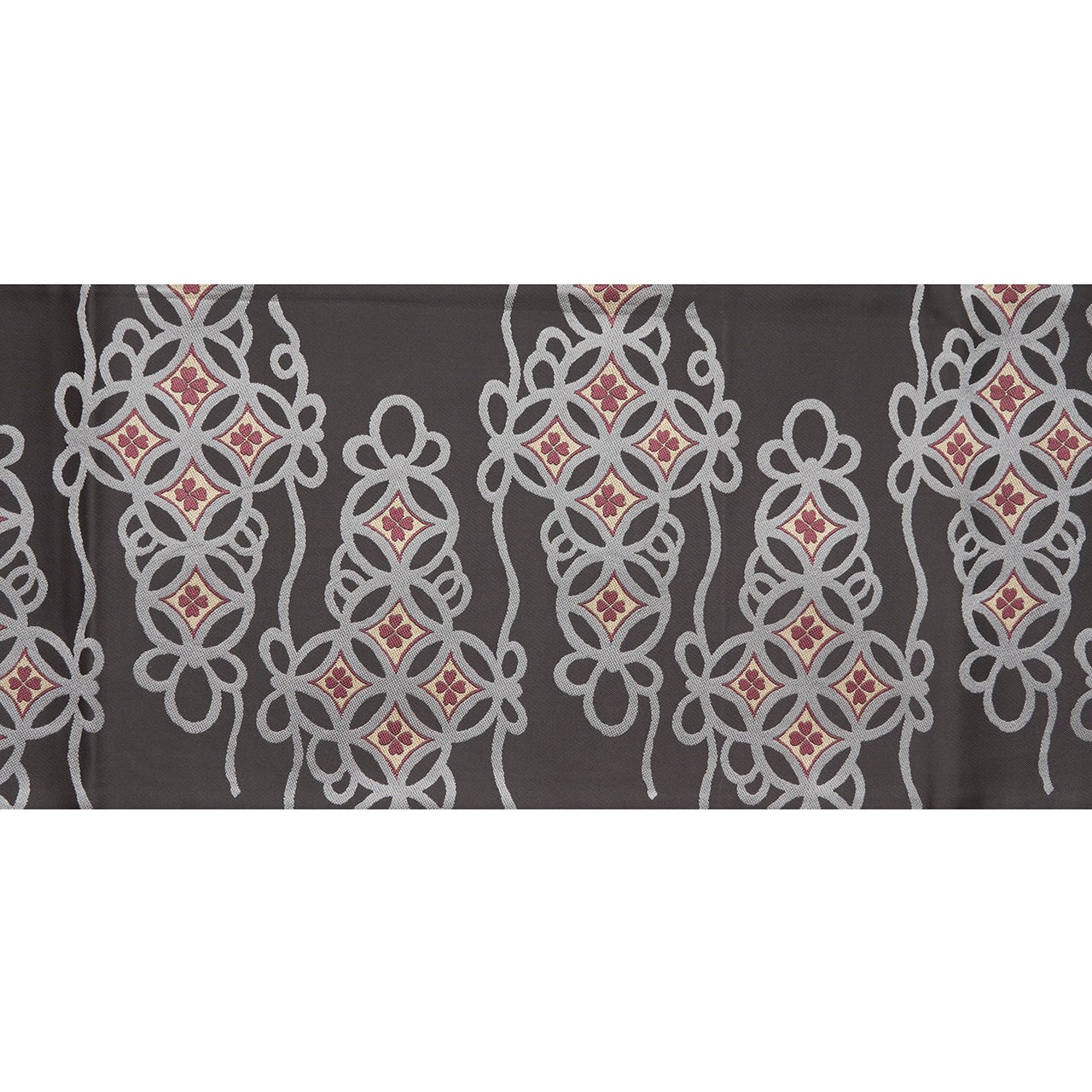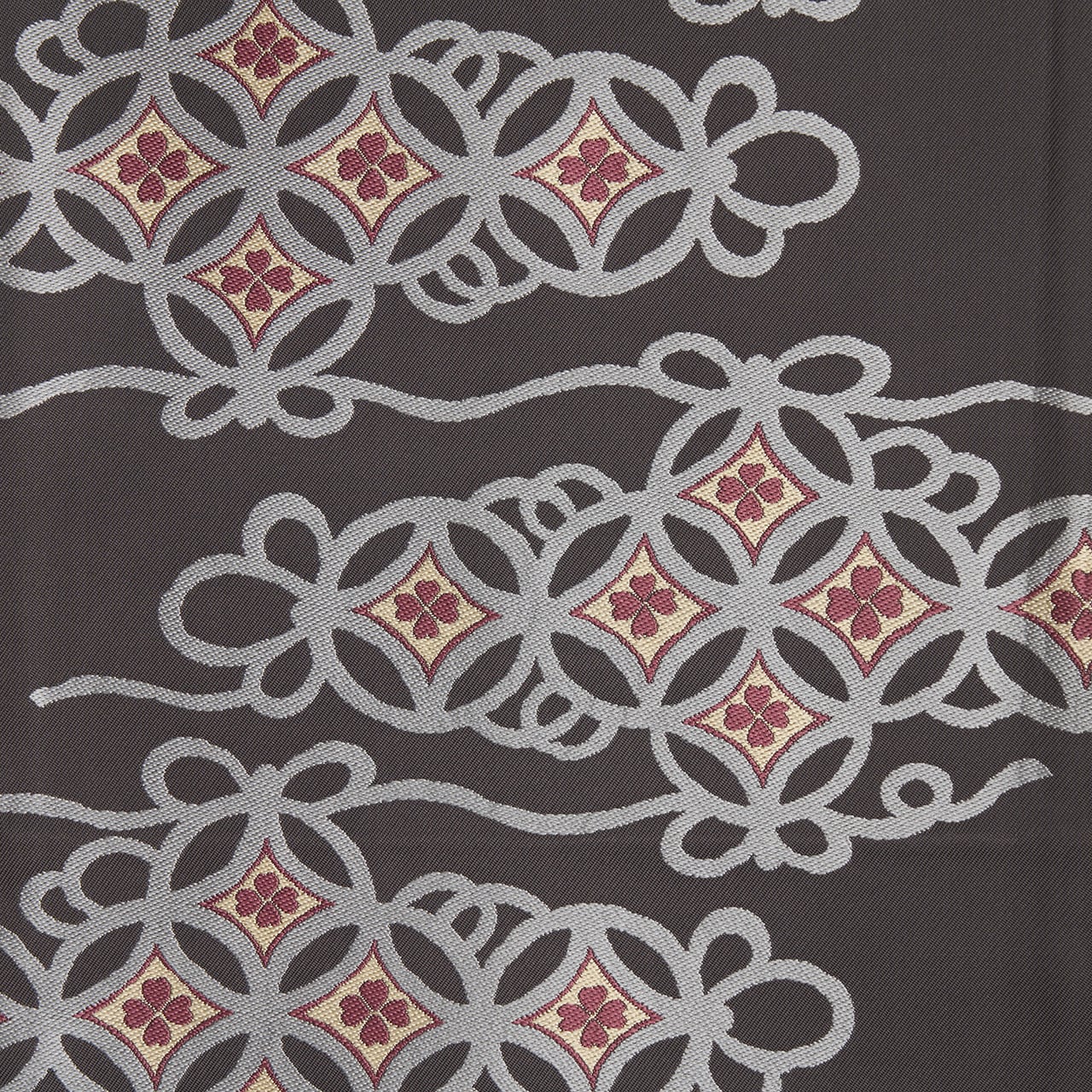 少しだけ藍味のある濃いグレー・藍墨茶色の地に、たなびく雲のような形が灰青色で取られ、その中に七宝繋ぎの模様が置かれ、縁も飾り紐のようにデザインされた図案が錦織りで織られた、どことなく格調高さも感じられる素敵な九寸名古屋帯です。