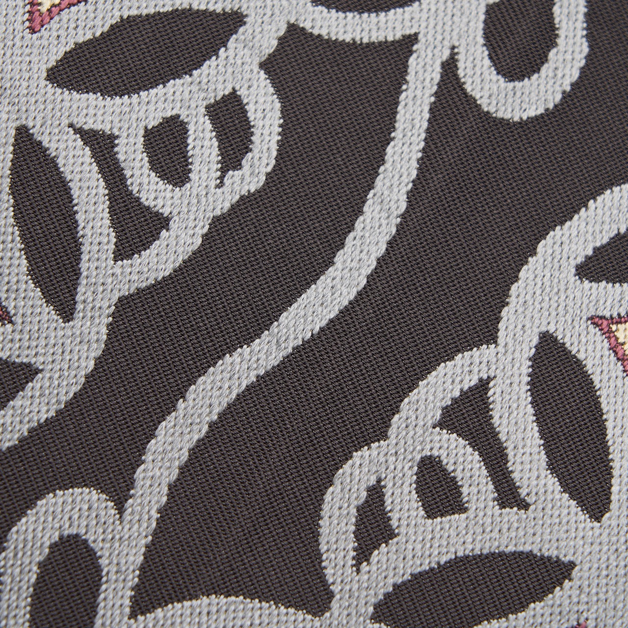 その七宝文様をさらに取り囲むような飾り紐の存在も品格を添えているようで、とても優雅な雰囲気をもった帯となっています。