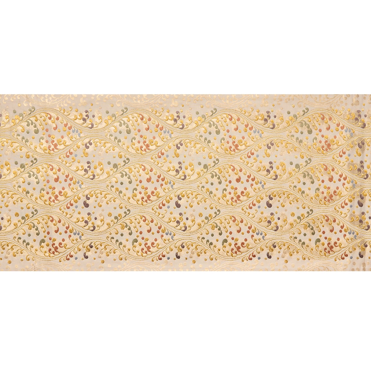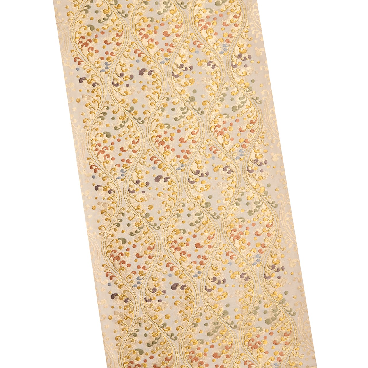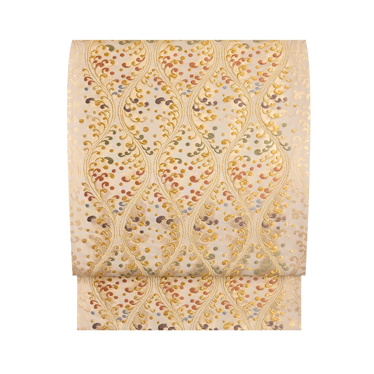 やわらかいクリーム・練色の地に、縦に3列の立涌文様が取られ、それに絡まるように水しぶきをあげる波の模様が織り出されていますが、それが宍色のピンクや半色の薄紫、柳茶の緑、舛花色の青などでとてもカラフルに綺麗に表されていて、華やかさのある素敵な袋帯となっています。
