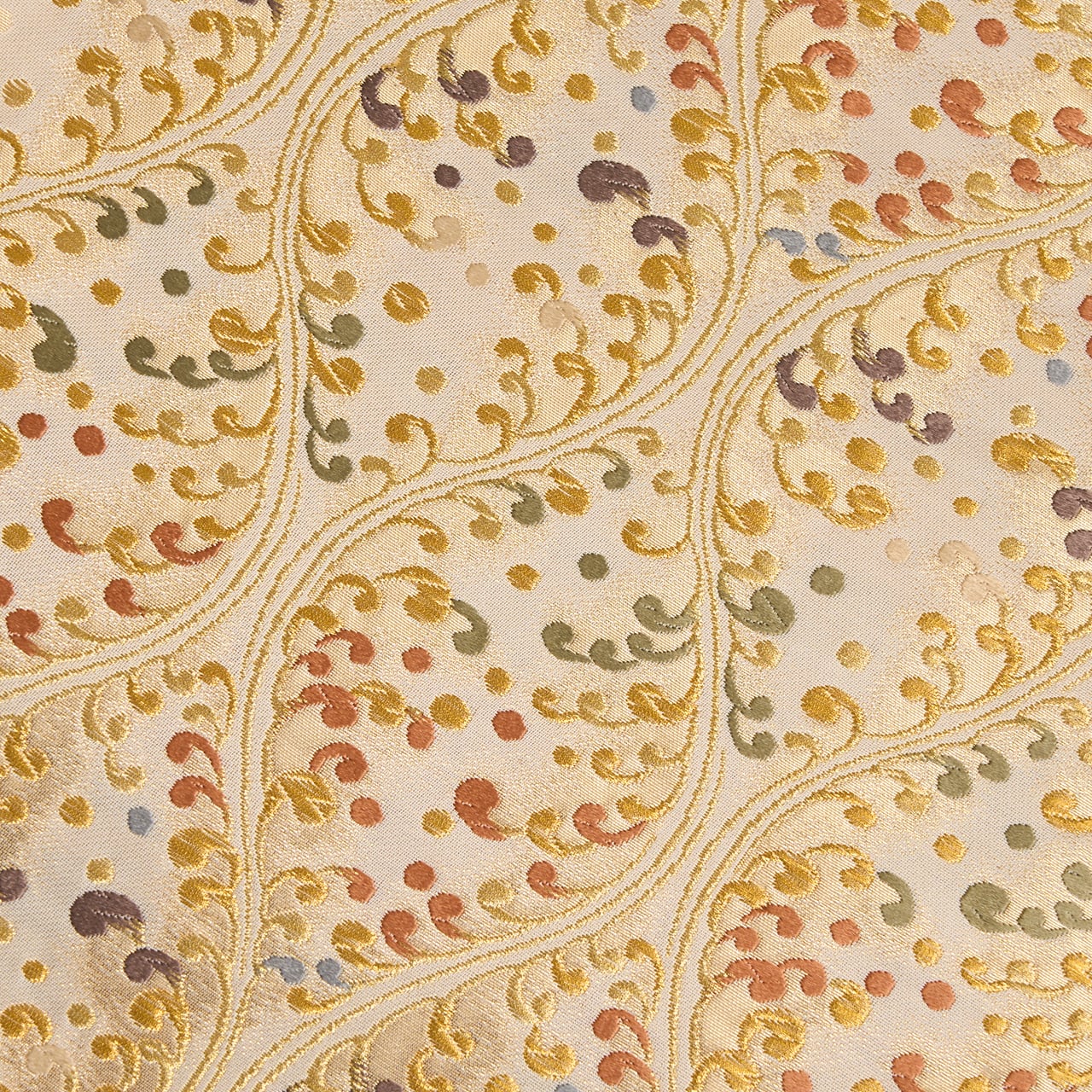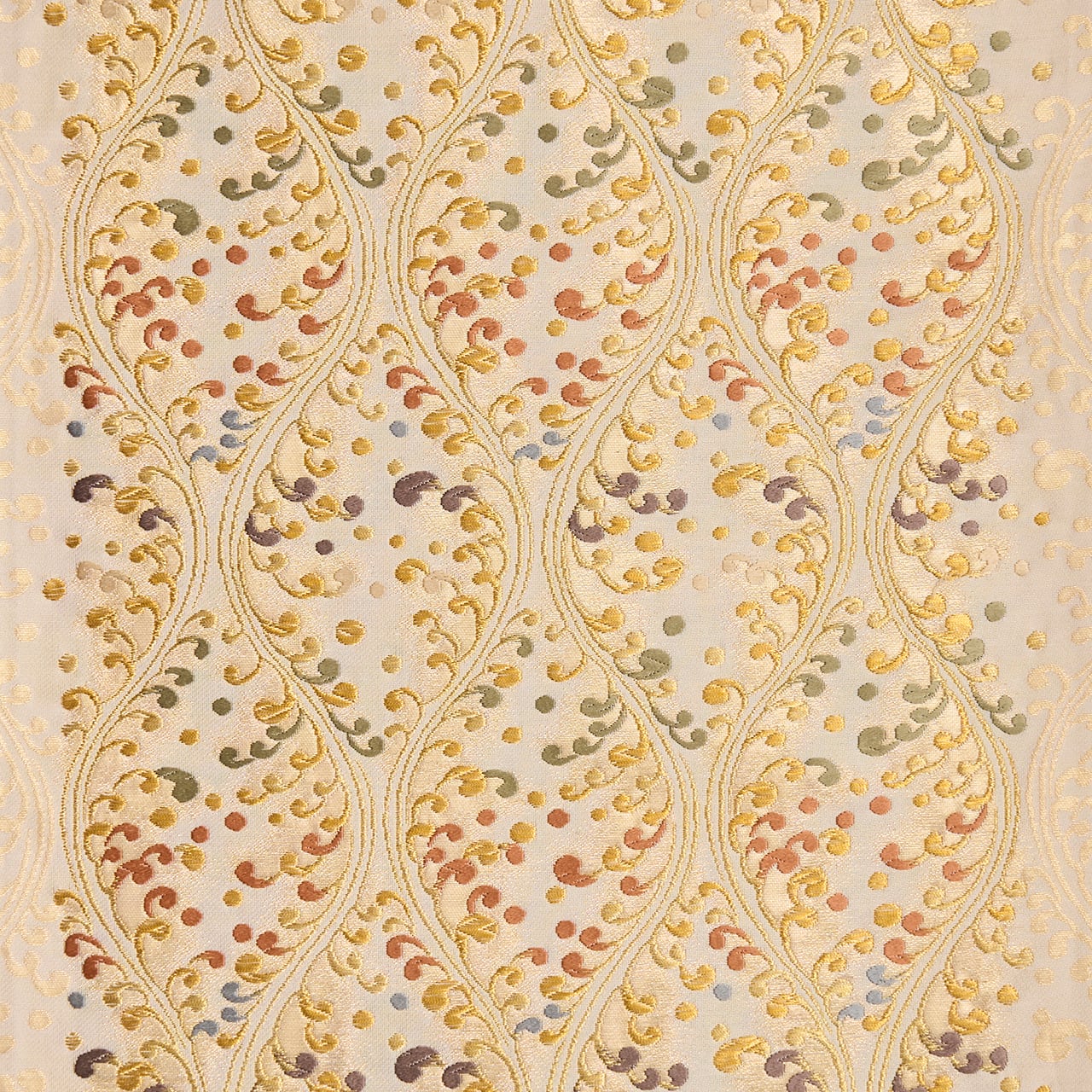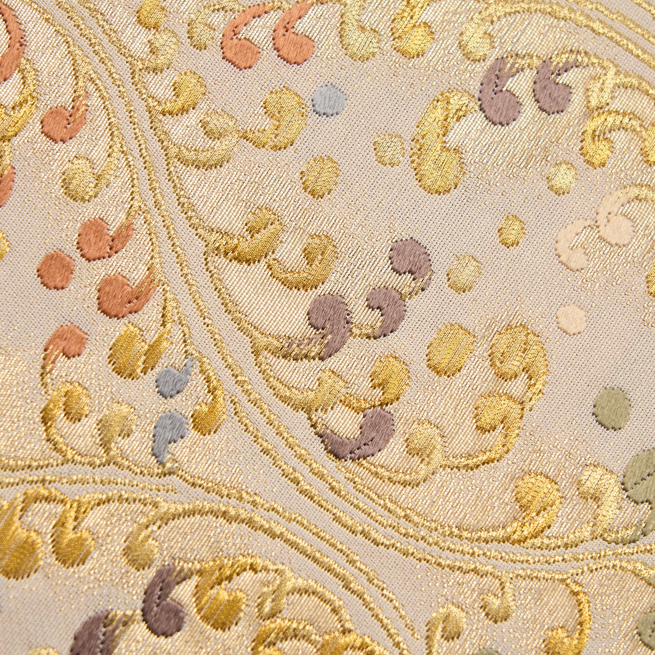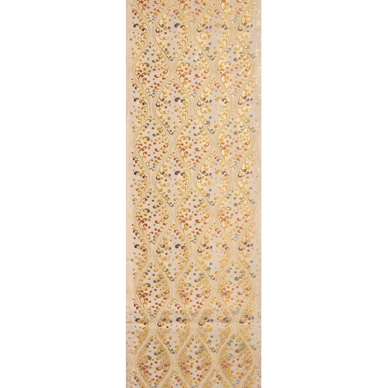 やわらかいクリーム・練色の地に、縦に3列の立涌文様が取られ、それに絡まるように水しぶきをあげる波の模様が織り出されていますが、それが宍色のピンクや半色の薄紫、柳茶の緑、舛花色の青などでとてもカラフルに綺麗に表されていて、華やかさのある素敵な袋帯となっています。