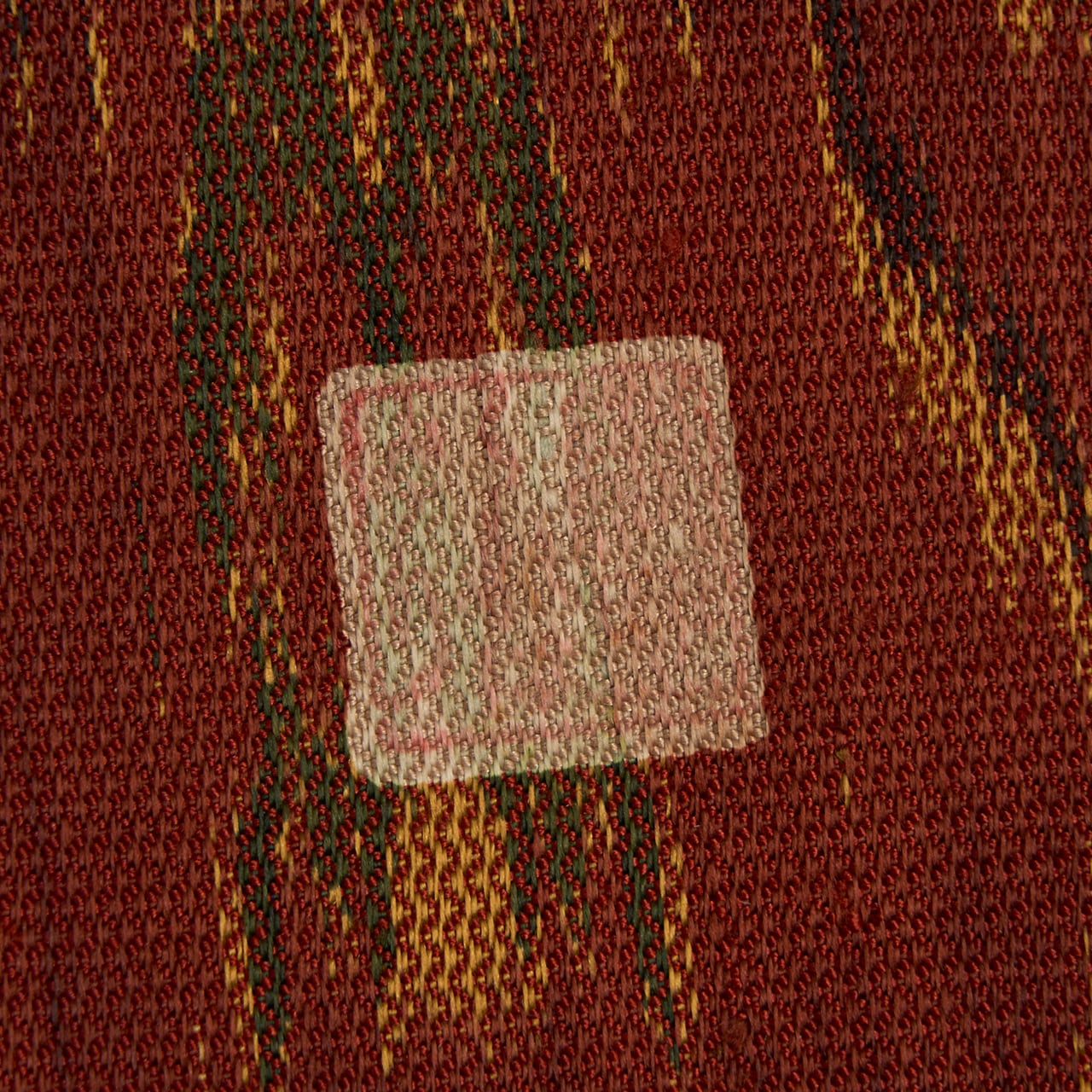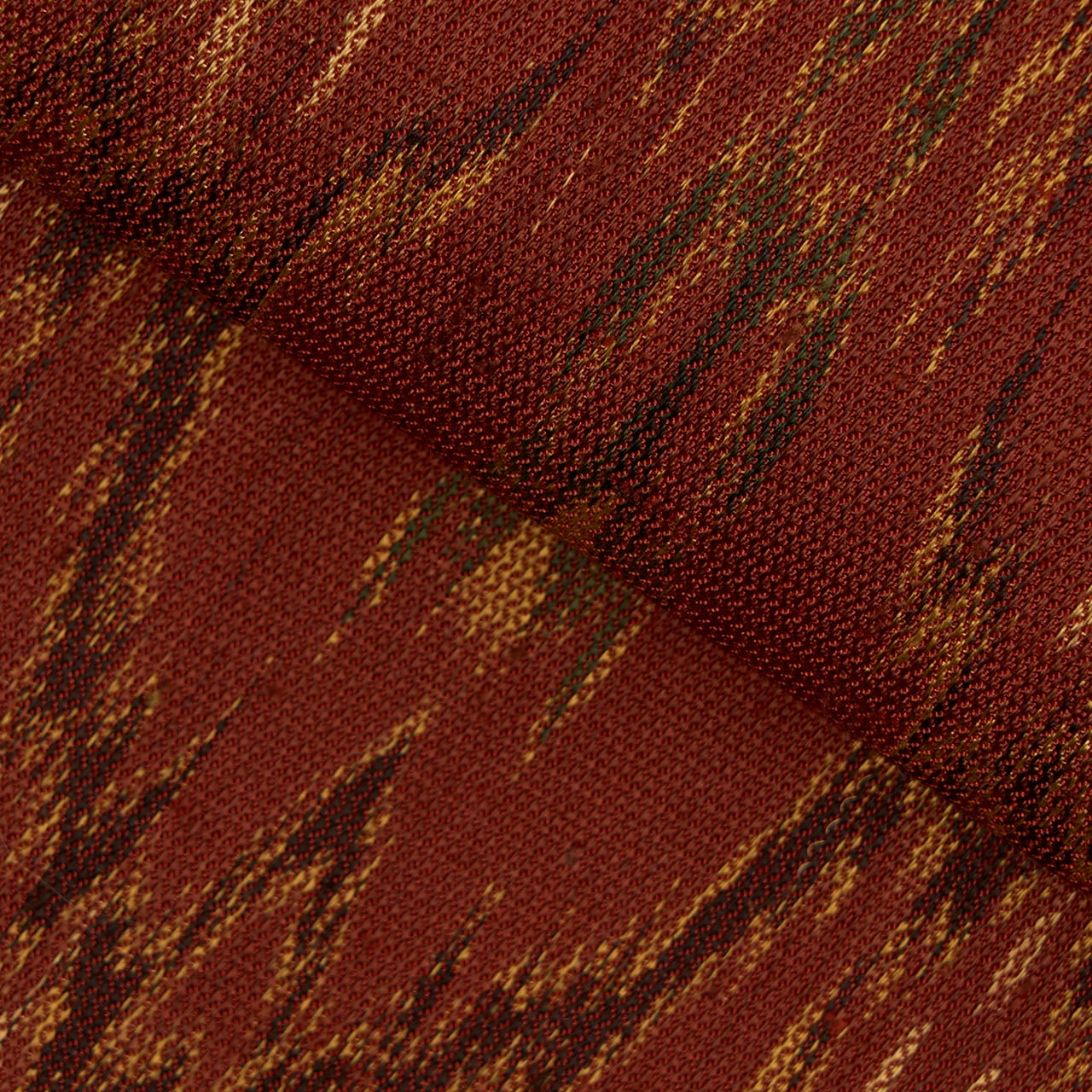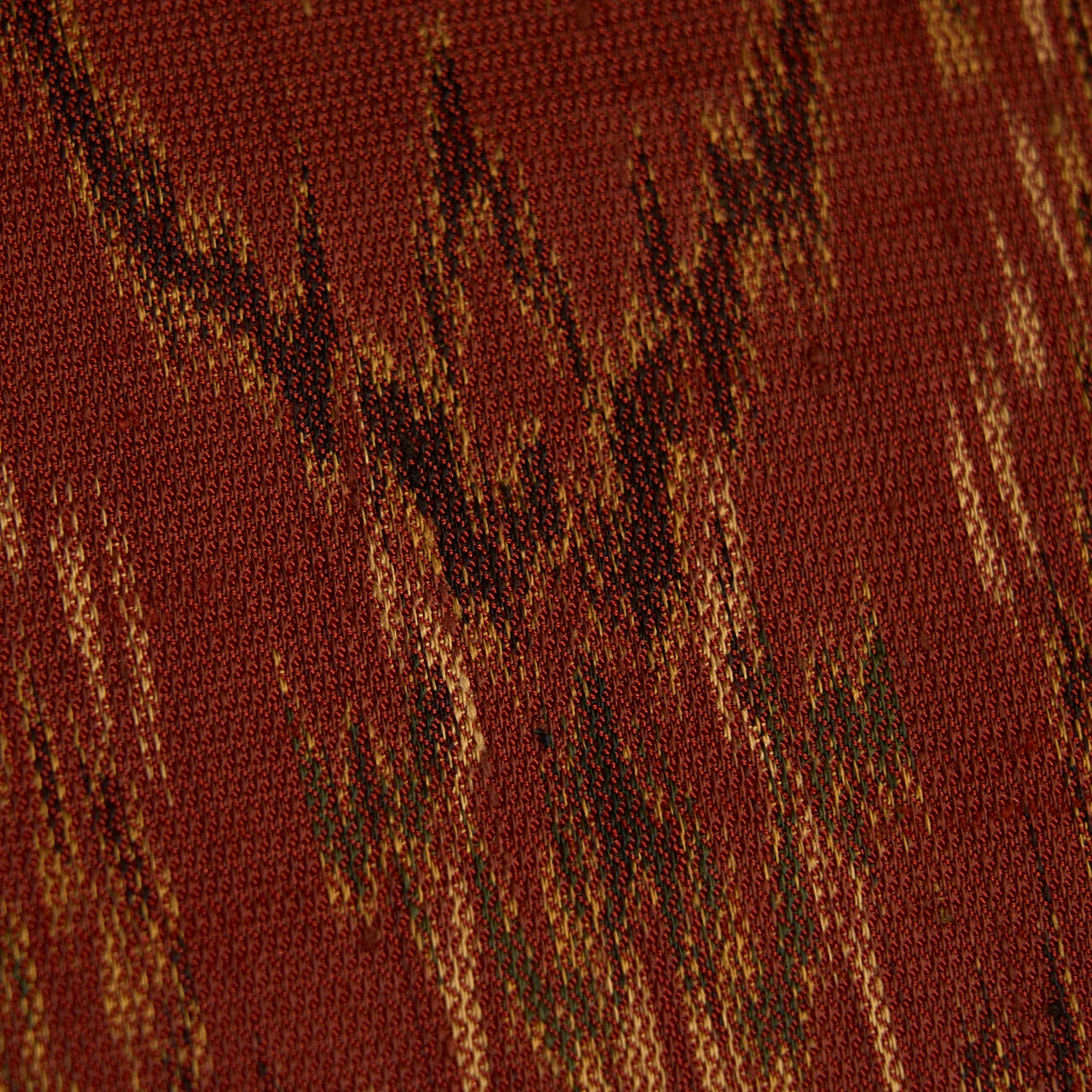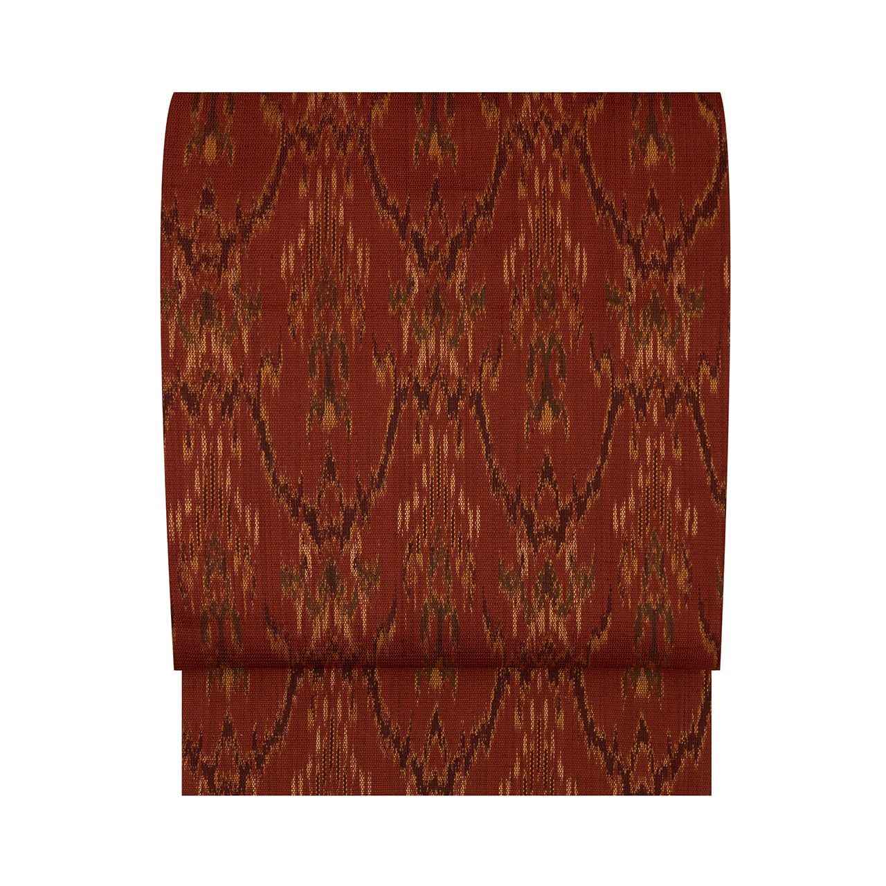 こっくりとした深い赤茶・弁柄色の地に、蒸栗色のクリーム色や革色の深緑、葡萄色などの糸で太子間道の文様が経錦で織り出された、迫力の感じられるような素敵な袋帯です。