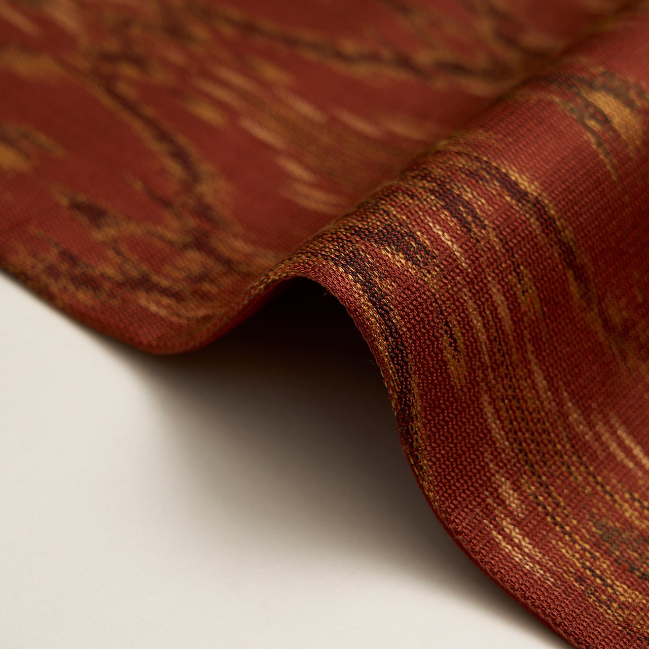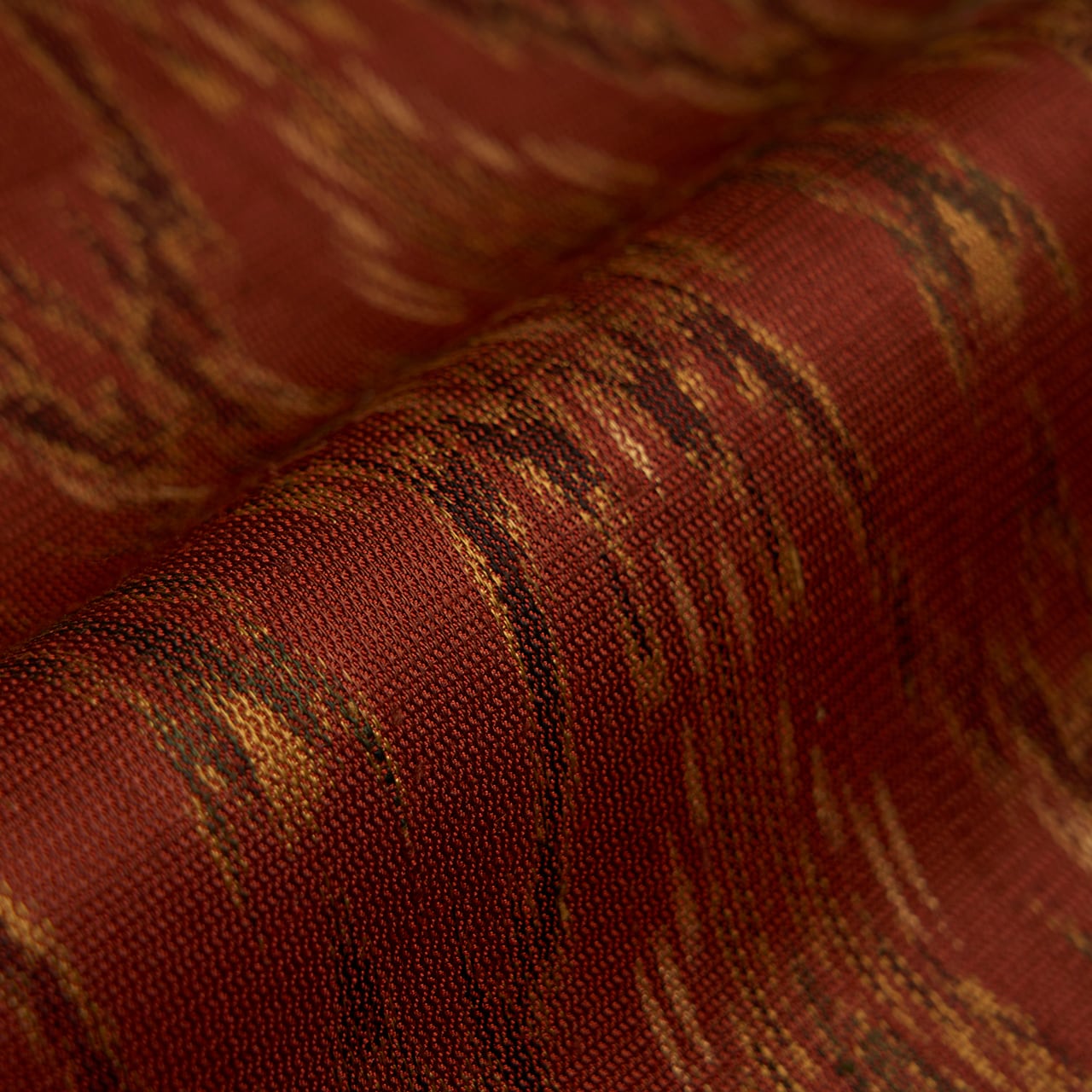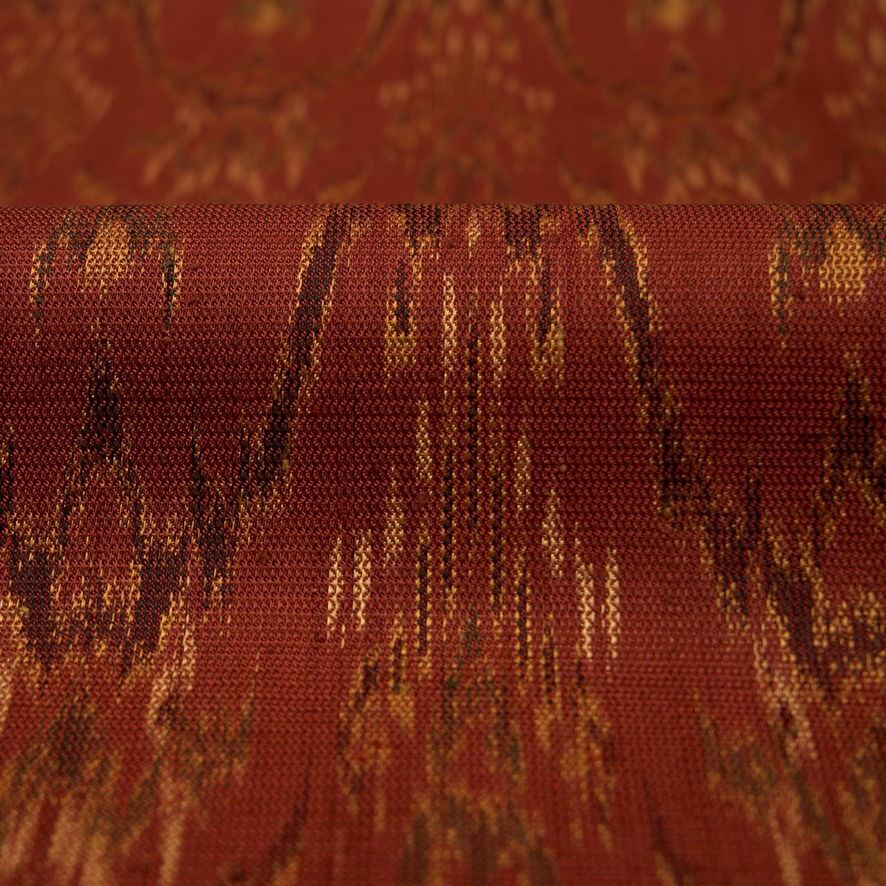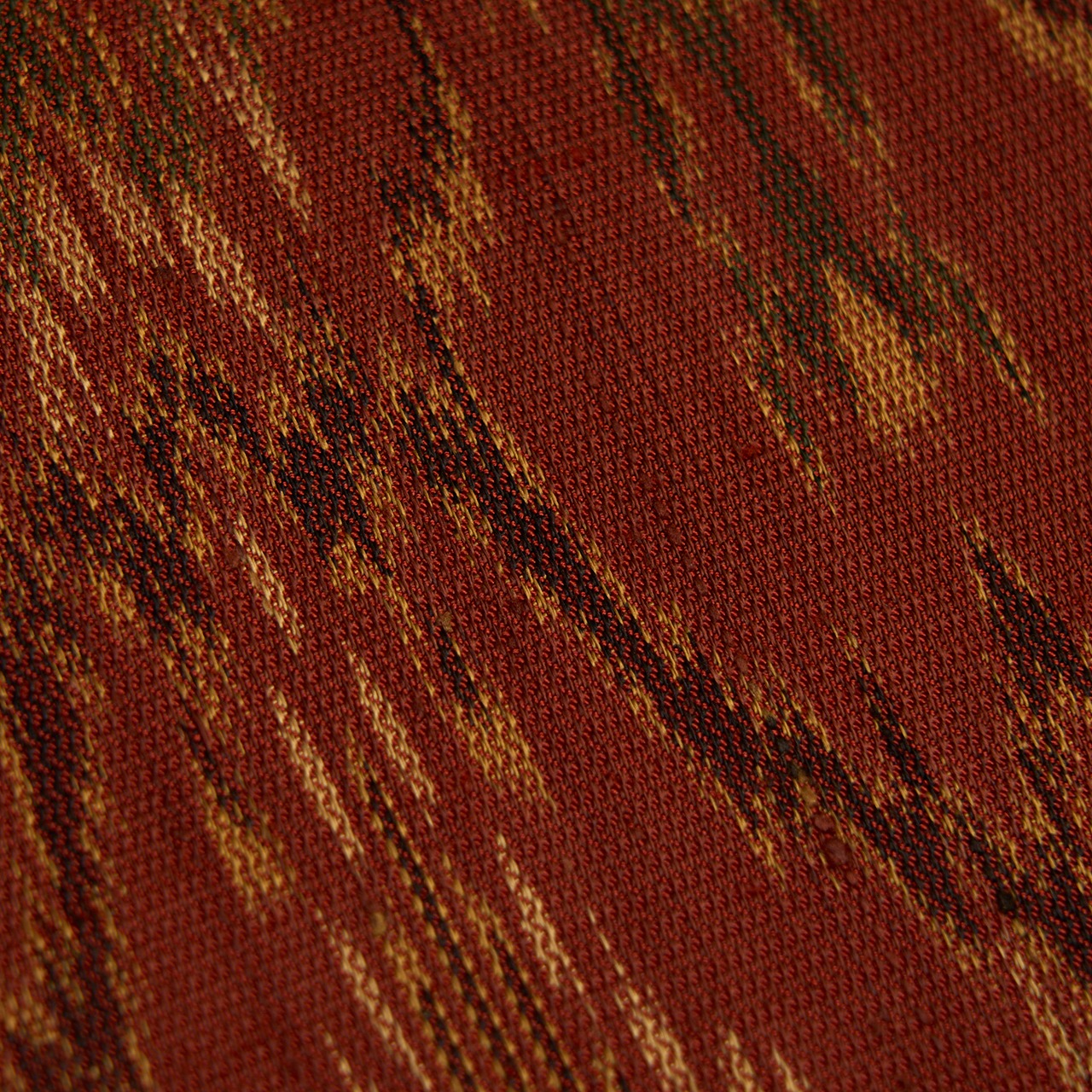 こっくりとした深い赤茶・弁柄色の地に、蒸栗色のクリーム色や革色の深緑、葡萄色などの糸で太子間道の文様が経錦で織り出された、迫力の感じられるような素敵な袋帯です。