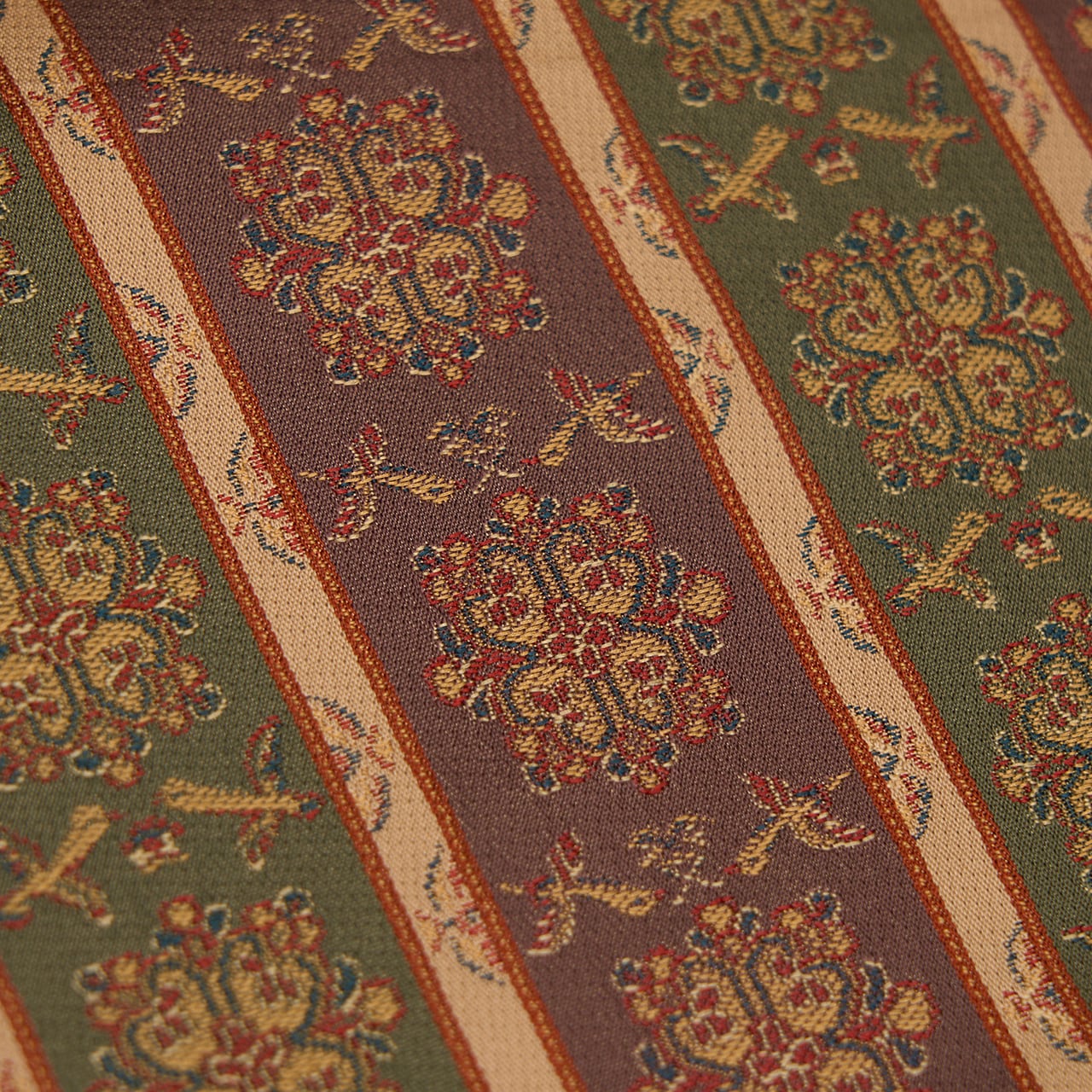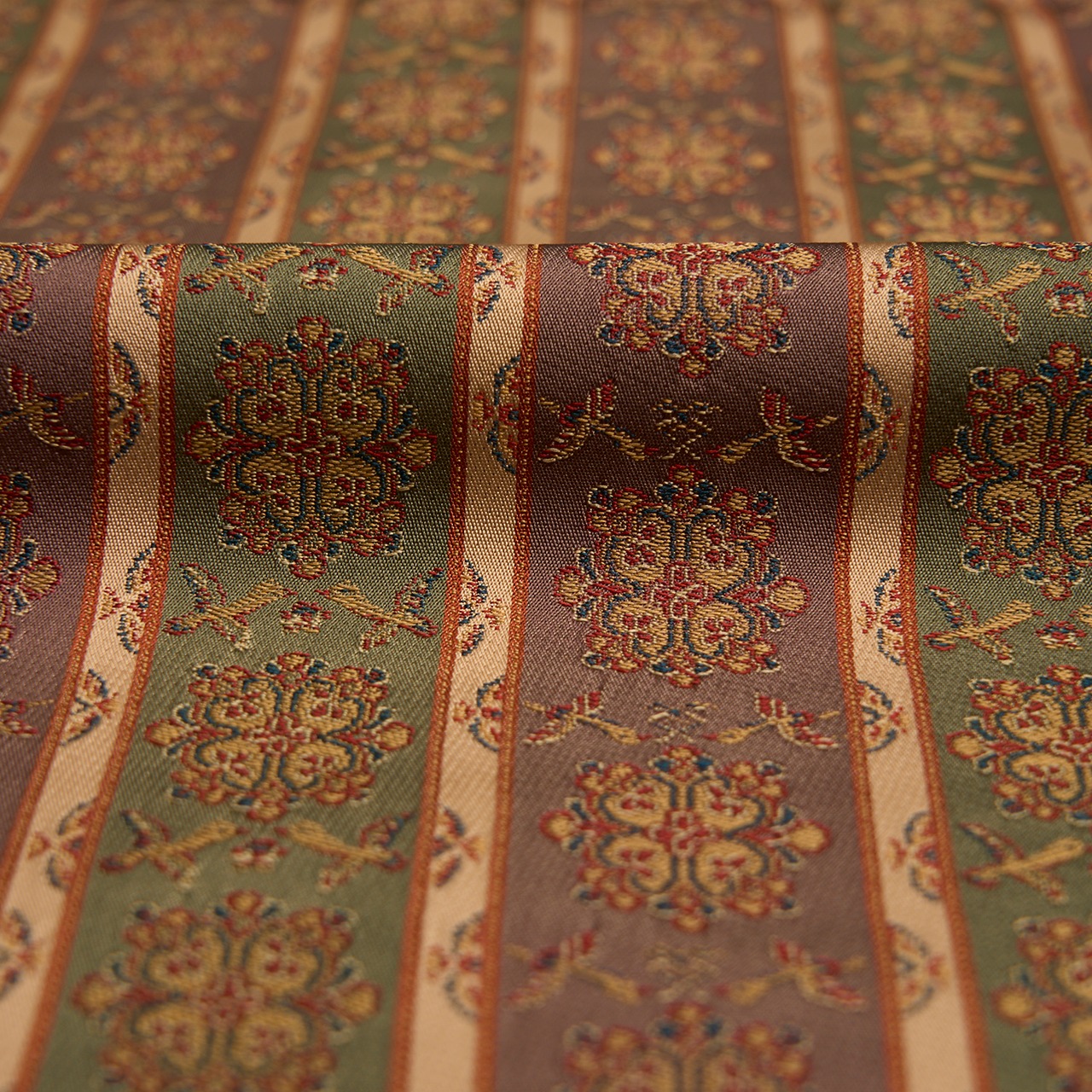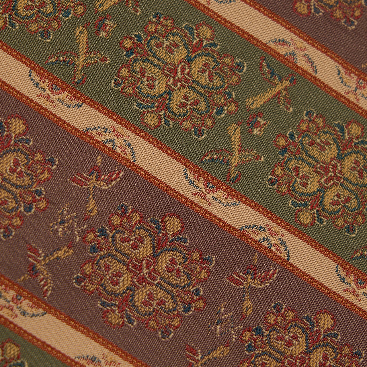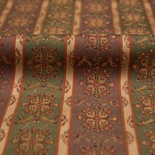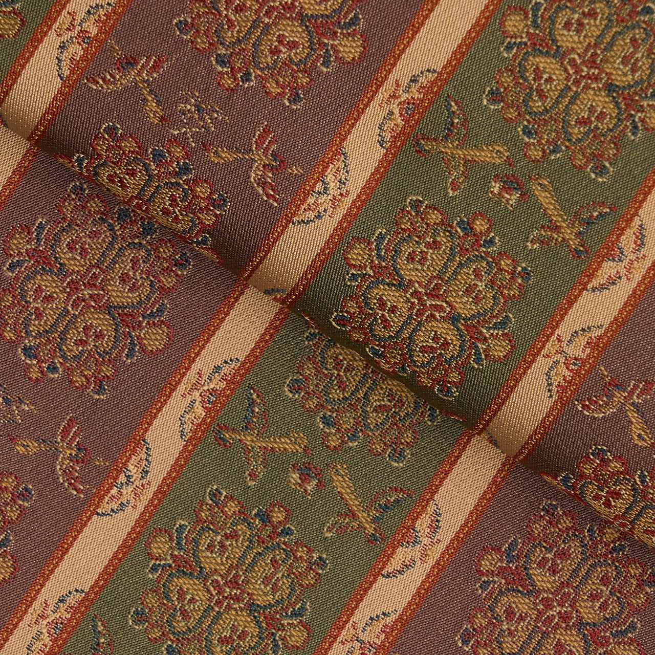 織物の地色を、2色から多色ので区切って縞のように織り出したものを長斑といいますが、それに錦で模様を織り出したものを長斑錦と呼びます。