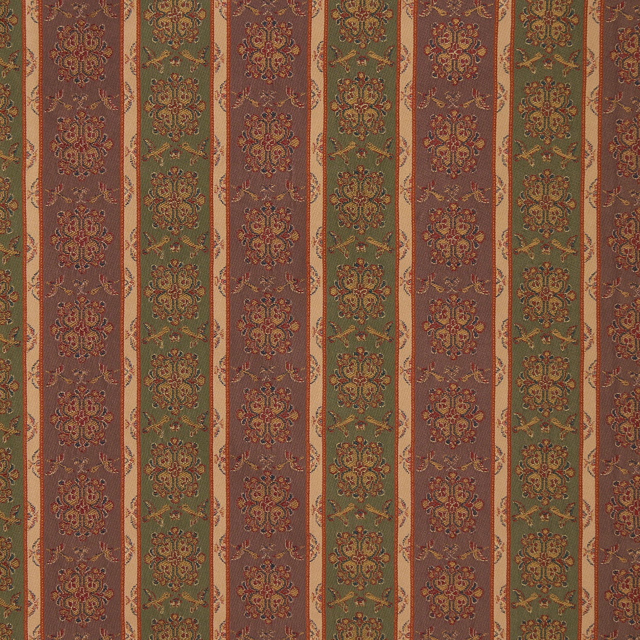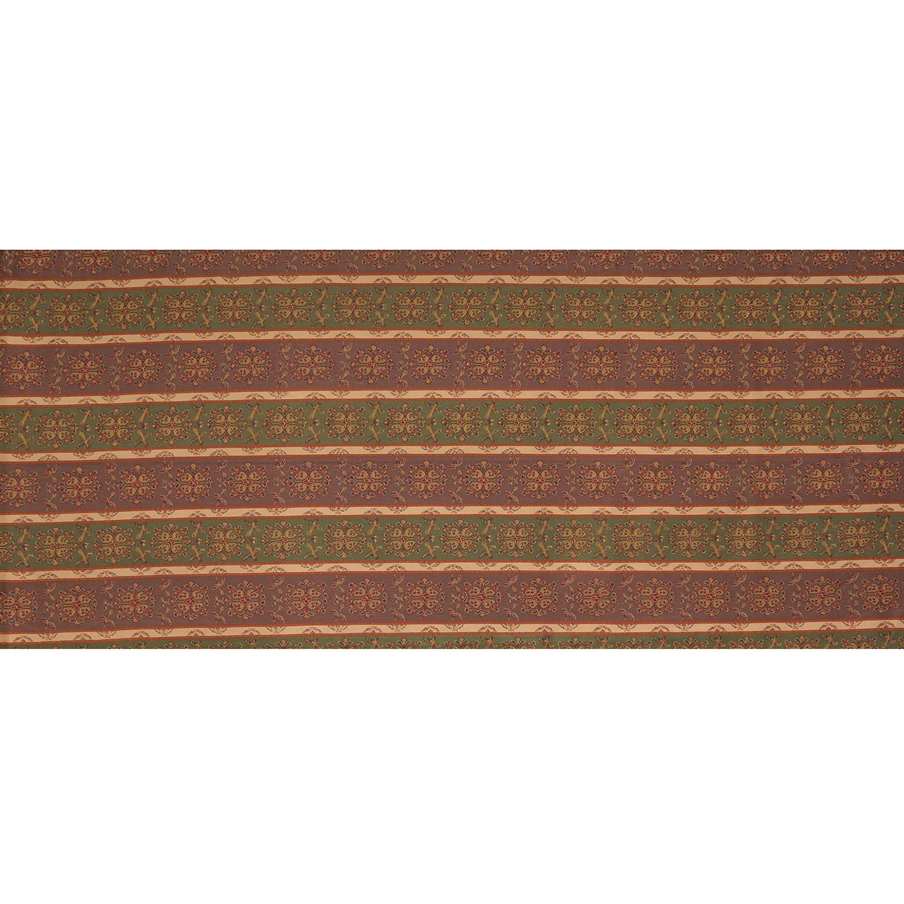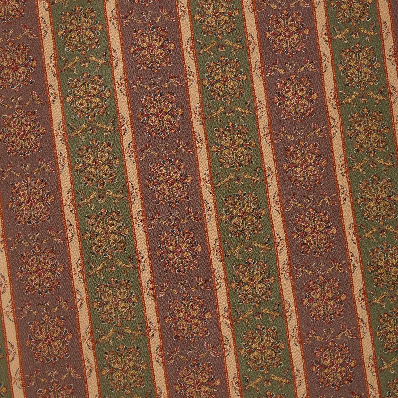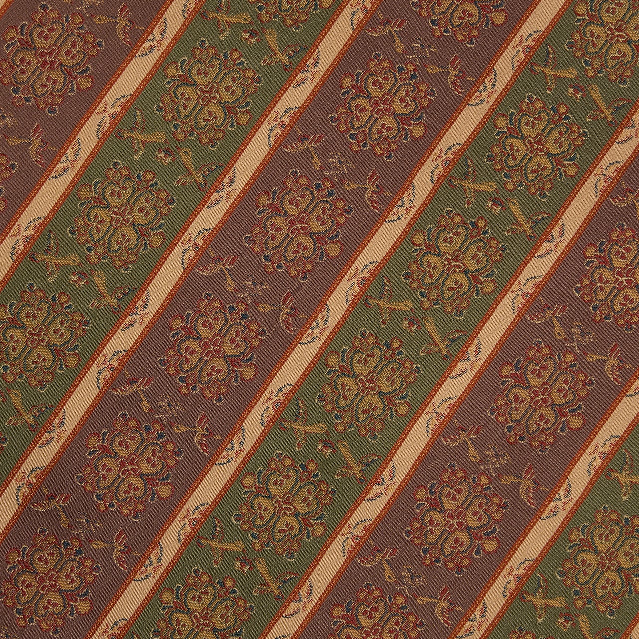 織物の地色を、2色から多色ので区切って縞のように織り出したものを長斑といいますが、それに錦で模様を織り出したものを長斑錦と呼びます。