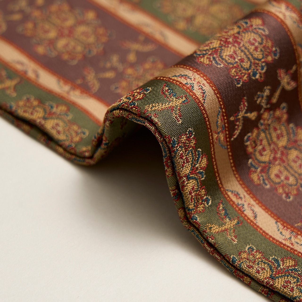 こちらのオリジナルは正倉院御物の肘掛けに覆われた布で、それを龍村平蔵さんやいろいろな機屋さんが復元されていますが、こちらはあらいそさんが復元されたものです。