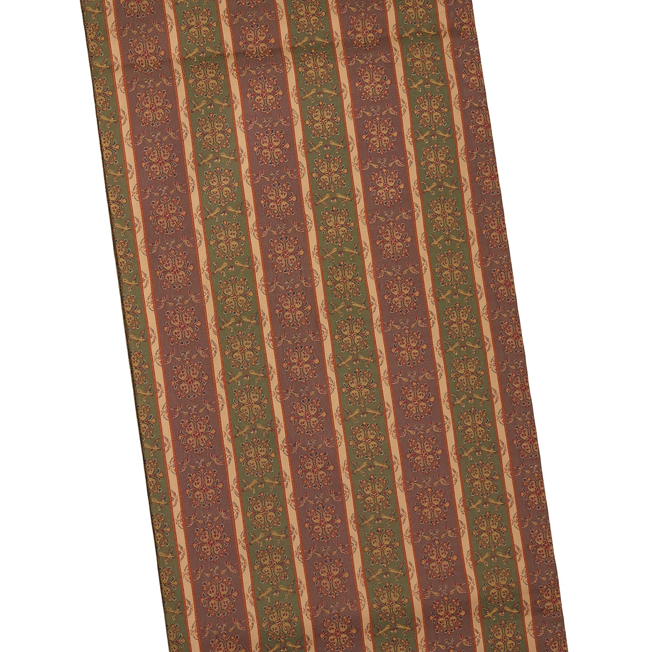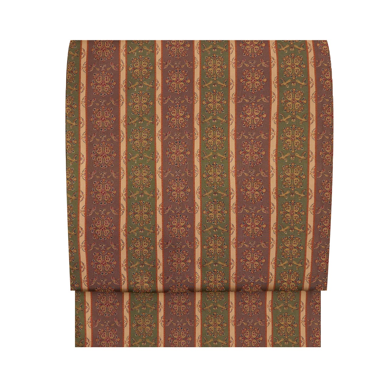麹塵色の薄緑と胡桃染色の赤味のある茶の2色の地色に、間には洗柿色の縞が配置され、向鳥と華文が錦で織り出された、代表的な名物裂のひとつである「唐花雙鳥長斑錦(からはなそうちょうちょうはんきん)」の文様の全通の九寸の開名古屋帯です。