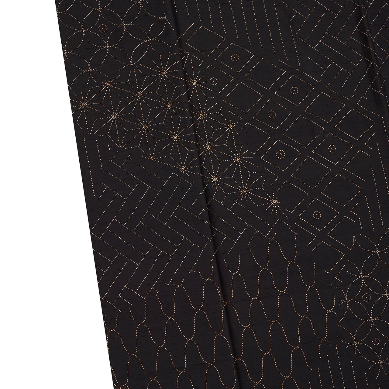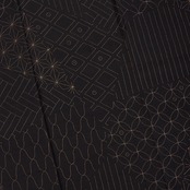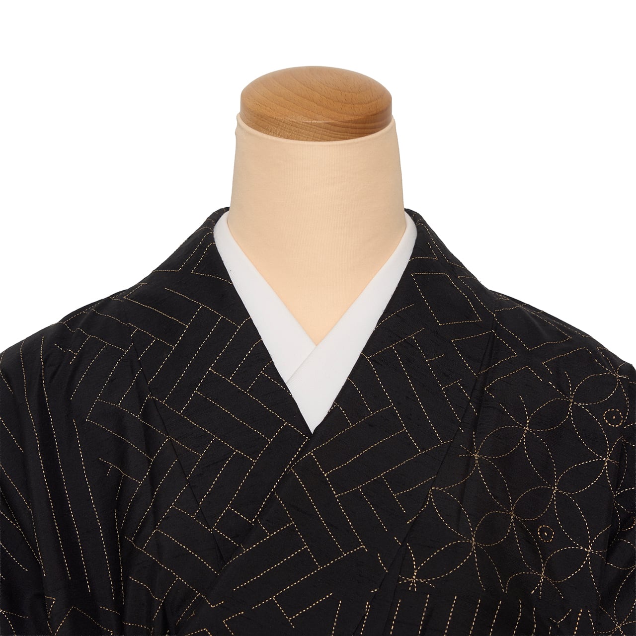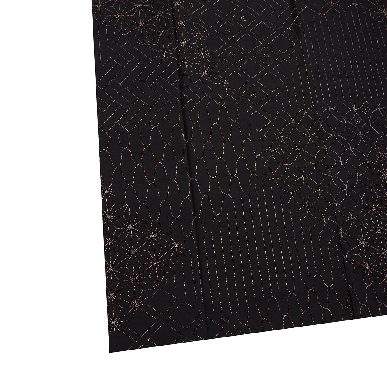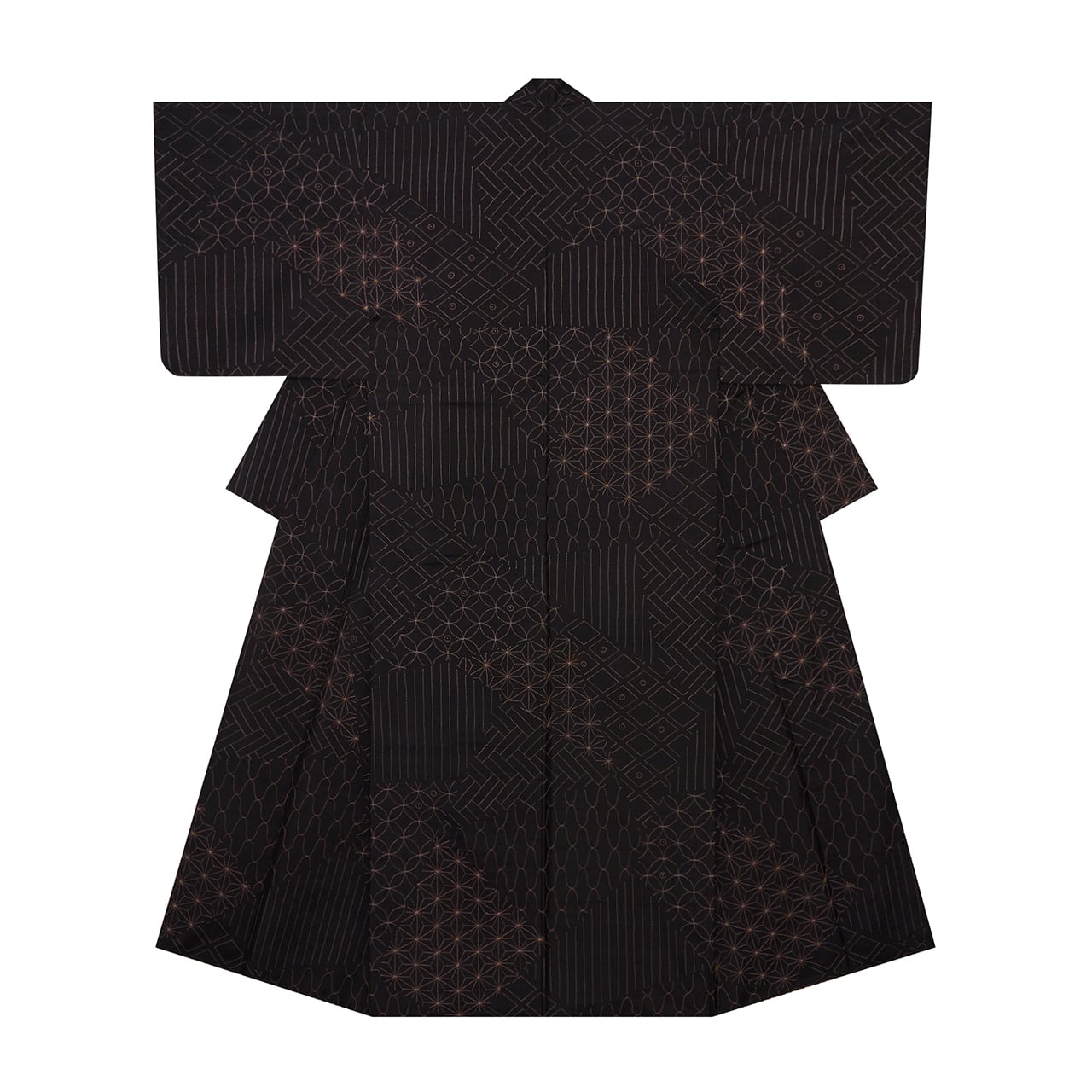横に少しだけ小さな節が見られる白山紬のようなさらりとした手触りの生地が、真っ黒というよりは少し赤味が感じられるような黒紅色に染められ、全体的に裂取りのように大きく区切られた中に、麻の葉模様、七宝繋ぎ、縞模様、網代、菱、波模様などの刺子が伽羅色の糸で全面に施された、手仕事の味わいのあるとても素敵なお着物です。