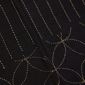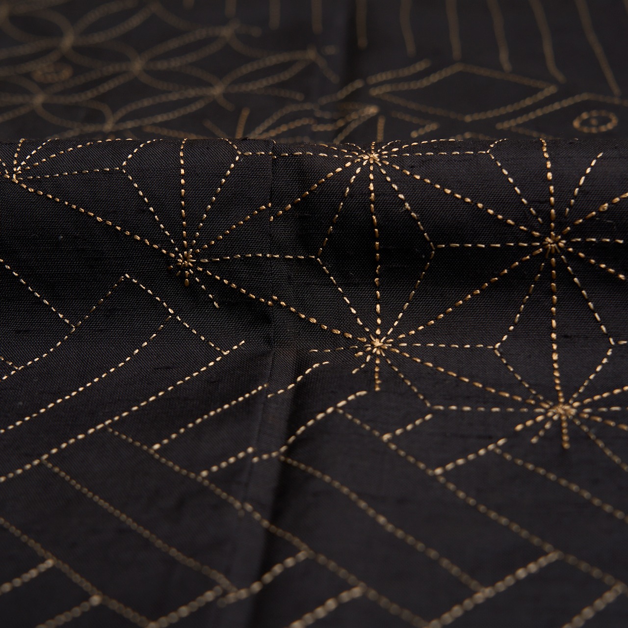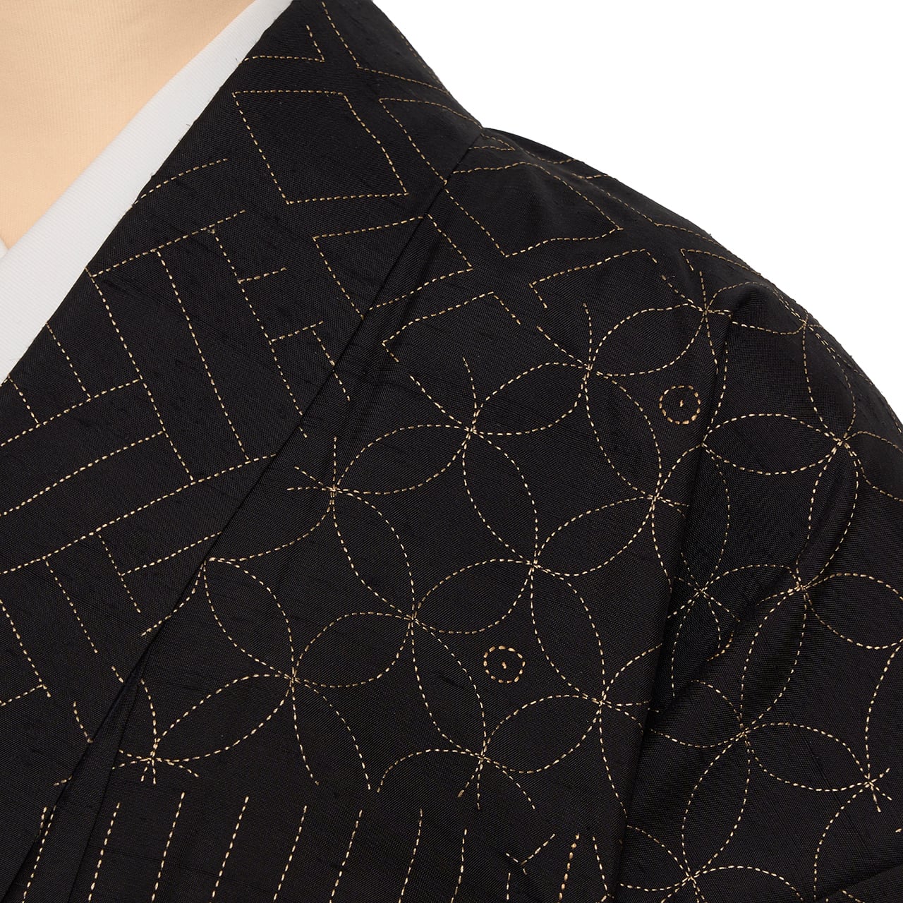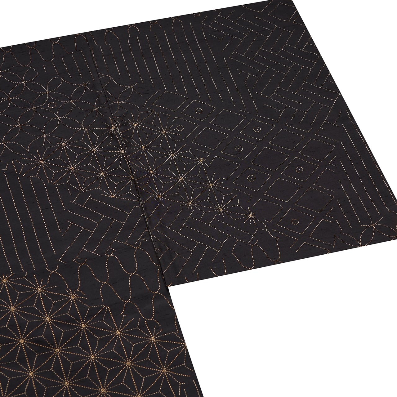 横に少しだけ小さな節が見られる白山紬のようなさらりとした手触りの生地が、真っ黒というよりは少し赤味が感じられるような黒紅色に染められ、全体的に裂取りのように大きく区切られた中に、麻の葉模様、七宝繋ぎ、縞模様、網代、菱、波模様などの刺子が伽羅色の糸で全面に施された、手仕事の味わいのあるとても素敵なお着物です。