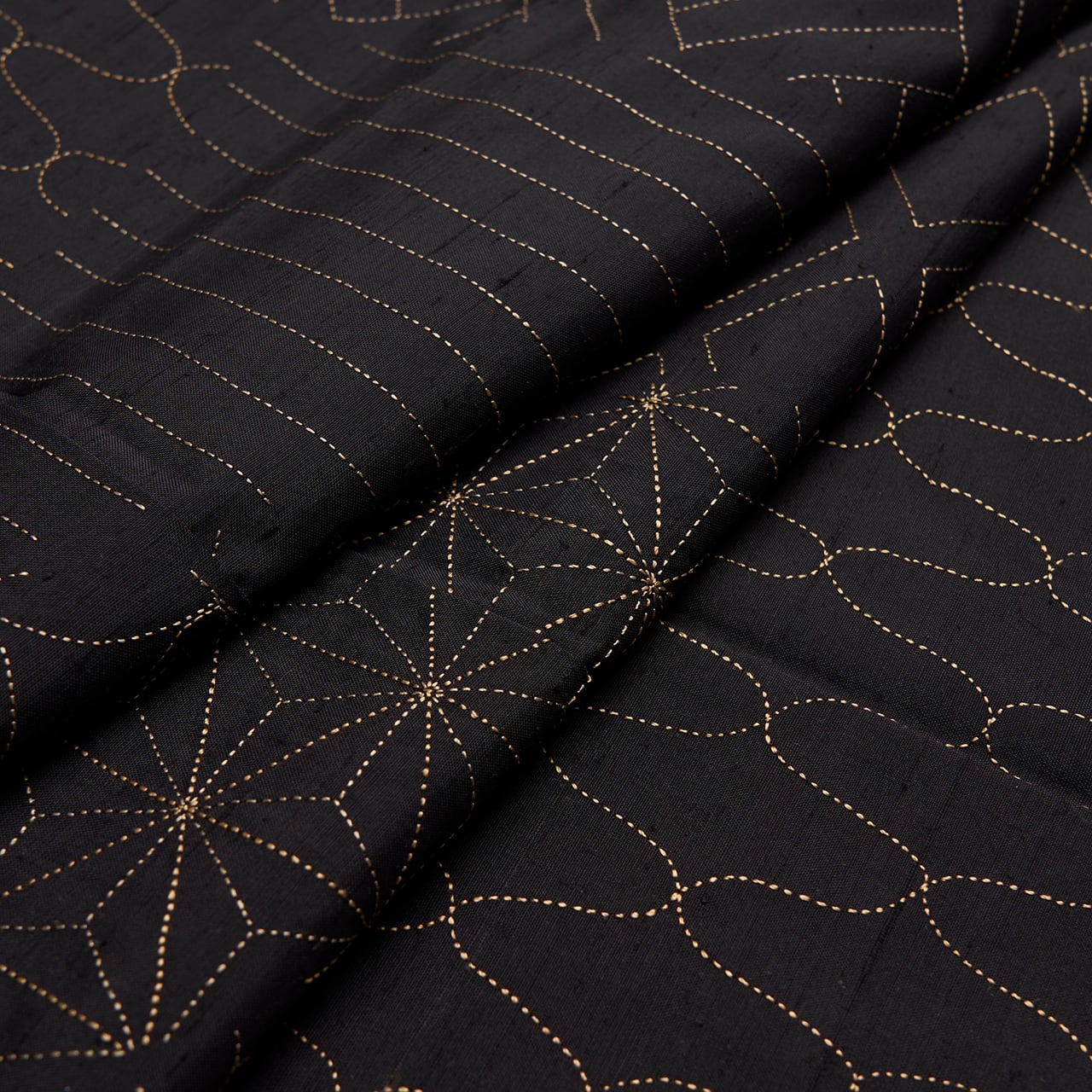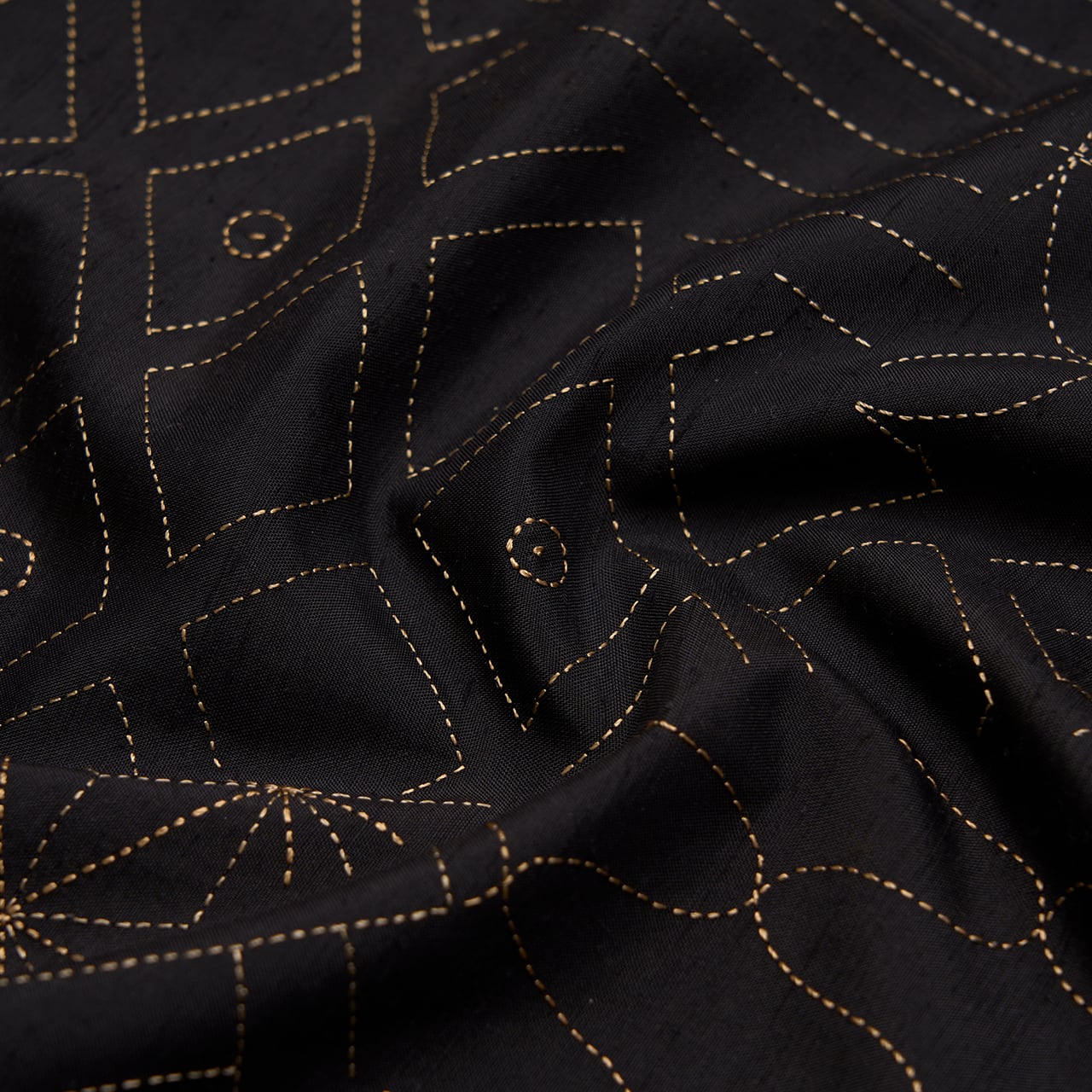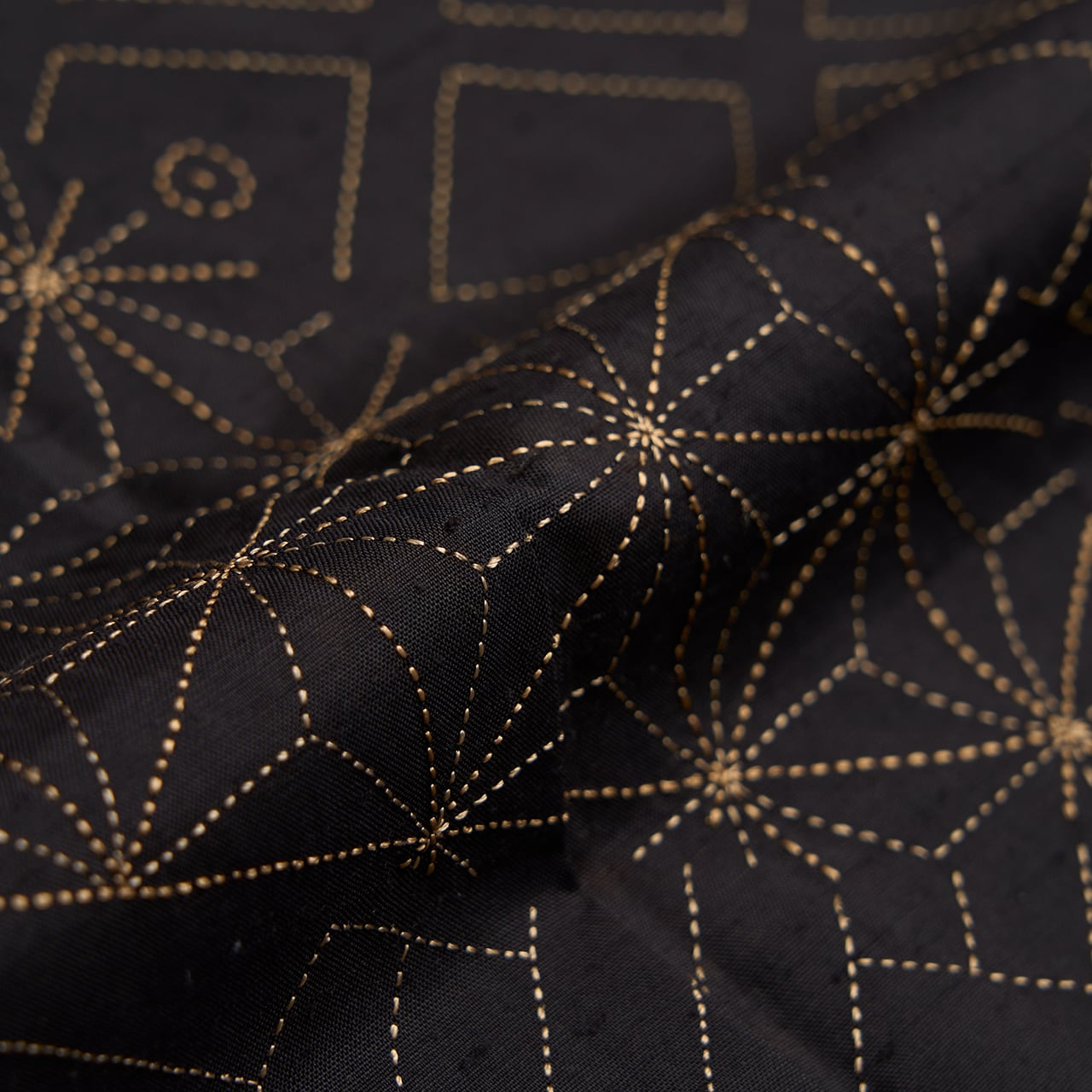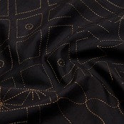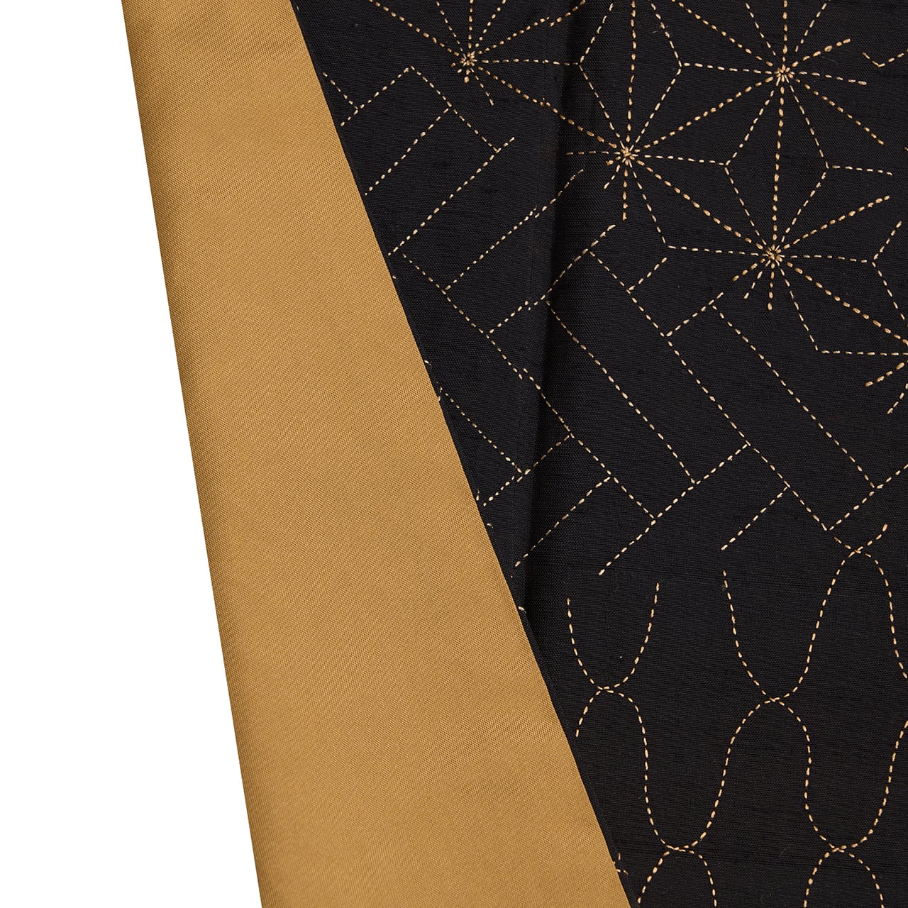 横に少しだけ小さな節が見られる白山紬のようなさらりとした手触りの生地が、真っ黒というよりは少し赤味が感じられるような黒紅色に染められ、全体的に裂取りのように大きく区切られた中に、麻の葉模様、七宝繋ぎ、縞模様、網代、菱、波模様などの刺子が伽羅色の糸で全面に施された、手仕事の味わいのあるとても素敵なお着物です。