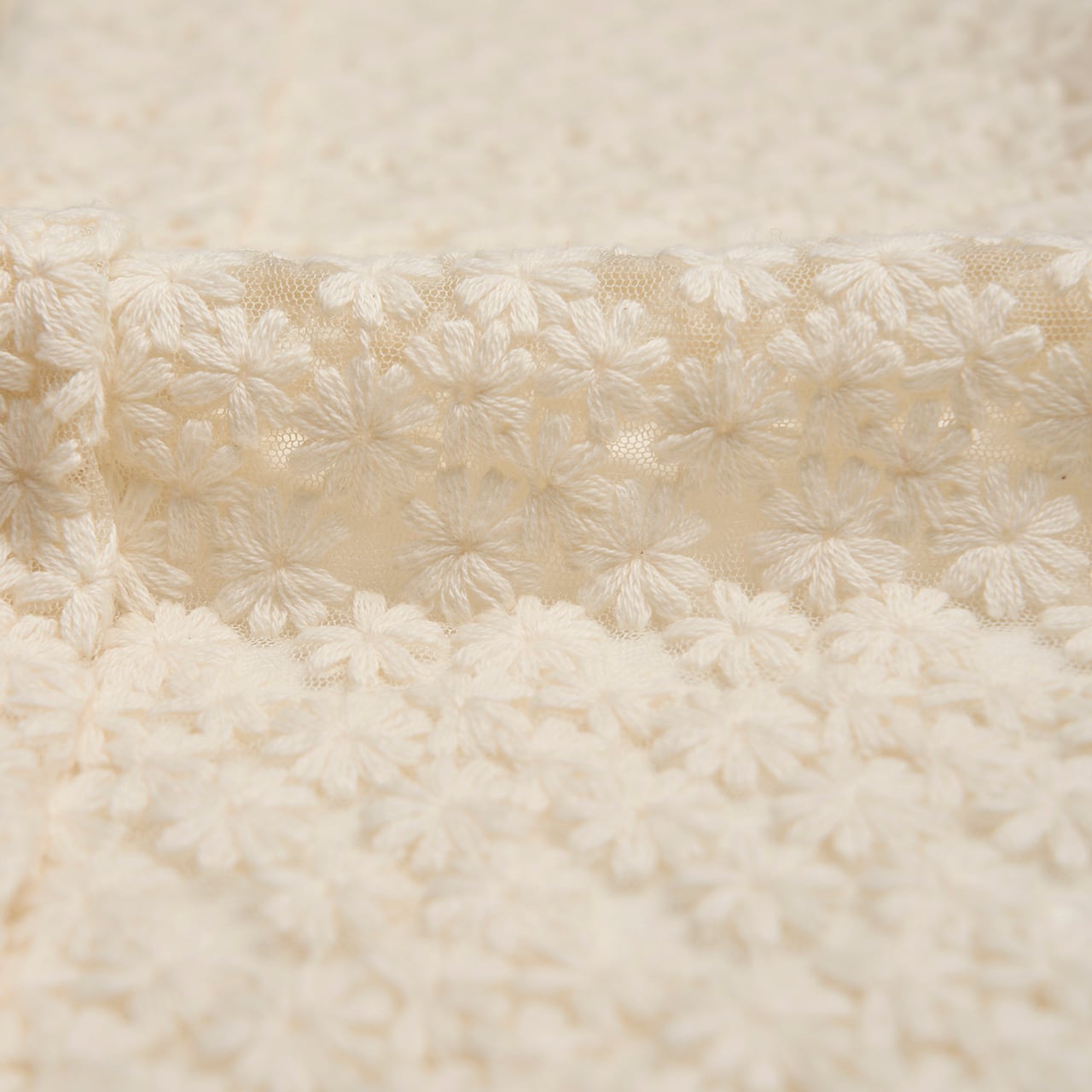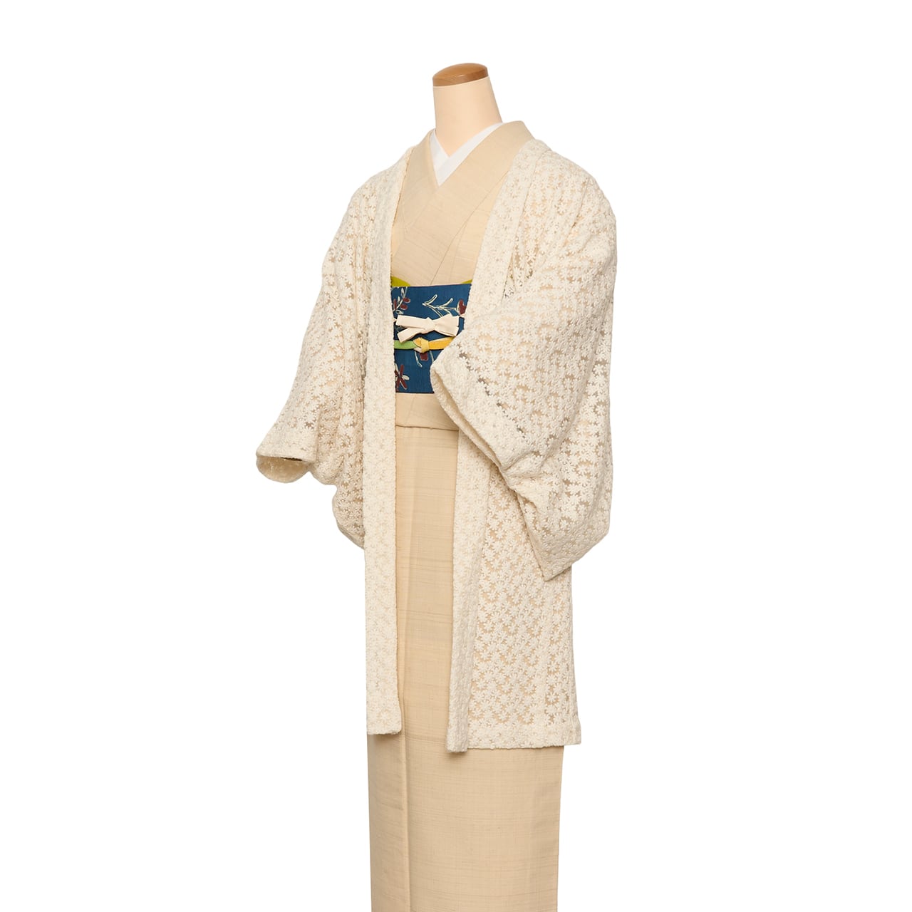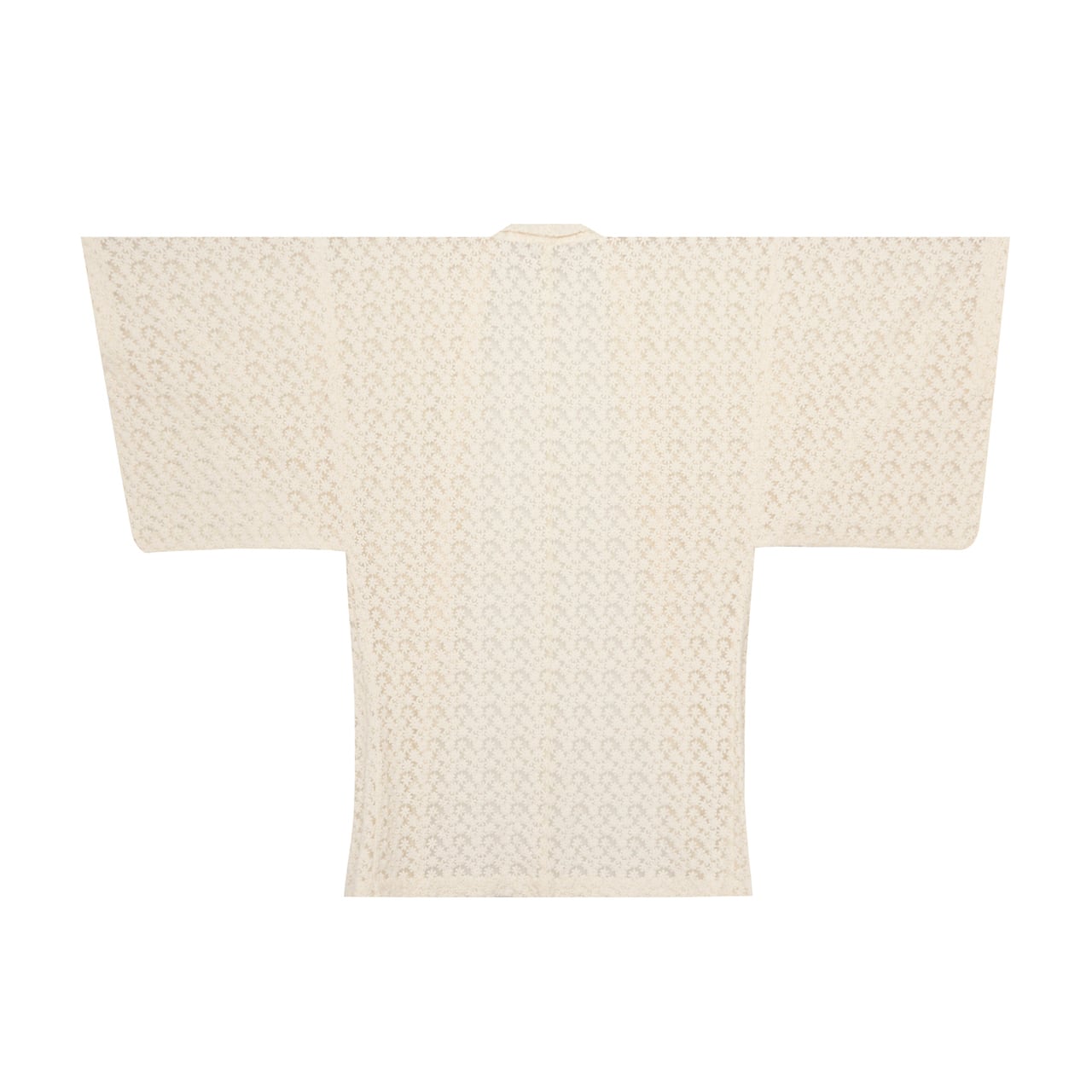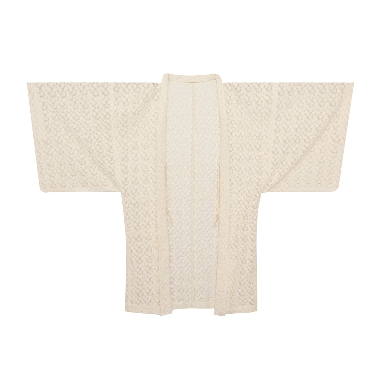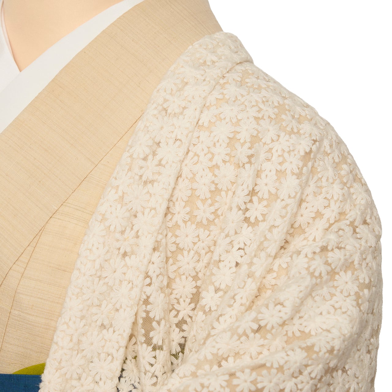 とても細かなハニーコーンのような模様のチュールレースの生地に、マーガレットのような形の小さなお花の刺繍のようなレースが織り込まれた、ほっこりとした雰囲気でありながら適度な透け感のある、とてもお洒落なちりよけの羽織です。