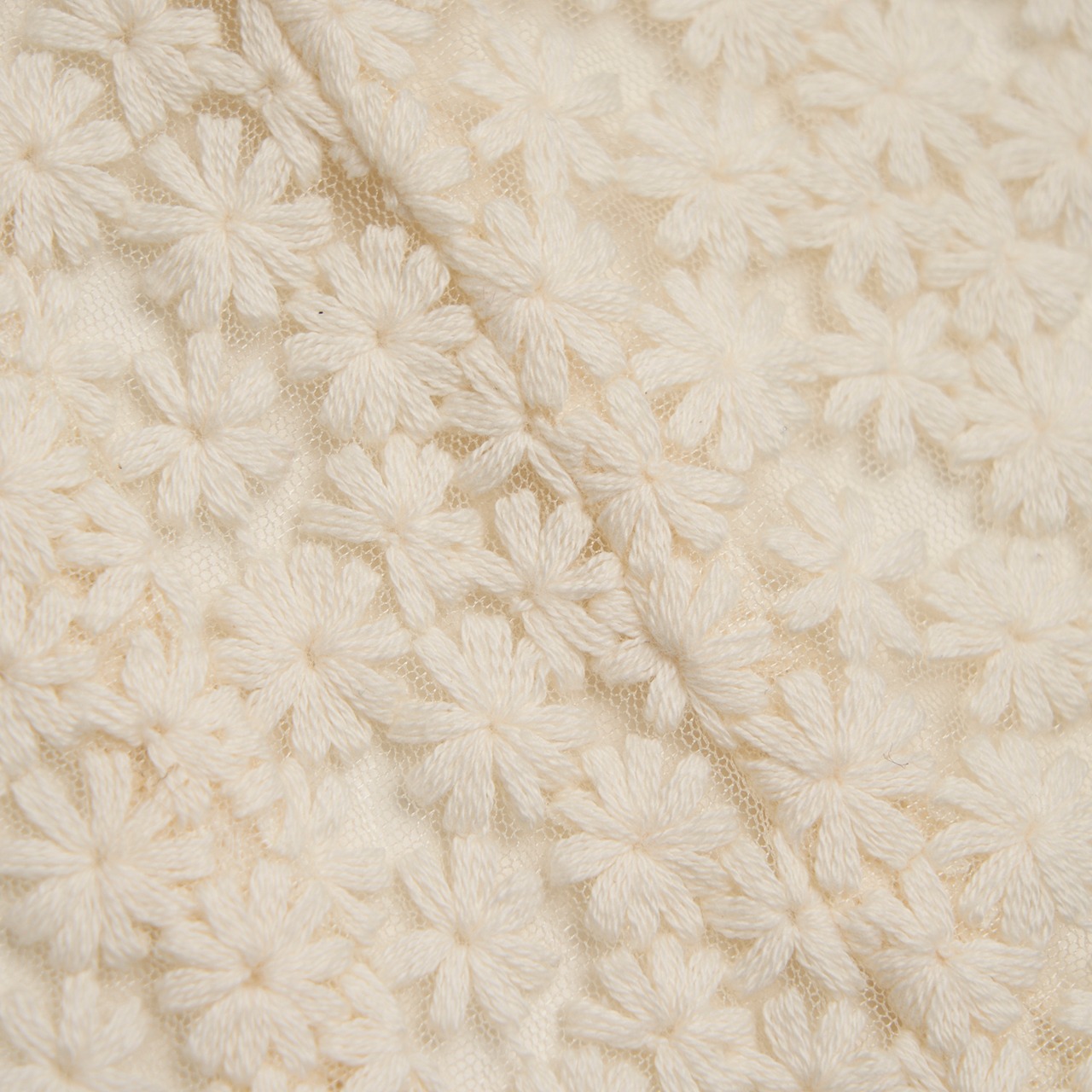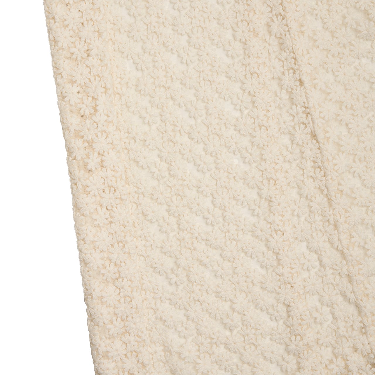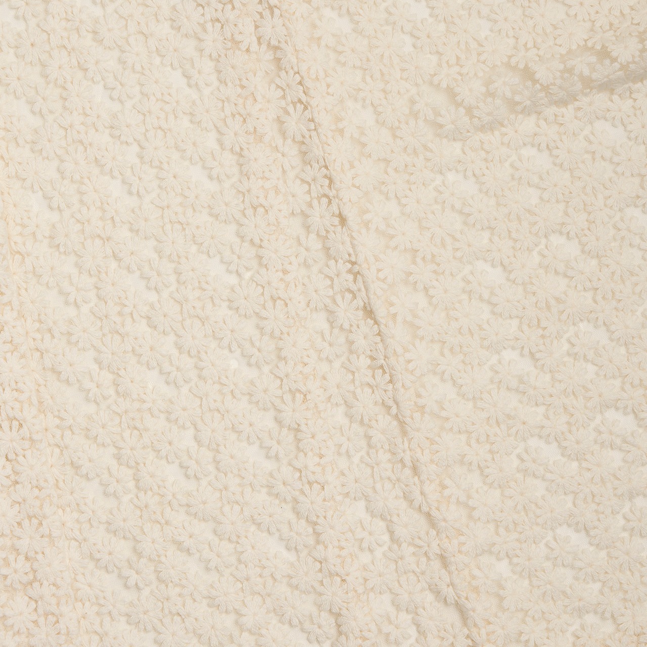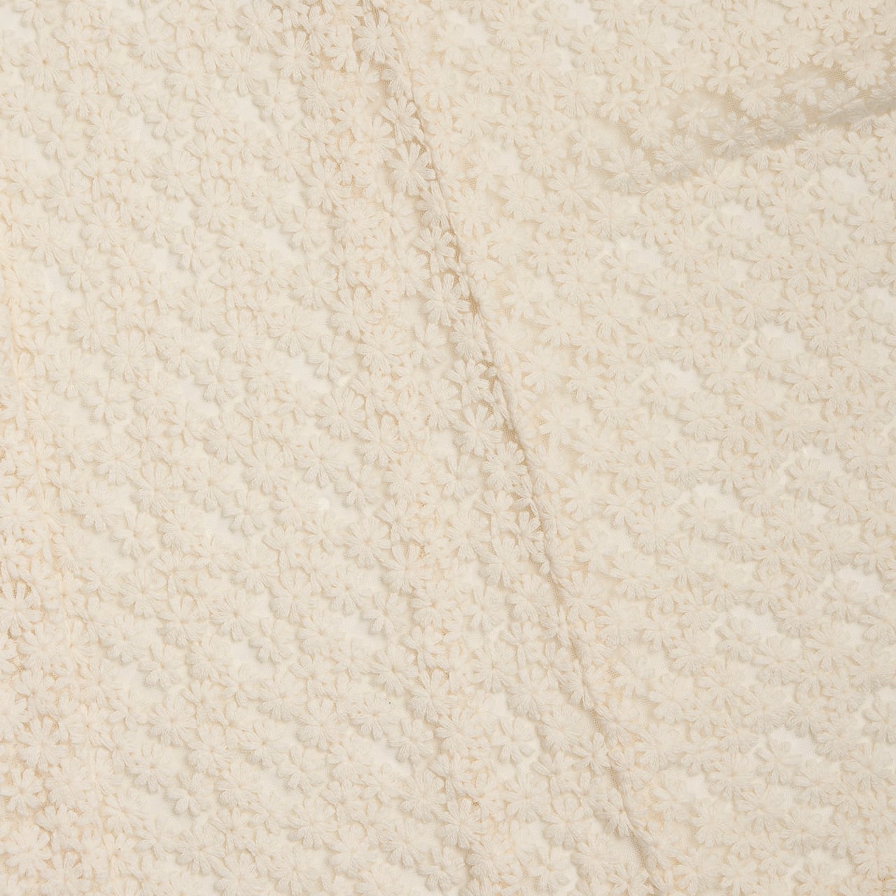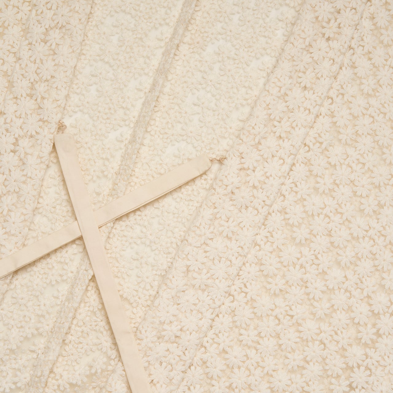 とても細かなハニーコーンのような模様のチュールレースの生地に、マーガレットのような形の小さなお花の刺繍のようなレースが織り込まれた、ほっこりとした雰囲気でありながら適度な透け感のある、とてもお洒落なちりよけの羽織です。