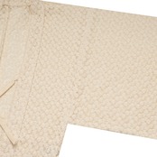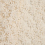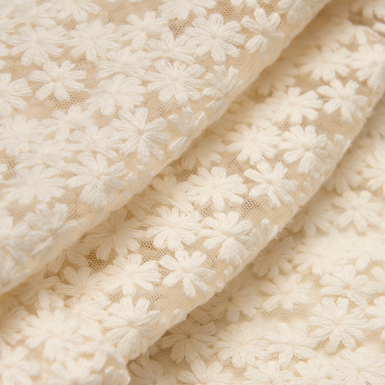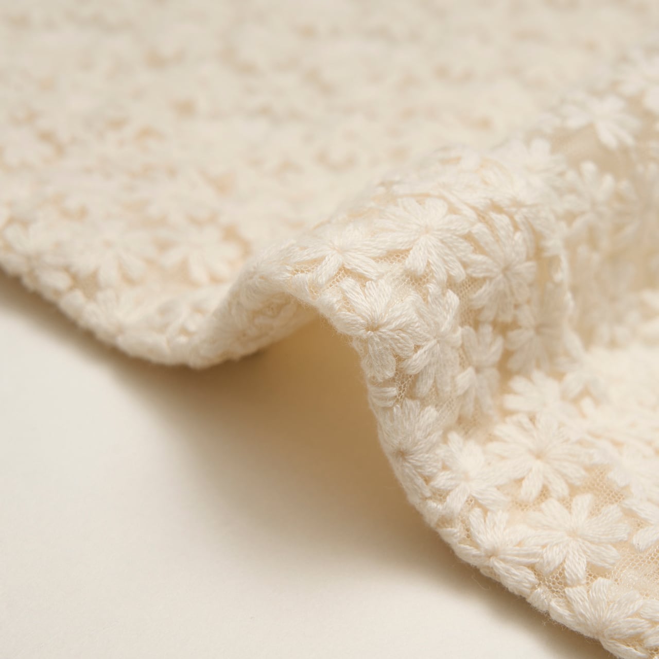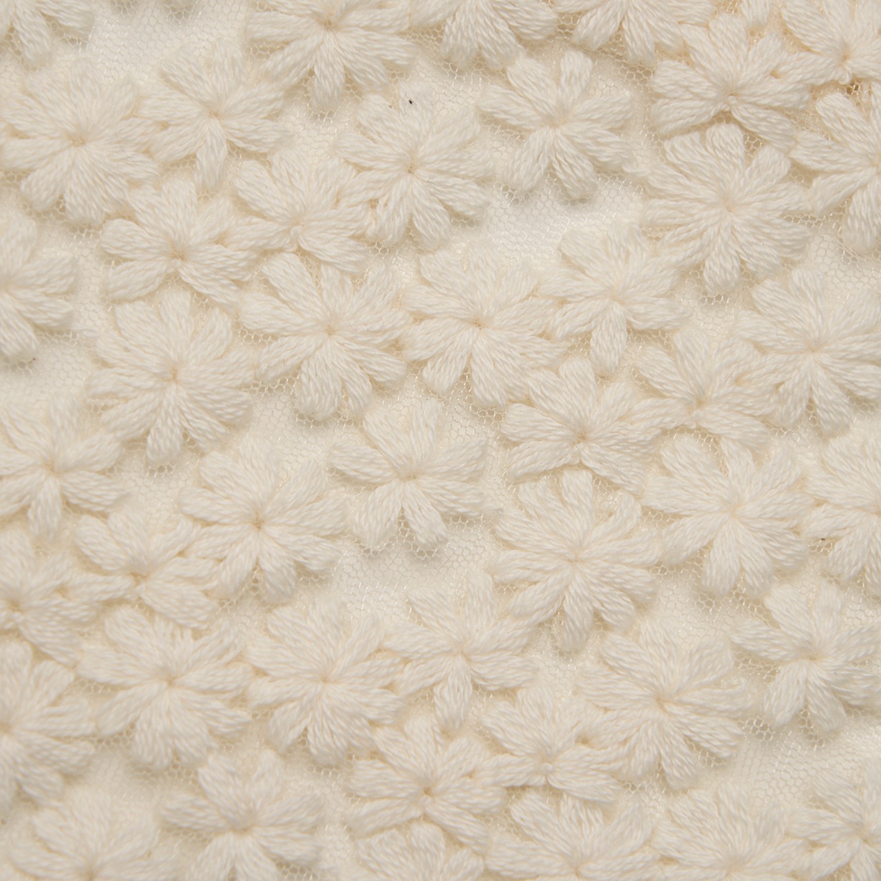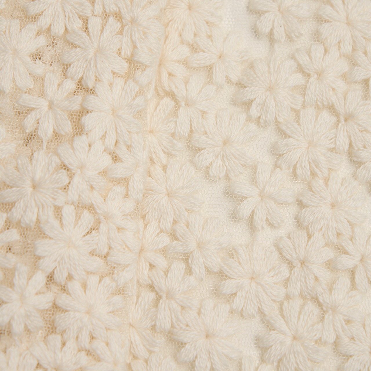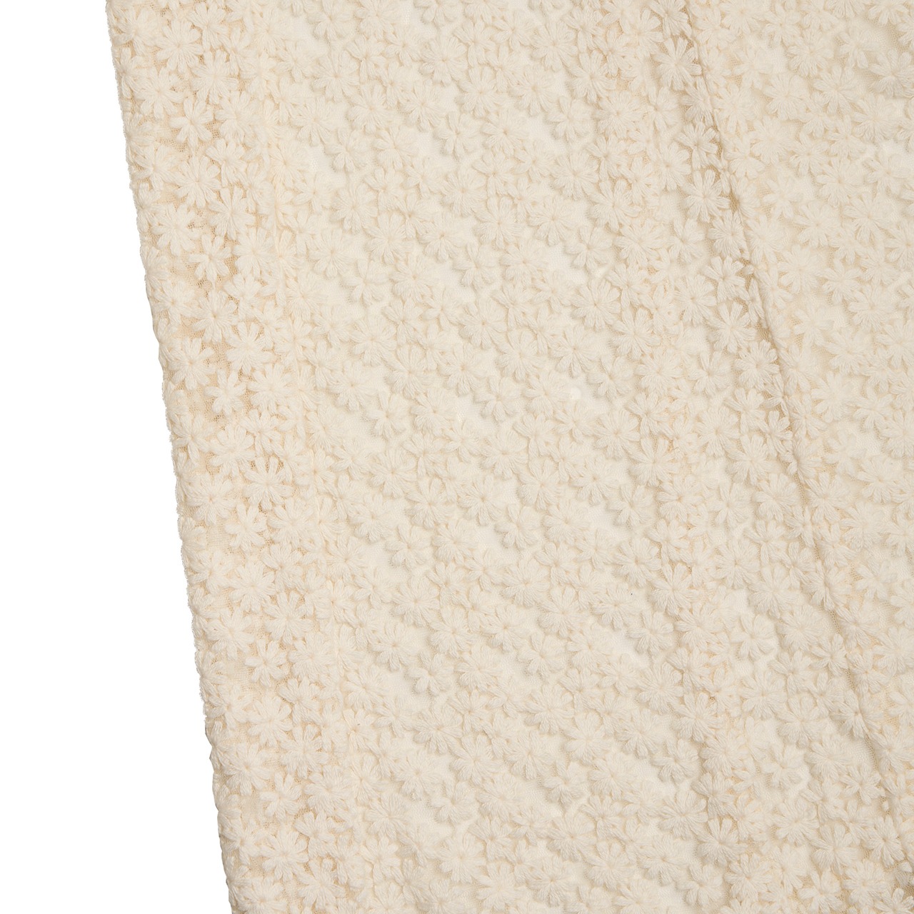 とても細かなハニーコーンのような模様のチュールレースの生地に、マーガレットのような形の小さなお花の刺繍のようなレースが織り込まれた、ほっこりとした雰囲気でありながら適度な透け感のある、とてもお洒落なちりよけの羽織です。