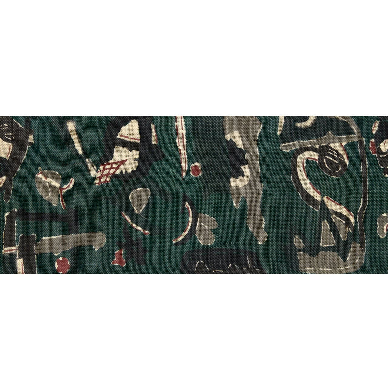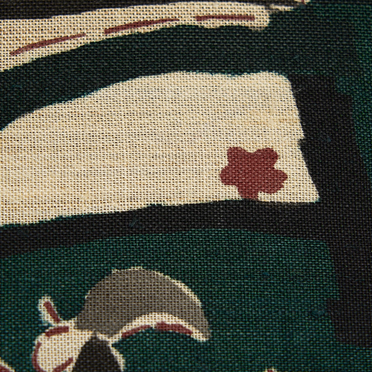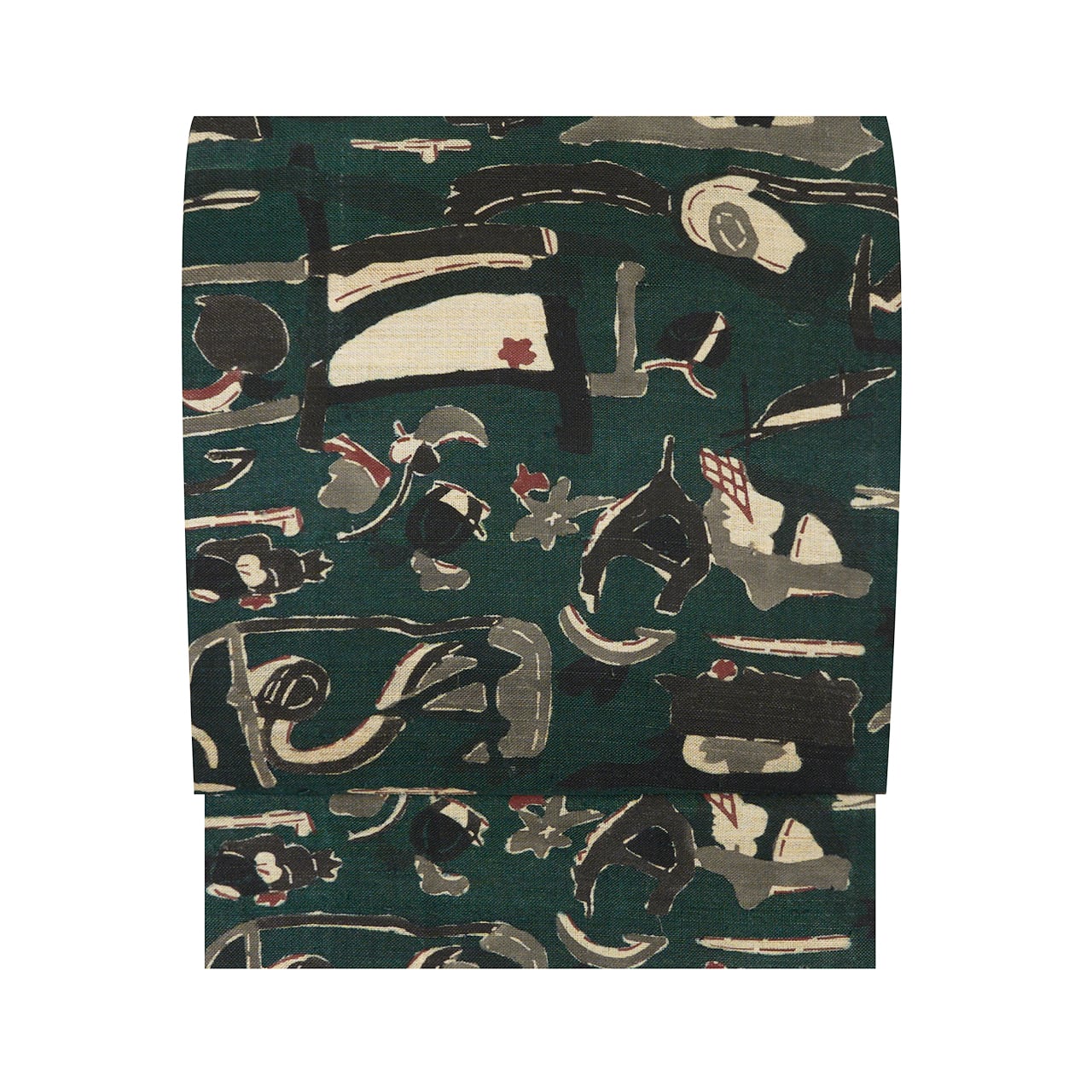 緯糸にざっくりとした節のある座繰りの紬地が藍味のある濃い緑・鉄色に染められ、いろいろな形をしたモチーフが、鈍色や栗皮茶色、黒、灰白色などの顔料で染められ、シックな色使いながらもとても楽しい雰囲気となった、添田敏子さんの型絵染の二部式の九寸名古屋帯の作品です。