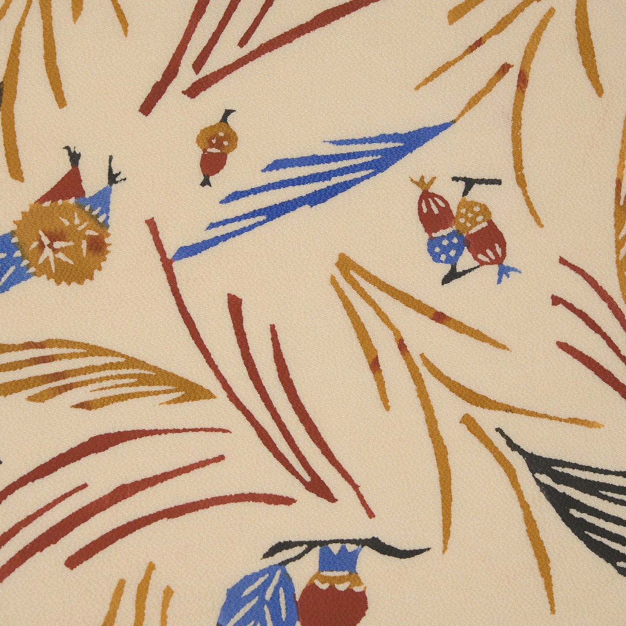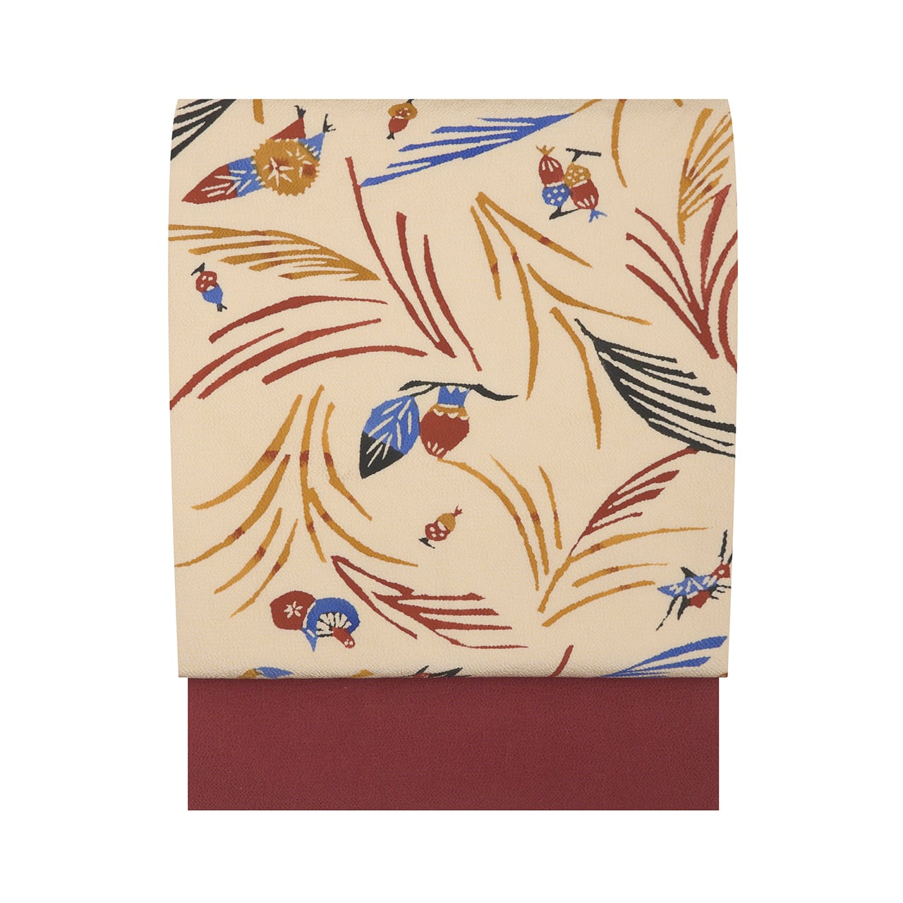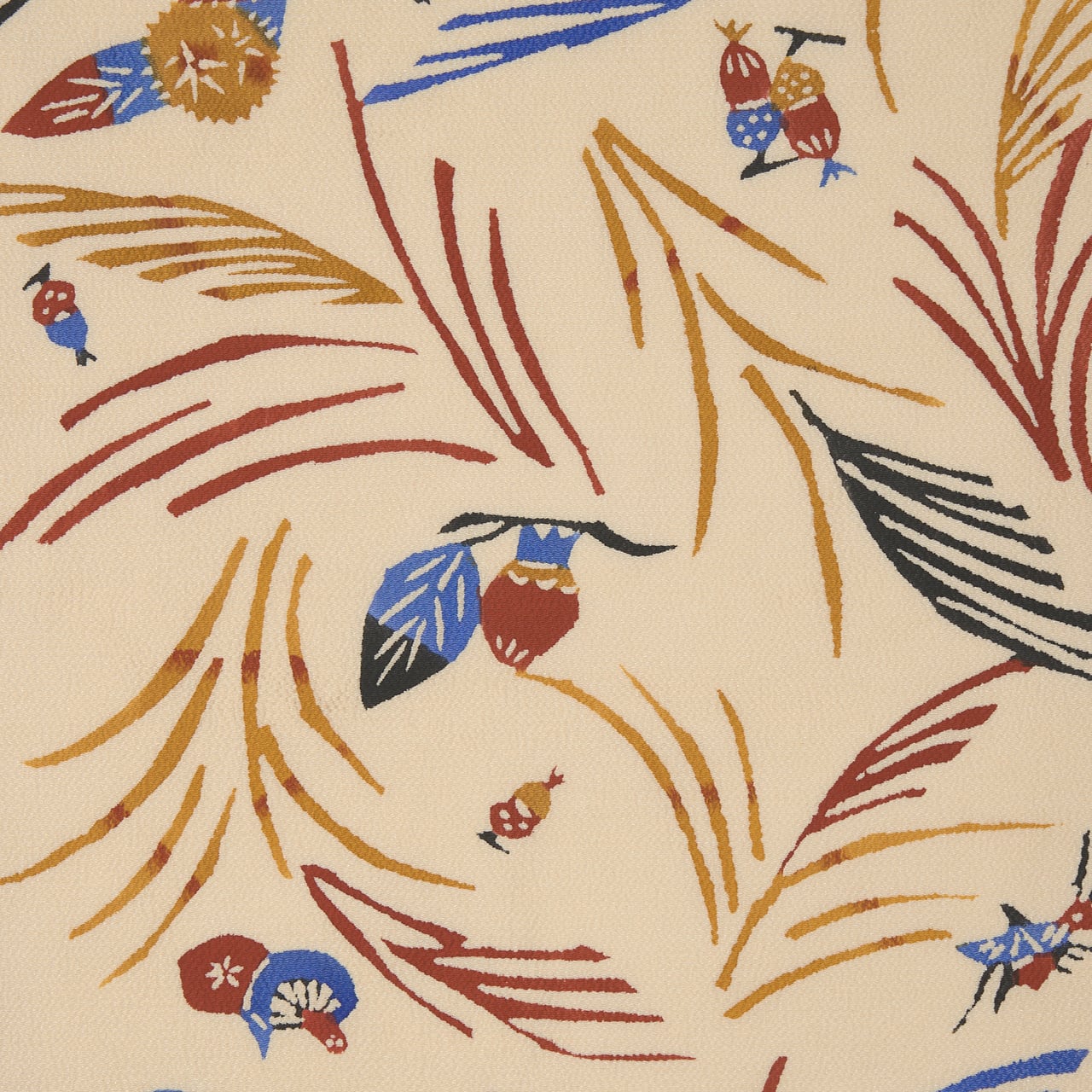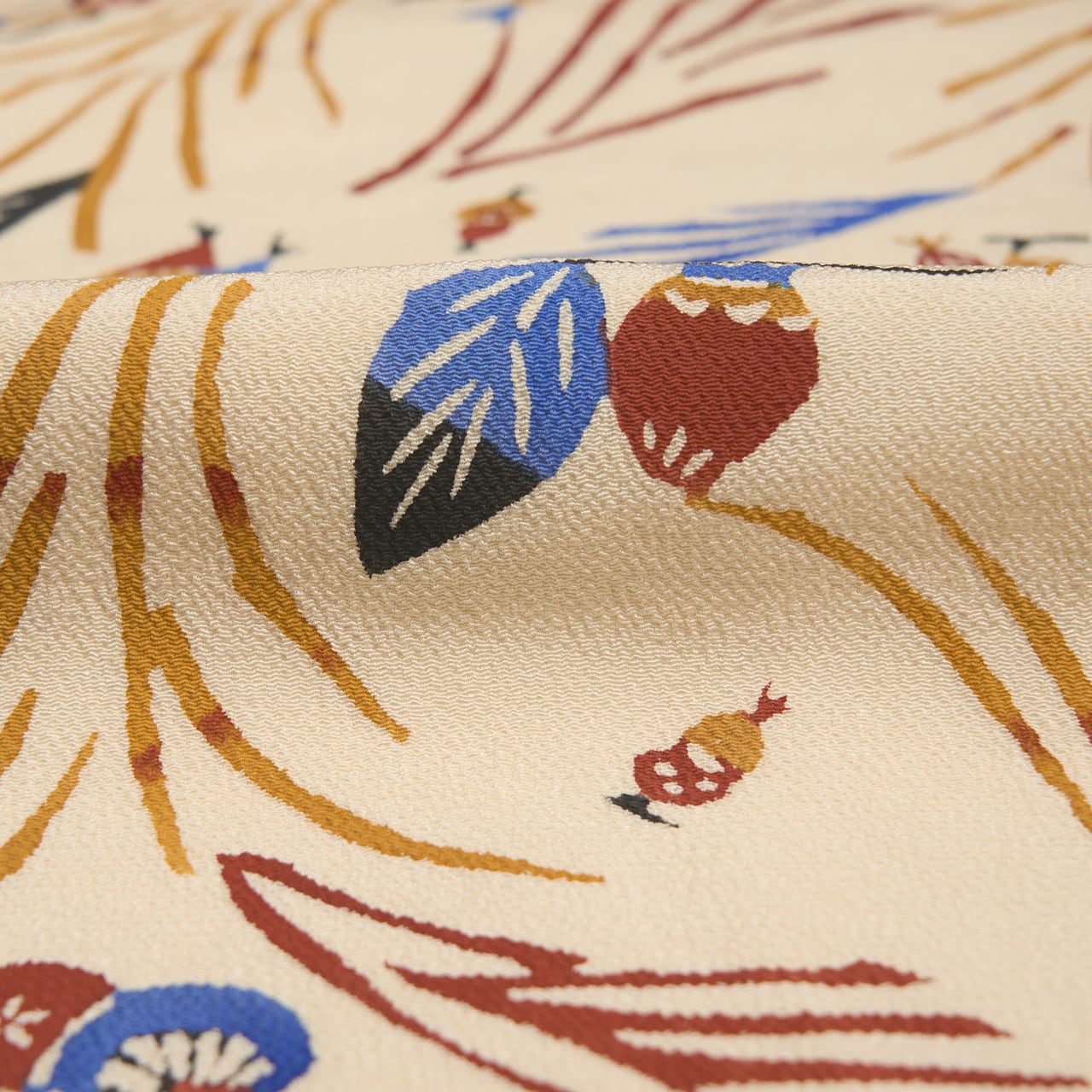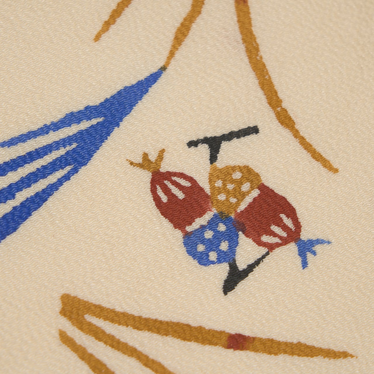 少しシボのあるざらっとした質感の象牙色のちりめんの生地に、風になびくようなススキの穂と、その間にキノコやドングリ、栗、柿の実のような木の実と、バッタやトンボなどの昆虫がいる様子が型絵染で染められた、とても楽しいデザインの九寸名古屋帯です。