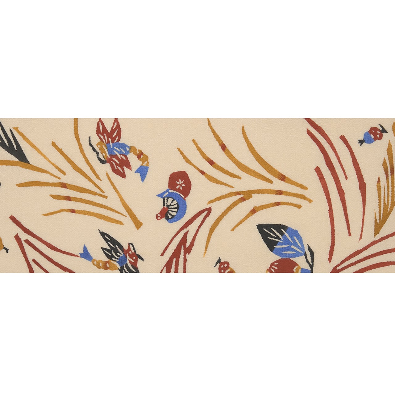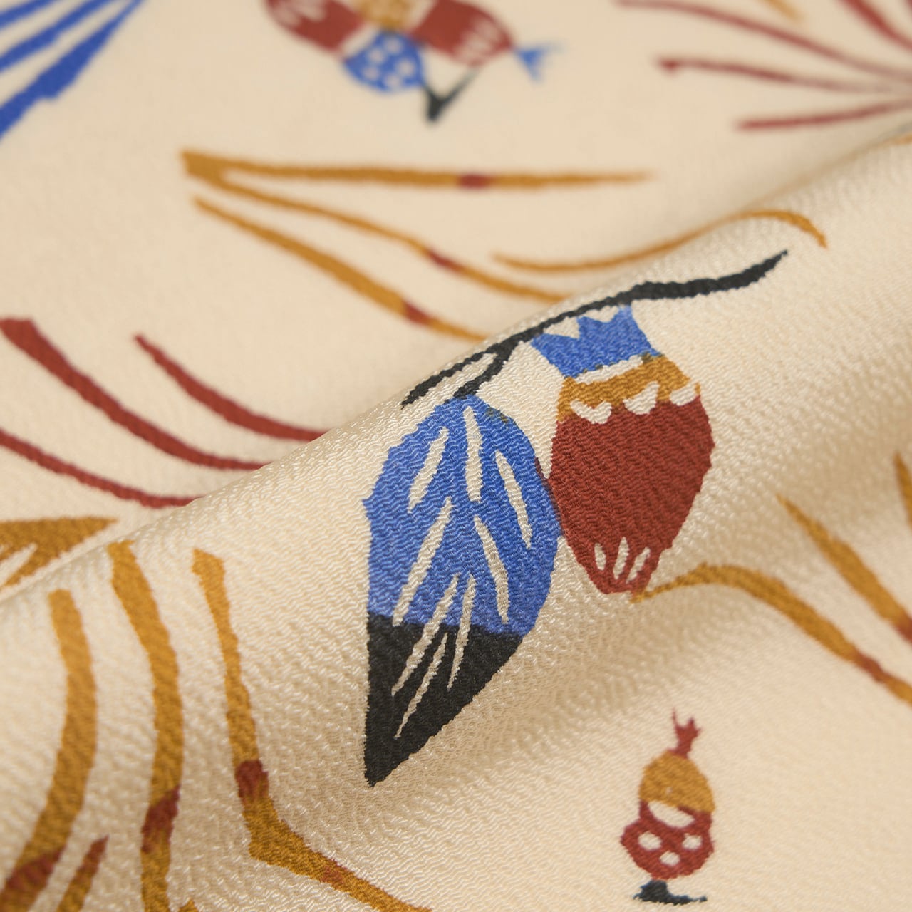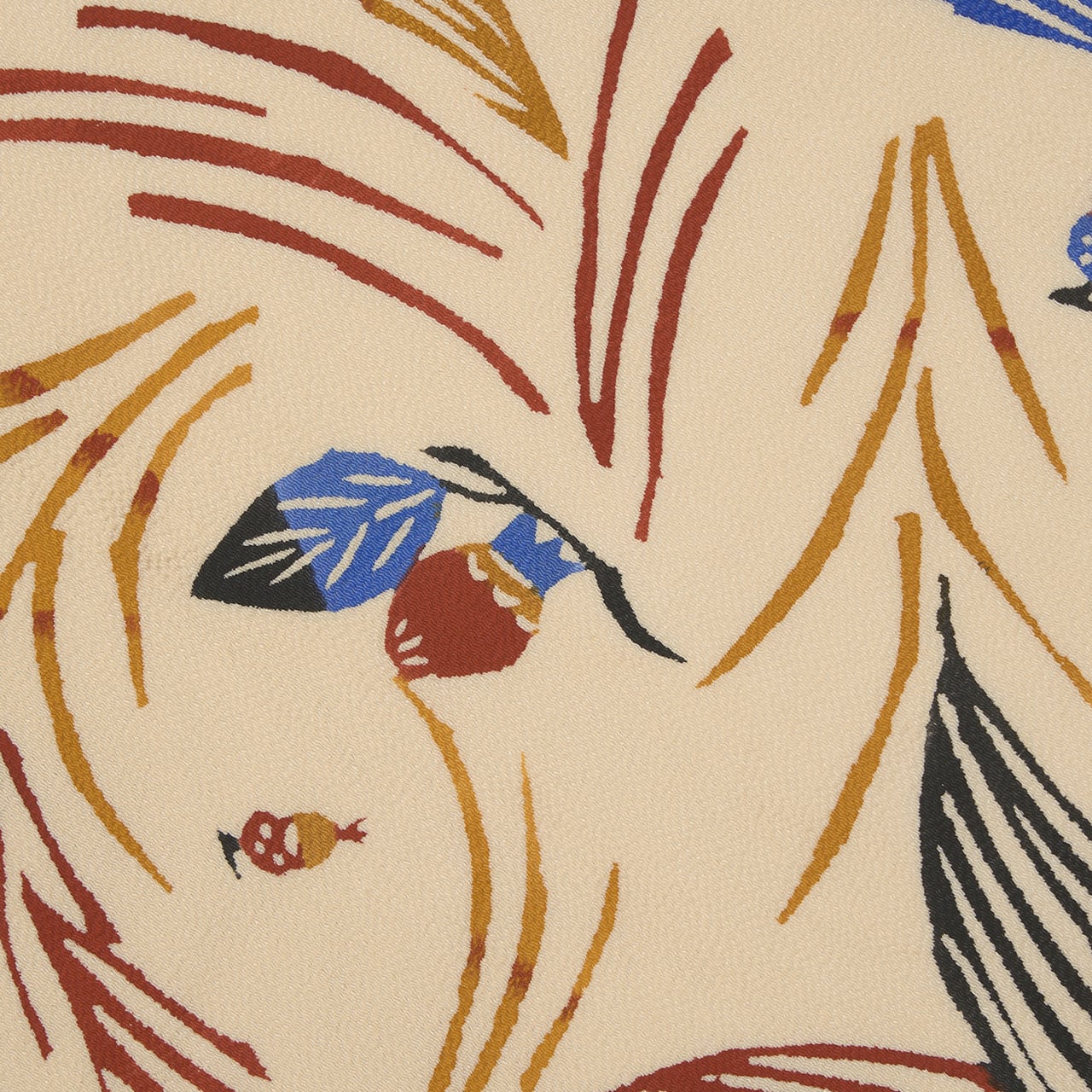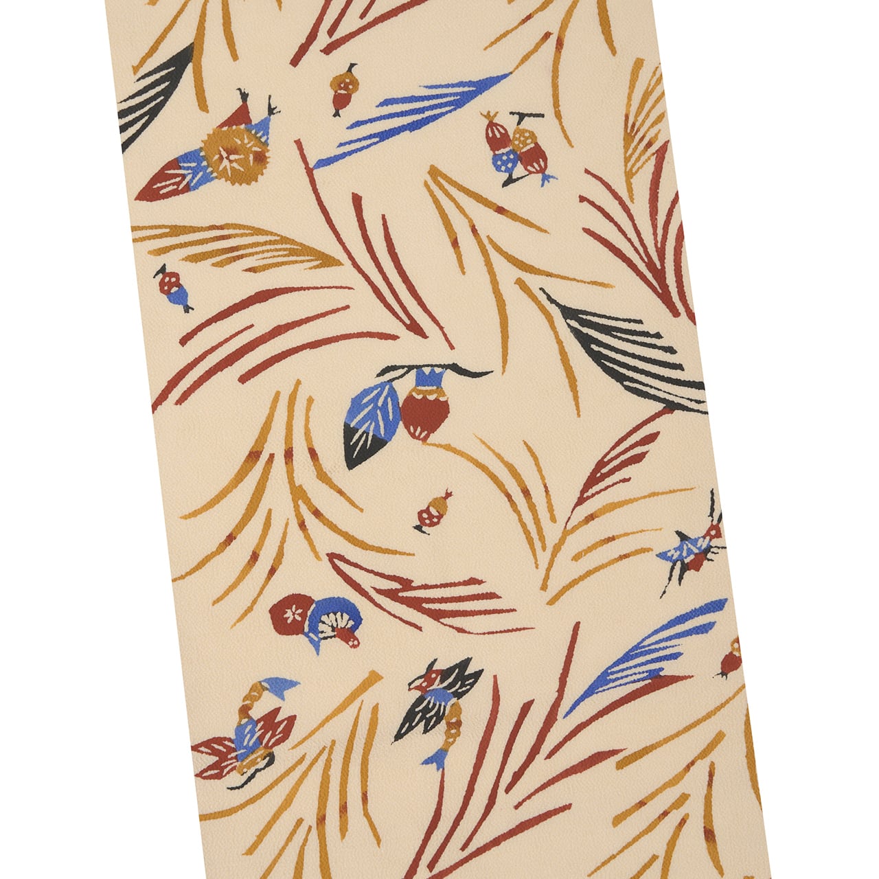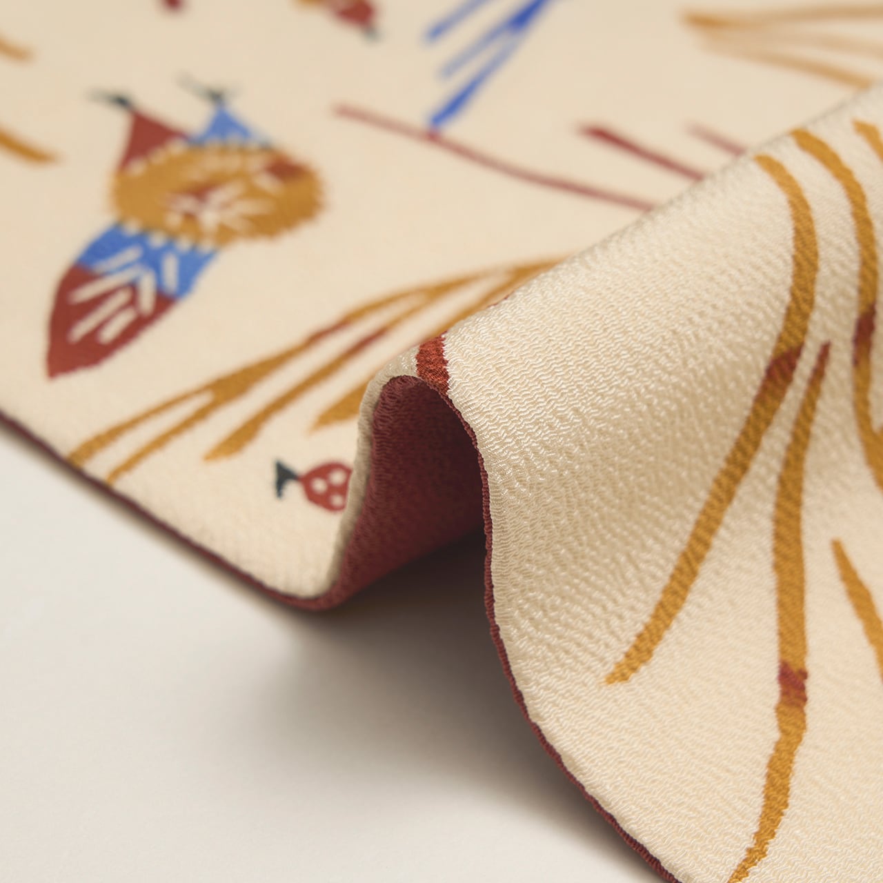 少しシボのあるざらっとした質感の象牙色のちりめんの生地に、風になびくようなススキの穂と、その間にキノコやドングリ、栗、柿の実のような木の実と、バッタやトンボなどの昆虫がいる様子が型絵染で染められた、とても楽しいデザインの九寸名古屋帯です。